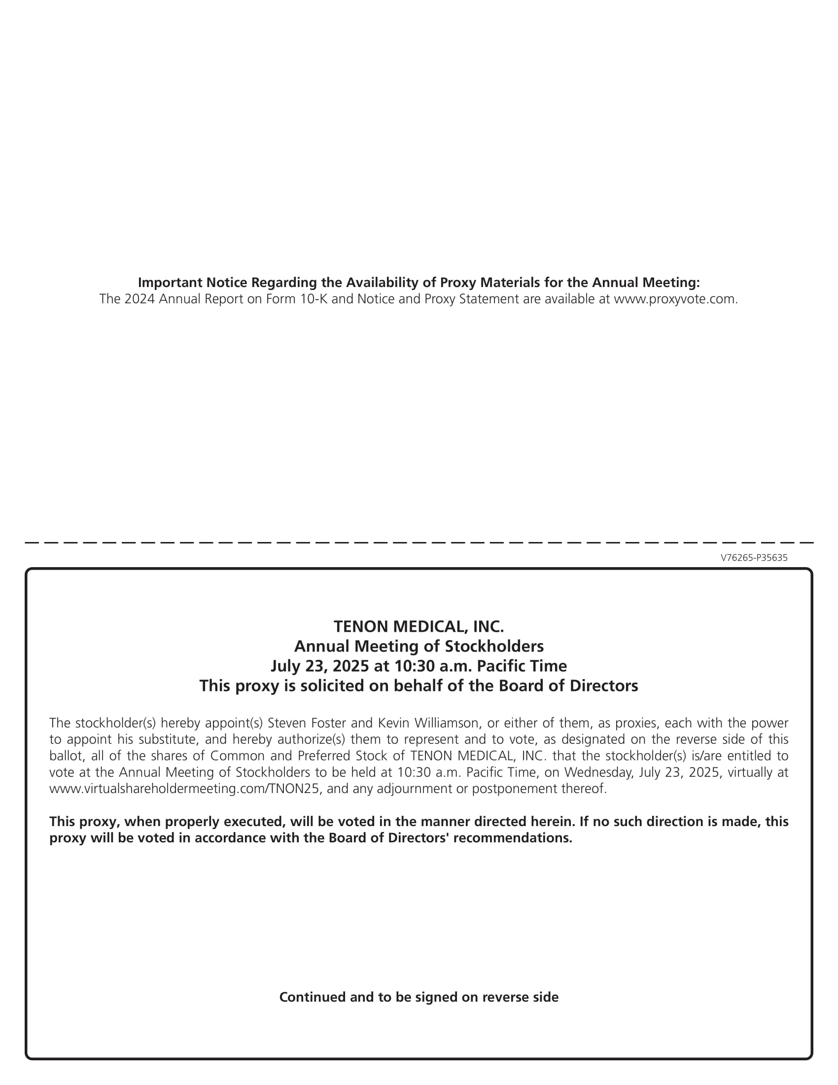 Important Notice Regarding the Availability of Proxy Materials for the Annual Meeting: The 2024 Annual Report on Form 10-K and Notice and Proxy Statement are available at www.proxyvote.com. V76265-P35635 TENON MEDICAL, INC. Annual Meeting of Stockholders July 23, 2025 at 10:30 a.m. Pacific Time This proxy is solicited on behalf of the Board of Directors The stockholder(s) hereby appoint(s) Steven Foster and Kevin Williamson, or either of them, as proxies, each with the power to appoint his substitute, and hereby authorize(s) them to represent and to vote, as designated on the reverse side of this ballot, all of the shares of Common and Preferred Stock of TENON MEDICAL, INC. that the stockholder(s) is/are entitled to vote at the Annual Meeting of Stockholders to be held at 10:30 a.m. Pacific Time, on Wednesday, July 23, 2025, virtually at www.virtualshareholdermeeting.com/TNON25, and any adjournment or postponement thereof. This proxy, when properly executed, will be voted in the manner directed herein. If no such direction is made, this proxy will be voted in accordance with the Board of Directors' recommendations. Continued and to be signed on reverse side