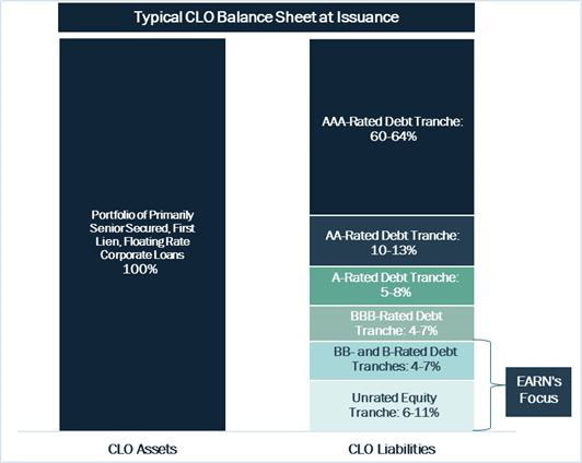A CLO finances its initial purchase of a portfolio of assets via the issuance of CLO debt and equity tranches, with the debt tranches typically carrying floating-rate coupons. CLO debt tranches typically carry ratings at issuance ranging from “AAA” (or its equivalent) at the most senior level to “BB-” or “B-” (or its equivalent), which are below investment grade, at the junior level, by Moody’s Investors Service, Inc. (“Moody’s”), S&P Global Ratings (“S&P”) and/or Fitch Ratings, Inc. (“Fitch”). The coupon on CLO debt tranches is typically lowest at the AAA-level and generally increases at each level down the ratings scale. CLO equity tranches are unrated, and at issuance typically represent approximately 6% to 11% of a CLO’s capital structure. The diagram below is for illustrative purposes only and highlights a structure intended to depict a typical CLO. Some CLOs also include a B-rated debt tranche (in which the Fund may invest), and the structure of CLOs in which the Fund invests may otherwise vary from this example. The left column represents the CLO’s assets, which support the liabilities and equity in the right column. The right column shows the various classes of debt and equity issued by the illustrative CLO in order of seniority as to relative rights to receive payments from the assets. The ranges appearing directly below the rating of each class represent the percentages that such classes typically comprise, at issuance, of the overall “capital structure” (i.e., total debt and equity issued by the CLO).