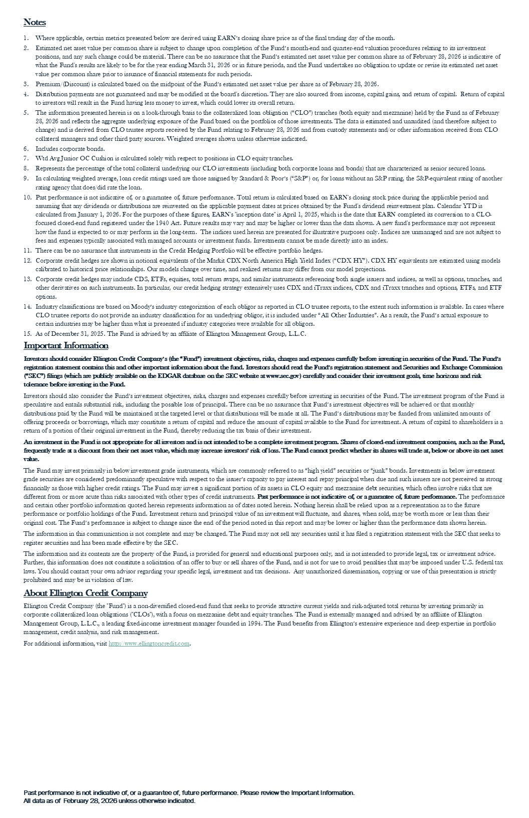 Past performance is not indicative of, or a guarantee of, future performance. Please review the Important Information. All data as of February 28, 2026 unless otherwise indicated. Notes 1. Where applicable, certain metrics presented below are derived using EARN’s closing share price as of the final trading day of th e month. 2. Estimated net asset value per common share is subject to change upon completion of the Fund’s month - end and quarter - end valuatio n procedures relating to its investment positions, and any such change could be material. There can be no assurance that the Fund’s estimated net asset value per com mon share as of February 28, 2026 is indicative of what the Fund's results are likely to be for the year ending March 31, 2026 or in future periods, and the Fund undertakes no obl igation to update or revise its estimated net asset value per common share prior to issuance of financial statements for such periods. 3. Premium/(Discount) is calculated based on the midpoint of the Fund’s estimated net asset value per share as of February 28, 2 026 . 4. Distribution payments are not guaranteed and may be modified at the board's discretion. They are also sourced from income, ca pit al gains, and return of capital. Return of capital to investors will result in the Fund having less money to invest, which could lower its overall return. 5. The information presented herein is on a look - through basis to the collateralized loan obligation (“CLO”) tranches (both equity and mezzanine) held by the Fund as of February 28, 2026 and reflects the aggregate underlying exposure of the Fund based on the portfolios of those investments. The data is es timated and unaudited (and therefore subject to change) and is derived from CLO trustee reports received by the Fund relating to February 28, 2026 and from custody statement s a nd/or other information received from CLO collateral managers and other third party sources. Weighted averages shown unless otherwise indicated. 6. Includes corporate bonds. 7. Wtd Avg Junior OC Cushion is calculated solely with respect to positions in CLO equity tranches. 8. Represents the percentage of the total collateral underlying our CLO investments (including both corporate loans and bonds) t hat are characterized as senior secured loans. 9. In calculating weighted average, loan credit ratings used are those assigned by Standard & Poor’s (“S&P”) or, for loans witho ut an S&P rating, the S&P - equivalent rating of another rating agency that does/did rate the loan. 10. Past performance is not indicative of, or a guarantee of, future performance. Total return is calculated based on EARN's clos ing stock price during the applicable period and assuming that any dividends or distributions are reinvested on the applicable payment dates at prices obtained by the Fund's div idend reinvestment plan. Calendar YTD is calculated from January 1, 2026. For the purposes of these figures, EARN's "inception date" is April 1, 2025, which is the da te that EARN completed its conversion to a CLO - focused closed - end fund registered under the 1940 Act. Future results may vary and may be higher or lower than the data shown. A new fund's performance may not represent how the fund is expected to or may perform in the long - term. The indices used herein are presented for illustrative purposes on ly. Indices are unmanaged and are not subject to fees and expenses typically associated with managed accounts or investment funds. Investments cannot be made directly into an in dex. 11. There can be no assurance that instruments in the Credit Hedging Portfolio will be effective portfolio hedges. 12. Corporate credit hedges are shown in notional equivalents of the Markit CDX North America High Yield Index (“CDX HY”). CDX HY eq uivalents are estimated using models calibrated to historical price relationships. Our models change over time, and realized returns may differ from our model pro jec tions. 13. Corporate credit hedges may include CDS, ETFs, equities, total return swaps, and similar instruments referencing both single iss uers and indices, as well as options, tranches, and other derivatives on such instruments. In particular, our credit hedging strategy extensively uses CDX and iTraxx indices, CDX and iTraxx tranches and options, ETFs, and ETF options. 14. Industry classifications are based on Moody’s industry categorization of each obligor as reported in CLO trustee reports, to the extent such information is available. In cases where CLO trustee reports do not provide an industry classification for an underlying obligor, it is included under “All Other Indu str ies”. As a result, the Fund’s actual exposure to certain industries may be higher than what is presented if industry categories were available for all obligors. 15. As of December 31, 2025. The Fund is advised by an affiliate of Ellington Management Group, L.L.C. Important Information Investors should consider Ellington Credit Company’s (the “Fund”) investment objectives, risks, charges and expenses carefull y b efore investing in securities of the Fund. The Fund’s registration statement contains this and other important information about the fund. Investors should read the Fund’s registr ati on statement and Securities and Exchange Commission (“SEC”) filings (which are publicly available on the EDGAR database on the SEC website at www.sec.gov) carefully and consider th eir investment goals, time horizons and risk tolerance before investing in the Fund. Investors should also consider the Fund’s investment objectives, risks, charges and expenses carefully before investing in se cur ities of the Fund. The investment program of the Fund is speculative and entails substantial risk, including the possible loss of principal. There can be no assurance that Fund’s inv est ment objectives will be achieved or that monthly distributions paid by the Fund will be maintained at the targeted level 