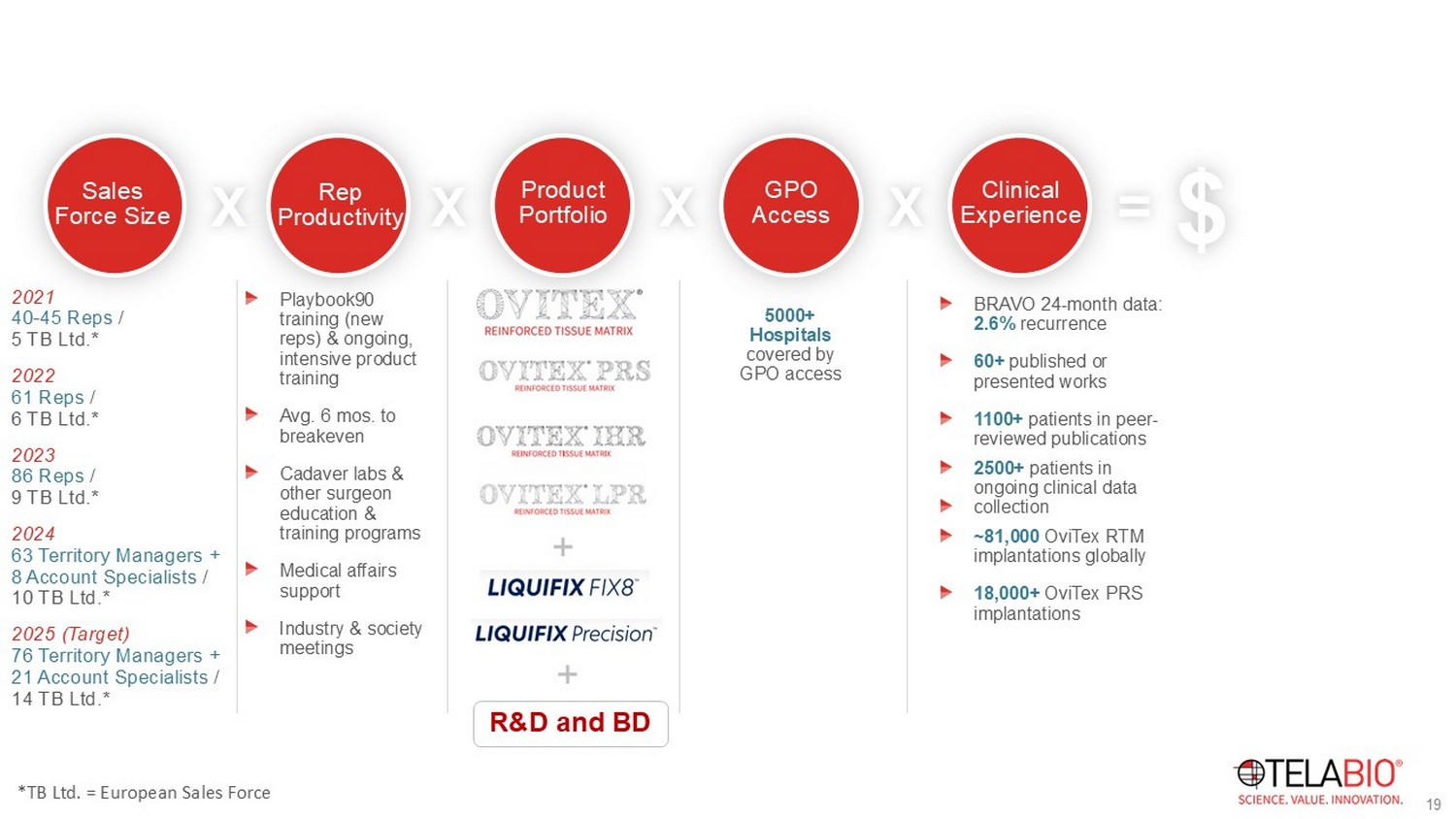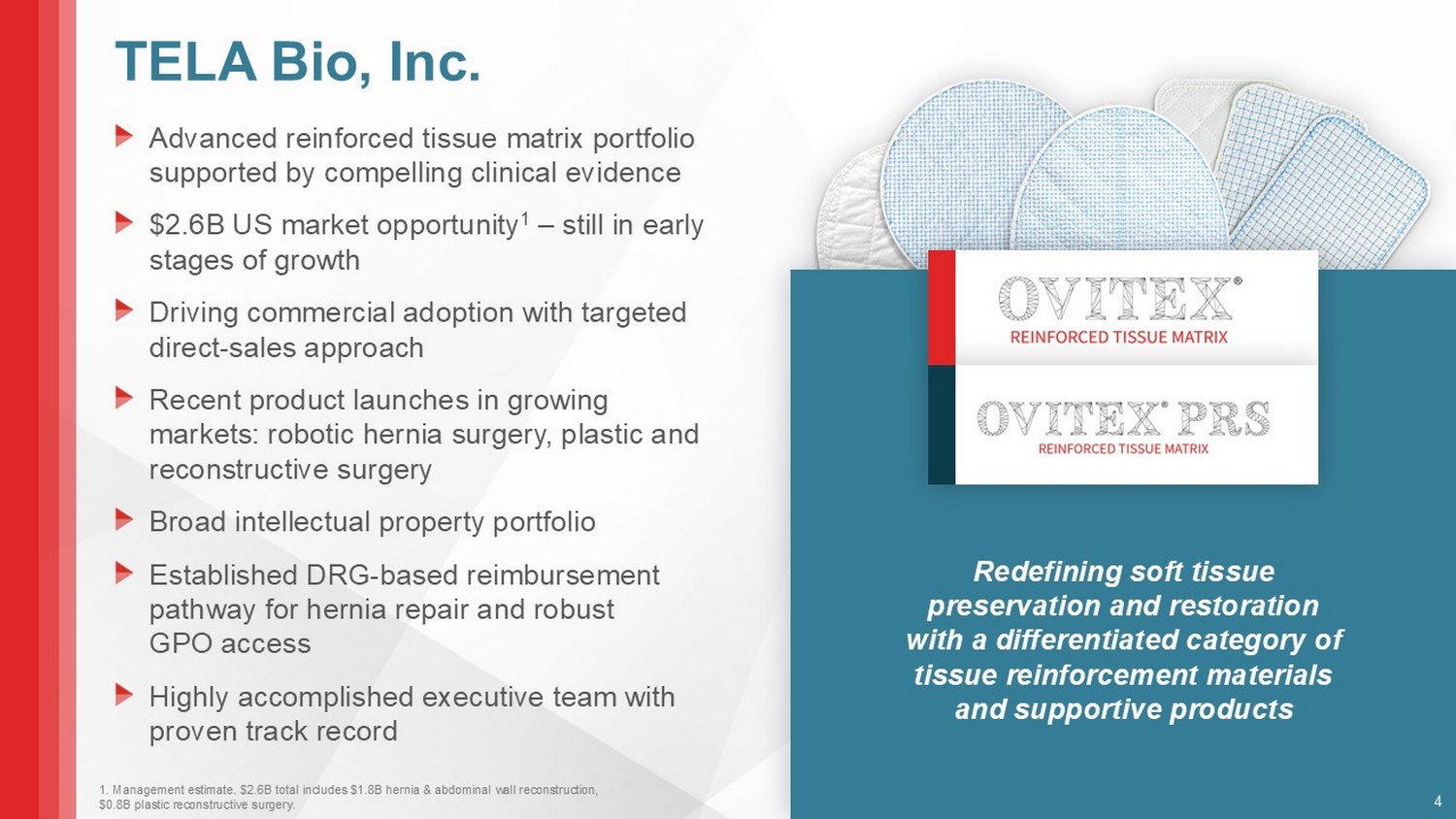 This presentation contains forward - looking statements within the meaning of The Private Securities Litigation Reform Act of 1995 . All statements other than statements of historical facts contained in this document, including but not limited to statements regarding possible or assu med future results of operations, business strategies, development plans, regulatory activities, market opportunity competitive position, potential growth oppo rtu nities, and the effects of competition, are forward - looking statements. These statements involve known and unknown risks, uncertainties and other important factors that may cause the actual results, performance or achievements of TELA Bio, Inc. (the “Company”) to be materially different from any future res ults, performance or achievements expressed or implied by the forward - looking statements. In some cases, you can identify forward - looking statements by terms such as “may,” “will,” “should,” “expect,” “plan,” “aim,” “anticipate,” “could,” “intend,” “target,” “project,” “contemplate,” “believe,” “e sti mate,” “predict,” “potential” or “continue” or the negative of these terms or other similar expressions. The forward - looking statements in this presentation are only predictio ns. The Company has based these forward - looking statements largely on its current expectations and projections about future events and financial trends th at it believes may affect the Company’s business, financial condition, and results of operations. These forward - looking statements speak only as of the date o f this presentation and are subject to a number of risks, uncertainties and assumptions, some of which cannot be predicted or quantified and some of whic h a re beyond the Company’s control, including, among others: the impact to our business from macroeconomic conditions, including recessionary concerns, ban king instability, increasing market interest rates, monetary policy changes, changes in trade policies, including tariffs and trade protection measures, a nd inflationary pressures, potentially impacting our ability to market our products; demand for our products related to changes in volumes or frequency of surgical procedures, including due to outbreak of illness or disease, cybersecurity events impacting hospital operations, potential hospital closures, labor an d hospital staffing shortages, supply chain disruptions to critical surgical and hospital supplies, pricing pressures or any other applicable adverse health car e economic factors; our ability to achieve or sustain profitability; our ability to gain market acceptance for our products and to accurately forecast and meet cus tomer demand; our ability to compete successfully; that data from earlier studies related to our products and interim data from ongoing studies may not be re plicated in later studies or indicative of future data; that data obtained from clinical studies using our product may not be indicative of outcomes in ot her surgical settings; our ability to enhance our product offerings; product development and manufacturing problems; capacity constraints or delays in production o f o ur products; maintenance of coverage and adequate reimbursement for procedures using our products; and product defects or failures. These and other ri sks and uncertainties are described more fully in the "Risk Factors" section and elsewhere in the Company's filings with the U.S. Securities and Exchan ge Commission (the “SEC”) and available at www.sec.gov . You should not rely on these forward - looking statements as predictions of future events. The events and circumstances reflecte d in the Company’s forward - looking statements may not be achieved or occur, and actual results could differ materially from those pro jected in the forward - looking statements. Moreover, the Company operates in a dynamic industry and economy. New risk factors and uncertainties may emerge f rom time to time, and it is not possible for management to predict all risk factors and uncertainties that the Company may face. Except as required by ap pli cable law, we do not plan to publicly update or revise any forward - looking statements contained herein, whether as a result of any new information, future ev ents, changed circumstances or otherwise. 2 Forward Looking Statements