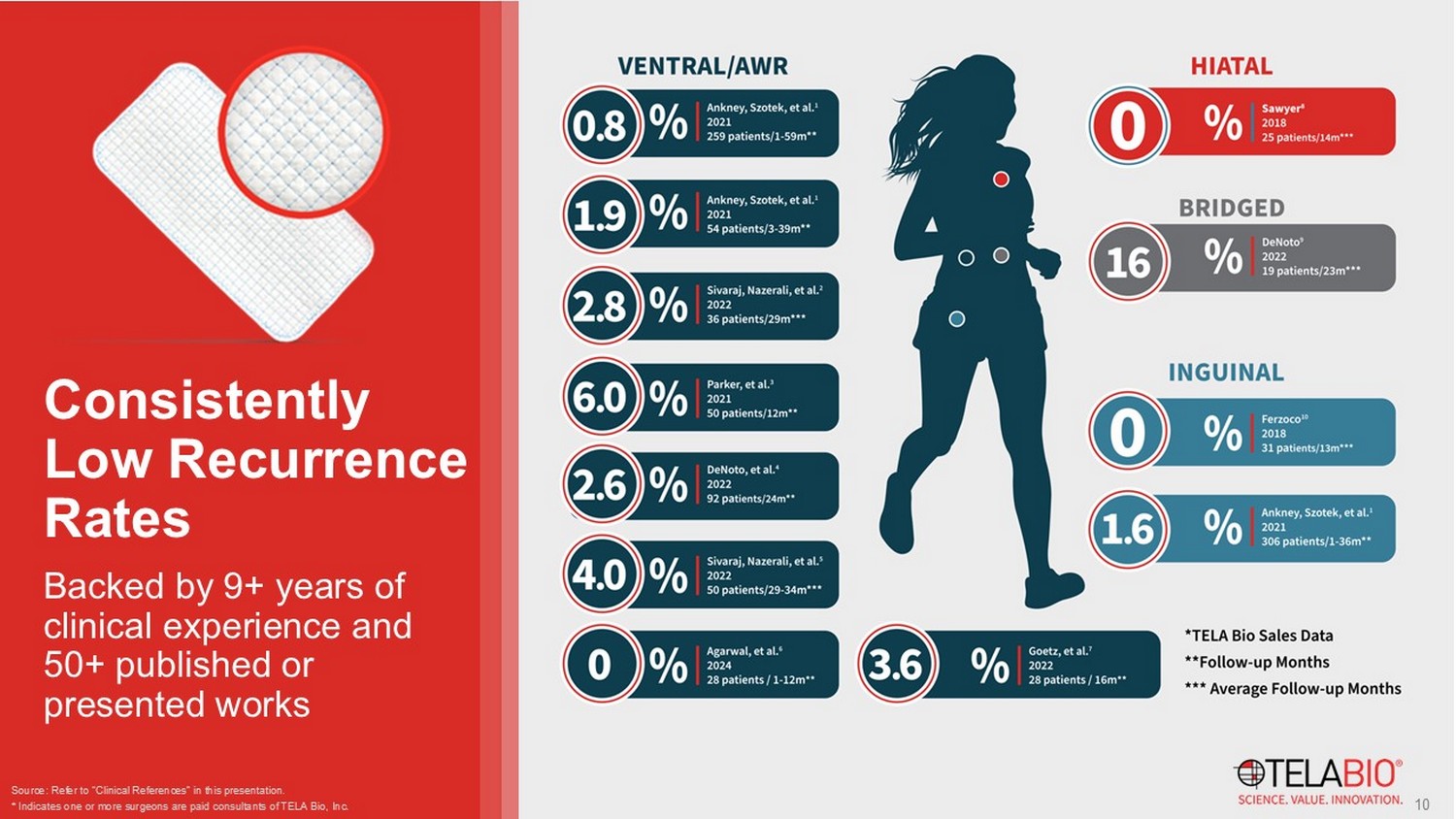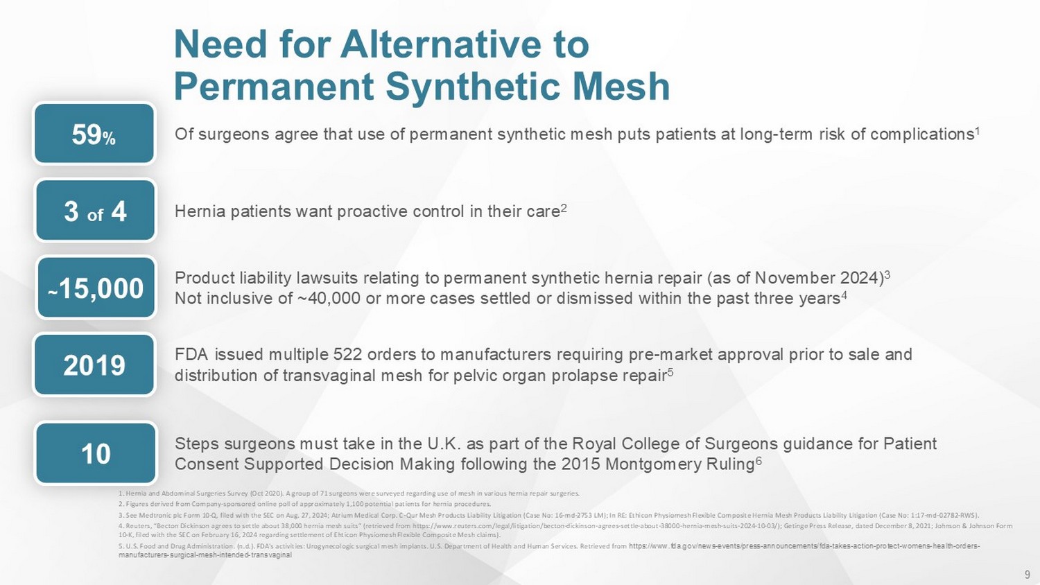 9 1. Hernia and Abdominal Surgeries Survey (Oct 2020). A group of 71 surgeons were surveyed regarding use of mesh in various he rni a repair surgeries. 2. Figures derived from Company - sponsored online poll of approximately 1,100 potential patients for hernia procedures. 3. See Medtronic plc Form 10 - Q, filed with the SEC on Aug. 27, 2024; Atrium Medical Corp. C - Qur Mesh Products Liability Litigation (Case No: 16 - md - 2753 LM); In RE: Ethicon Physiomesh Flexible Composite Hernia Mesh Products Liability Litigation (Case No: 1:17 - md - 02782 - RWS). 4. Reuters, “Becton Dickinson agrees to settle about 38,000 hernia mesh suits” (retrieved from https:// www.reuters.com /legal/litigation/becton - dickinson - agrees - settle - about - 38000 - hernia - mesh - suits - 2024 - 10 - 03/); Getinge Press Release, dated Decemb er 8, 2021; Johnson & Johnson Form 10 - K, filed with the SEC on February 16, 2024 regarding settlement of Ehticon Physiomesh Flexible Composite Mesh claims). 5. U.S. Food and Drug Administration. (n.d.). FDA's activities: Urogynecologic surgical mesh implants. U.S. Department of Health and Human Services. Retrieved from https:// www.fda.gov /news - events/press - announcements/fda - takes - action - protect - womens - health - orders - manufacturers - surgical - mesh - intended - transvaginal O f surgeons agree that use of permanent synthetic mesh puts patients at long - term risk of complications 1 59 % Hernia patients want proactive control in their care 2 3 of 4 Product liability lawsuits relating to permanent synthetic hernia repair (as of November 2024) 3 Not inclusive of ~40,000 or more cases settled or dismissed within the past three years 4 ~ 15,000 FDA issued multiple 522 orders to manufacturers requiring pre - market approval prior to sale and distribution of transvaginal mesh for pelvic organ prolapse repair 5 2019 Steps surgeons must take in the U.K. as part of the Royal College of Surgeons guidance for Patient Consent Supported Decision Making following the 2015 Montgomery Ruling 6 10 Need for Alternative to Permanent Synthetic Mesh
