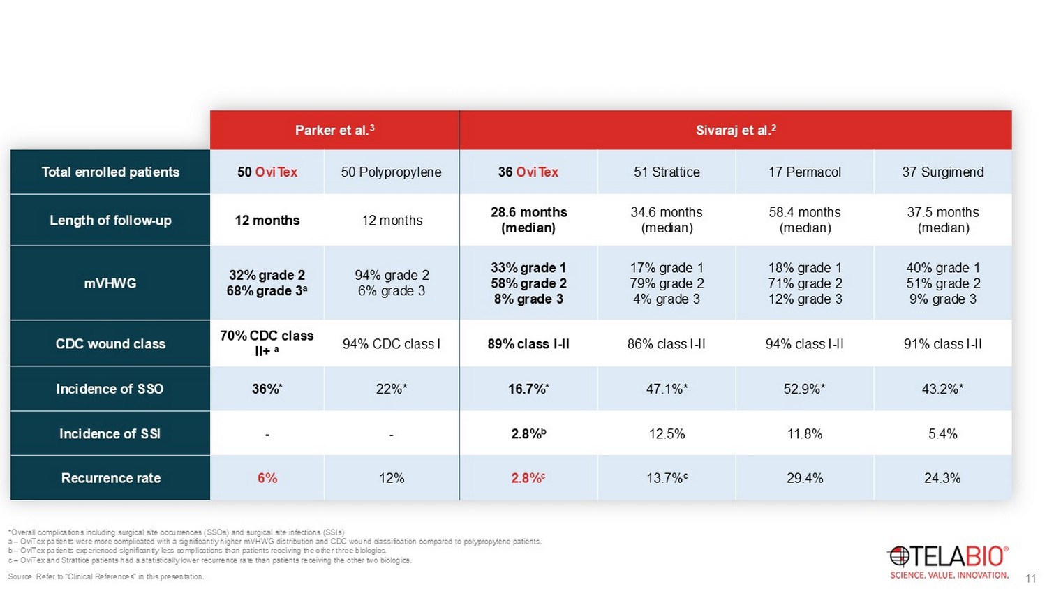 Source: Refer to “Clinical References” in this presentation. * Indicates one or more surgeons are paid consultants of TELA Bio, Inc. 10 Backed by 9+ years of clinical experience and 50+ published or presented works Consistently Low Recurrence Rates