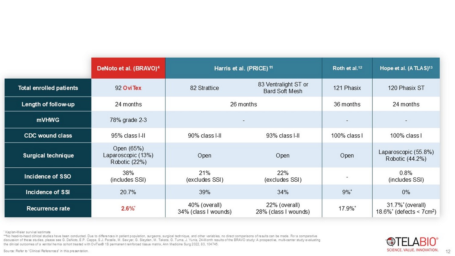 *Overall complications including surgical site occurrences (SSOs) and surgical site infections (SSIs) a – OviTex patients were more complicated with a significantly higher mVHWG distribution and CDC wound classification compared to polypropylene patients. b – OviTex patients experienced significantly less complications than patients receiving the other three biologics. c – OviTex and Strattice patients had a statistically lower recurrence rate than patients receiving the other two biologics. Source: Refer to “Clinical References” in this presentation. Sivaraj et al. 2 Parker et al. 3 37 Surgimend 17 Permacol 51 Strattice 36 OviTex 50 Polypropylene 50 OviTex Total enrolled patients 37.5 months (median) 58.4 months (median) 34.6 months (median) 28.6 months (median) 12 months 12 months Length of follow - up 40% grade 1 51% grade 2 9% grade 3 18% grade 1 71% grade 2 12% grade 3 17% grade 1 79% grade 2 4% grade 3 33% grade 1 58% grade 2 8% grade 3 94% grade 2 6% grade 3 32% grade 2 68% grade 3 a mVHWG 91% class I - II 94% class I - II 86% class I - II 89% class I - II 94% CDC class I 70% CDC class II+ a CDC wound class 43.2%* 52.9%* 47.1%* 16.7%* 22%* 36%* Incidence of SSO 5.4% 11.8% 12.5% 2.8% b - - Incidence of SSI 24.3% 29.4% 13.7% c 2.8% c 12% 6% Recurrence rate 11 Comparisons to synthetic mesh and leading first generation biologics Favorable Results of OviTex in Ventral Hernia Repair