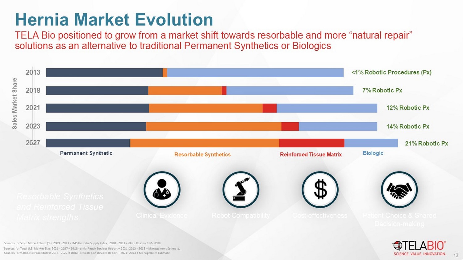 TELA Bio positioned to grow from a market shift towards resorbable and more “natural repair” solutions as an alternative to traditional Permanent Synthetics or Biologics Hernia Market Evolution 2027 2021 2018 2013 Permanent Synthetic Biologic Sales Market Share <1% Robotic Procedures ( Px ) 7% Robotic Px 12% Robotic Px 202 3 1 4 % Robotic Px Resorbable Synthetics Reinforced Tissue Matrix 21% Robotic Px Resorbable Synthetics and Reinforced Tissue Matrix strengths: 13 Sources for Sales Market Share (%): 2009 - 2013 = IMS Hospital Supply Index; 2018 - 2023 = iData Research MedSKU Sources for Total U.S. Market Size: 2021 - 202 7 = DRG Hernia Repair Devices Report – 2021; 2013 - 2018 = Management Estimate. Sources for % Robotic Procedures: 2018 - 2027 = DRG Hernia Repair Devices Report – 2021; 2013 = Management Estimate. Clinical Evidence Robot Compatibility Cost - effectiveness Patient Choice & Shared Decision - making