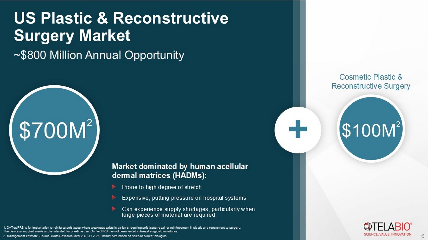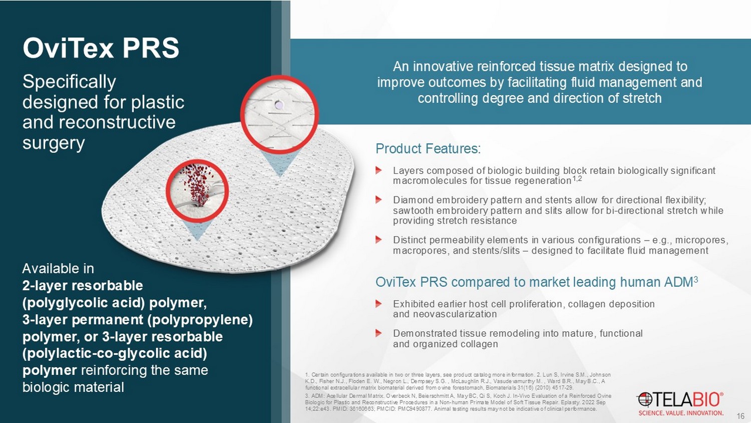 15 ~$800 Million Annual Opportunity US Plastic & Reconstructive Surgery Market $700M 2 1. OviTex PRS is for implantation to reinforce soft tissue where weakness exists in patients requiring soft tissue repair or reinforcem en t in plastic and reconstructive surgery. The device is supplied sterile and is intended for one - time use. OviTex PRS has not been tested in breast surgical procedures. 2. Management estimate. Source: iData Research MedSKU , Q1 2024. Market size based on sales of current biologics. + $100M 2 Cosmetic Plastic & Reconstructive Surgery Market dominated by human acellular dermal matrices (HADMs): Prone to high degree of stretch Expensive, putting pressure on hospital systems Can experience supply shortages, particularly when large pieces of material are required