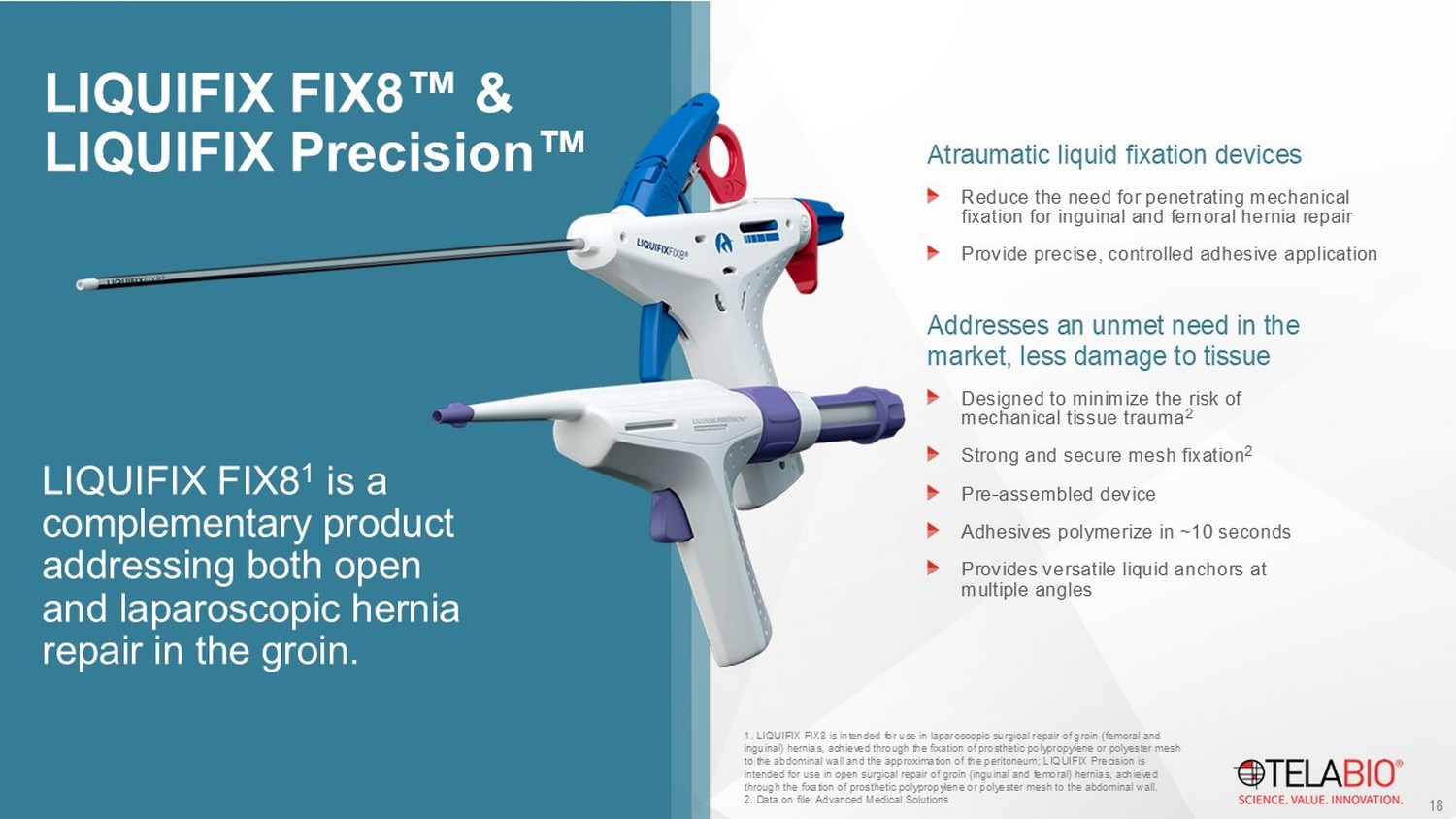 LIQUIFIX FIX8 & LIQUIFIX Precision Atraumatic liquid fixation devices Reduce the need for penetrating mechanical fixation for inguinal and femoral hernia repair Provide precise, controlled adhesive application Addresses an unmet need in the market, less damage to tissue Designed to minimize the risk of mechanical tissue trauma 2 Strong and secure mesh fixation 2 Pre - assembled device Adhesives polymerize in ~10 seconds Provides versatile liquid anchors at multiple angles 1 . LIQUIFIX FIX8 is intended for use in laparoscopic surgical repair of groin (femoral and inguinal) hernias, achieved through the fixation of prosthetic polypropylene or polyester mesh to the abdominal wall and the approximation of the peritoneum; LIQUIFIX Precision is intended for use in open surgical repair of groin (inguinal and femoral) hernias, achieved through the fixation of prosthetic polypropylene or polyester mesh to the abdominal wall. 2. Data on file: Advanced Medical Solutions 18 LIQUIFIX FIX8 1 is a complementary product addressing both open and laparoscopic hernia repair in the groin.