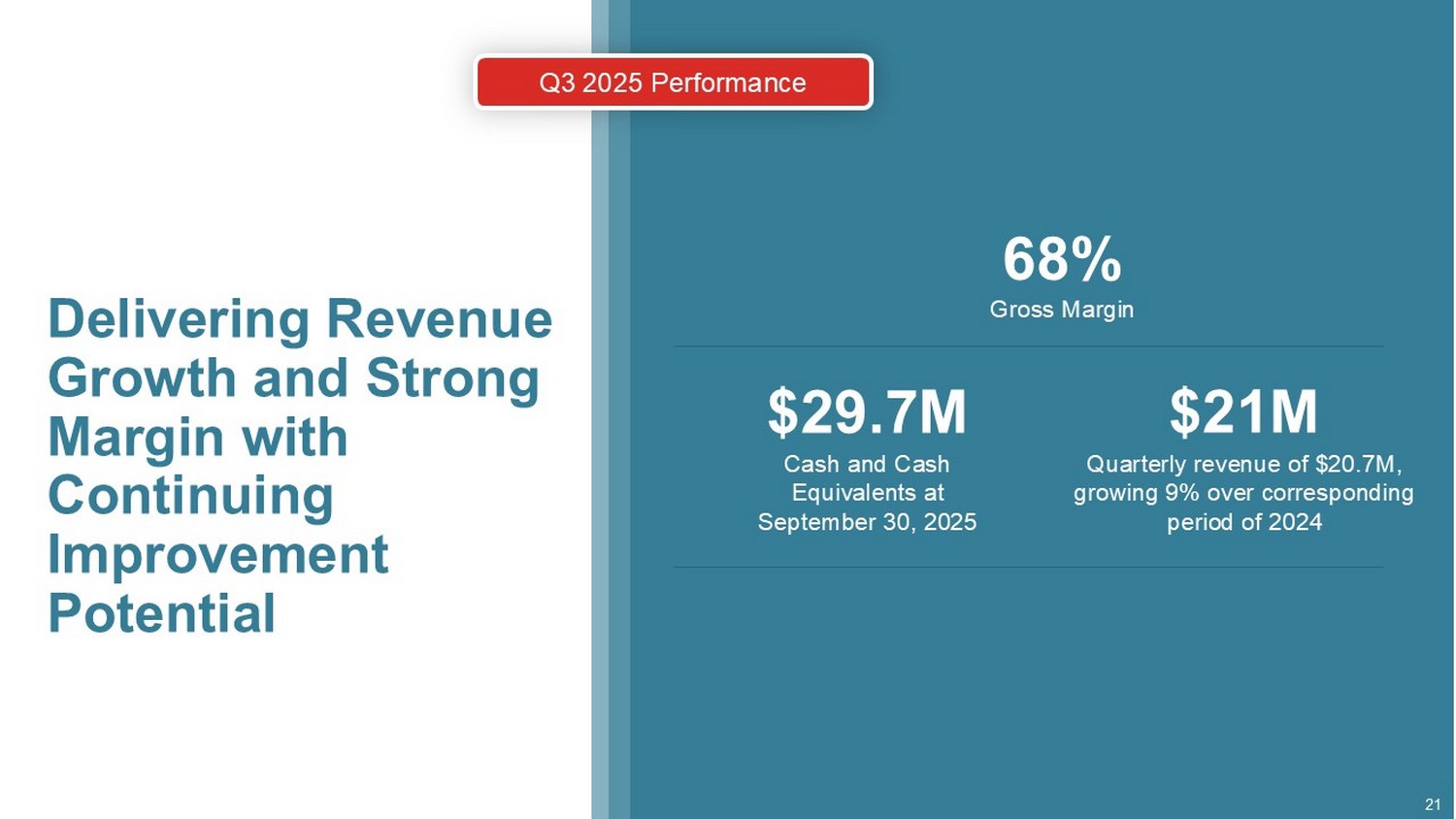 21 Delivering Revenue Growth and Strong Margin with Continuing Improvement Potential $ 21M Quarterly revenue of $ 20.7M , growing 9 % over corresponding period of 2024 $2 9.7M Cash and Cash Equivalents at September 30, 2025 68 % Gross Margin Q3 2025 Performance