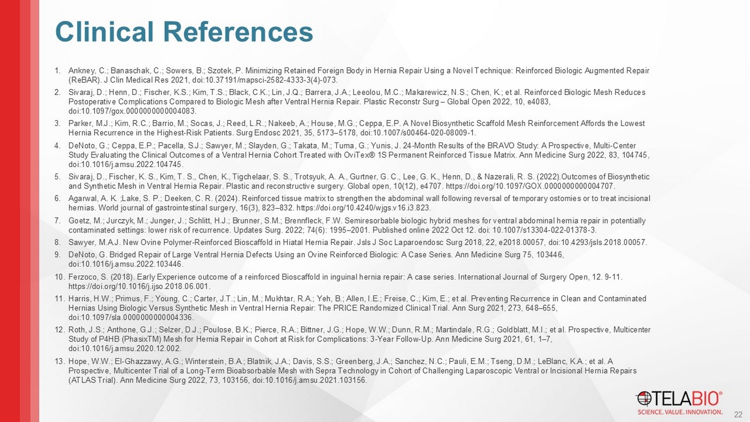 1. Ankney, C.; Banaschak , C.; Sowers, B.; Szotek , P. Minimizing Retained Foreign Body in Hernia Repair Using a Novel Technique: Reinforced Biologic Augmented Repair ( ReBAR ). J Clin Medical Res 2021, doi:10.37191/mapsci - 2582 - 4333 - 3(4) - 073. 2. Sivaraj , D.; Henn, D.; Fischer, K.S.; Kim, T.S.; Black, C.K.; Lin, J.Q.; Barrera, J.A.; Leeolou , M.C.; Makarewicz , N.S.; Chen, K.; et al. Reinforced Biologic Mesh Reduces Postoperative Complications Compared to Biologic Mesh after Ventral Hernia Repair. Plastic Reconstr Surg – Global Open 2022, 10, e4083, doi:10.1097/gox.0000000000004083. 3. Parker, M.J.; Kim, R.C.; Barrio, M.; Socas, J.; Reed, L.R.; Nakeeb , A.; House, M.G.; Ceppa , E.P. A Novel Biosynthetic Scaffold Mesh Reinforcement Affords the Lowest Hernia Recurrence in the Highest - Risk Patients. Surg Endosc 2021, 35, 5173 – 5178, doi:10.1007/s00464 - 020 - 08009 - 1. 4. DeNoto , G.; Ceppa , E.P.; Pacella, S.J.; Sawyer, M.; Slayden , G.; Takata, M.; Tuma, G.; Yunis, J. 24 - Month Results of the BRAVO Study: A Prospective, Multi - Center Study Evaluating the Clinical Outcomes of a Ventral Hernia Cohort Treated with OviTex ® 1S Permanent Reinforced Tissue Matrix. Ann Medicine Surg 2022, 83, 104745, doi:10.1016/j.amsu.2022.104745. 5. Sivaraj , D., Fischer, K. S., Kim, T. S., Chen, K., Tigchelaar , S. S., Trotsyuk , A. A., Gurtner , G. C., Lee, G. K., Henn, D., & Nazerali, R. S. (2022).Outcomes of Biosynthetic and Synthetic Mesh in Ventral Hernia Repair. Plastic and reconstructive surgery. Global open, 10(12), e4707. https:// doi.org /10.1097/GOX.0000000000004707. 6. Agarwal, A. K. ;Lake, S. P.; Deeken , C. R. (2024). Reinforced tissue matrix to strengthen the abdominal wall following reversal of temporary ostomies or to trea t i ncisional hernias. World journal of gastrointestinal surgery, 16(3), 823 – 832. https:// doi.org /10.4240/wjgs.v16.i3.823. 7. Goetz, M.; Jurczyk , M.; Junger, J.; Schlitt, H.J.; Brunner, S.M.; Brennfleck , F.W. Semiresorbable biologic hybrid meshes for ventral abdominal hernia repair in potentially contaminated settings: lower risk of recurrence. Updates Surg. 2022; 74(6): 1995 – 2001. Published online 2022 Oct 12. doi : 10.1007/s13304 - 022 - 01378 - 3. 8. Sawyer, M.A.J. New Ovine Polymer - Reinforced Bioscaffold in Hiatal Hernia Repair. Jsls J Soc Laparoendosc Surg 2018, 22, e2018.00057, doi:10.4293/jsls.2018.00057. 9. DeNoto , G. Bridged Repair of Large Ventral Hernia Defects Using an Ovine Reinforced Biologic: A Case Series. Ann Medicine Surg 75, 103 446, doi:10.1016/j.amsu.2022.103446. 10. Ferzoco , S. (2018). Early Experience outcome of a reinforced Bioscaffold in inguinal hernia repair: A case series. International Journal of Surgery Open, 12. 9 - 11. https:// doi.org /10.1016/j.ijso.2018.06.001. 11. Harris, H.W.; Primus, F.; Young, C.; Carter, J.T.; Lin, M.; Mukhtar, R.A.; Yeh, B.; Allen, I.E.; Freise , C.; Kim, E.; et al. Preventing Recurrence in Clean and Contaminated Hernias Using Biologic Versus Synthetic Mesh in Ventral Hernia Repair: The PRICE Randomized Clinical Trial. Ann Surg 2021, 27 3, 648 – 655, doi:10.1097/sla.0000000000004336. 12. Roth, J.S.; Anthone , G.J.; Selzer, D.J.; Poulose , B.K.; Pierce, R.A.; Bittner, J.G.; Hope, W.W.; Dunn, R.M.; Martindale, R.G.; Goldblatt, M.I.; et al. Prospective, Multicent er Study of P4HB ( PhasixTM ) Mesh for Hernia Repair in Cohort at Risk for Complications: 3 - Year Follow - Up. Ann Medicine Surg 2021, 61, 1 – 7, doi:10.1016/j.amsu.2020.12.002. 13. Hope, W.W.; El - Ghazzawy , A.G.; Winterstein, B.A.; Blatnik, J.A.; Davis, S.S.; Greenberg, J.A.; Sanchez, N.C.; Pauli, E.M.; Tseng, D.M.; LeBlanc, K.A .; et al. A Prospective, Multicenter Trial of a Long - Term Bioabsorbable Mesh with Sepra Technology in Cohort of Challenging Laparoscopic Ventral or Incisional Hernia Repairs (ATLAS Trial). Ann Medicine Surg 2022, 73, 103156, doi:10.1016/j.amsu.2021.103156. 22 Clinical References