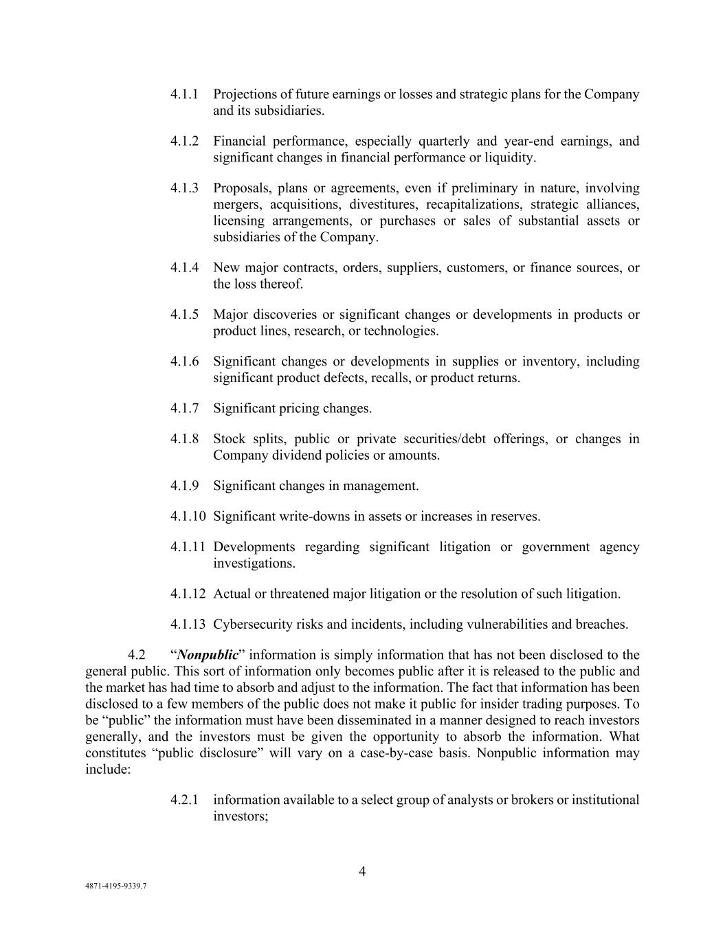 4871-4195-9339.7 4 4.1.1 Projections of future earnings or losses and strategic plans for the Company and its subsidiaries. 4.1.2 Financial performance, especially quarterly and year-end earnings, and significant changes in financial performance or liquidity. 4.1.3 Proposals, plans or agreements, even if preliminary in nature, involving mergers, acquisitions, divestitures, recapitalizations, strategic alliances, licensing arrangements, or purchases or sales of substantial assets or subsidiaries of the Company. 4.1.4 New major contracts, orders, suppliers, customers, or finance sources, or the loss thereof. 4.1.5 Major discoveries or significant changes or developments in products or product lines, research, or technologies. 4.1.6 Significant changes or developments in supplies or inventory, including significant product defects, recalls, or product returns. 4.1.7 Significant pricing changes. 4.1.8 Stock splits, public or private securities/debt offerings, or changes in Company dividend policies or amounts. 4.1.9 Significant changes in management. 4.1.10 Significant write-downs in assets or increases in reserves. 4.1.11 Developments regarding significant litigation or government agency investigations. 4.1.12 Actual or threatened major litigation or the resolution of such litigation. 4.1.13 Cybersecurity risks and incidents, including vulnerabilities and breaches. 4.2 “Nonpublic” information is simply information that has not been disclosed to the general public. This sort of information only becomes public after it is released to the public and the market has had time to absorb and adjust to the information. The fact that information has been disclosed to a few members of the public does not make it public for insider trading purposes. To be “public” the information must have been disseminated in a manner designed to reach investors generally, and the investors must be given the opportunity to absorb the information. What constitutes “public disclosure” will vary on a case-by-case basis. Nonpublic information may include: 4.2.1 information available to a select group of analysts or brokers or institutional investors;