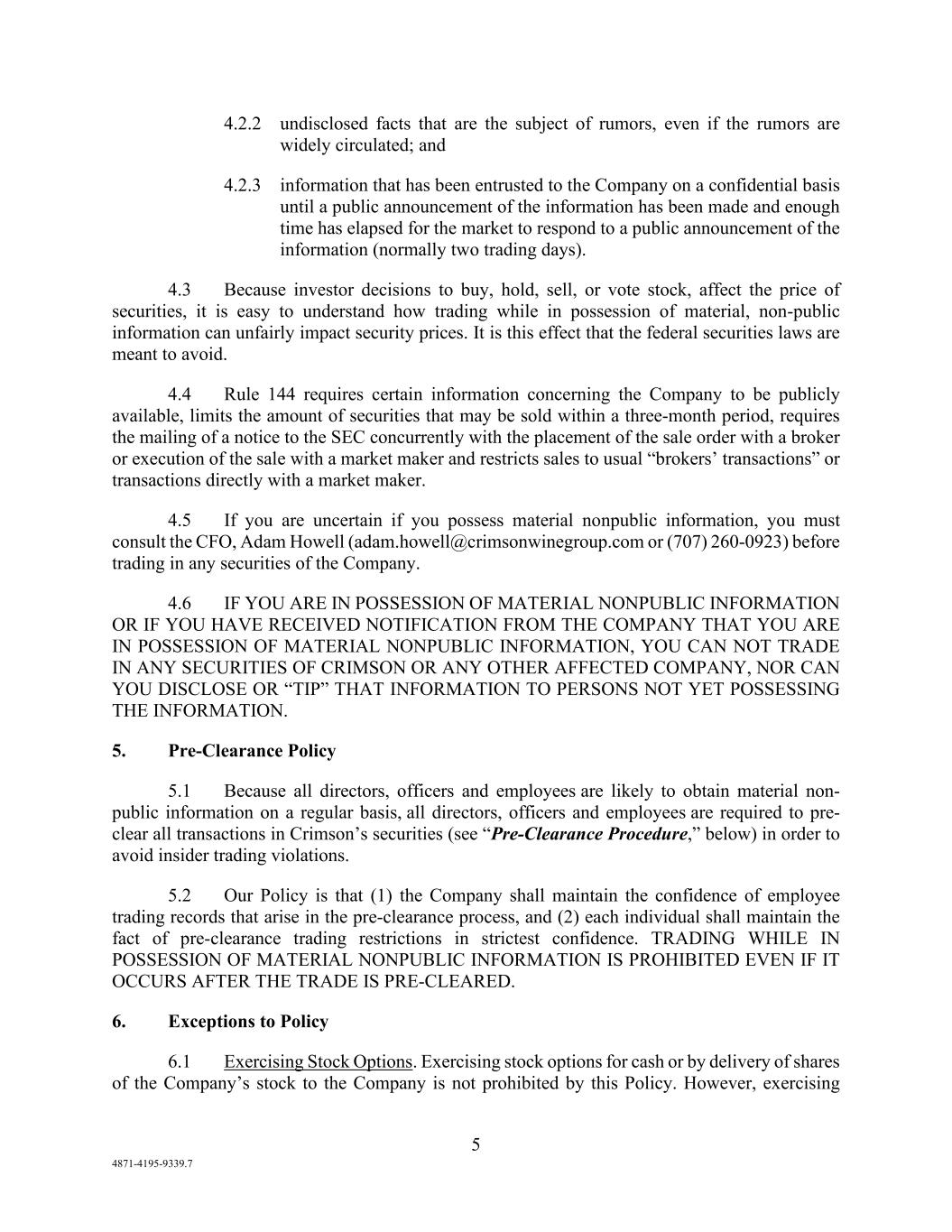 4871-4195-9339.7 5 4.2.2 undisclosed facts that are the subject of rumors, even if the rumors are widely circulated; and 4.2.3 information that has been entrusted to the Company on a confidential basis until a public announcement of the information has been made and enough time has elapsed for the market to respond to a public announcement of the information (normally two trading days). 4.3 Because investor decisions to buy, hold, sell, or vote stock, affect the price of securities, it is easy to understand how trading while in possession of material, non-public information can unfairly impact security prices. It is this effect that the federal securities laws are meant to avoid. 4.4 Rule 144 requires certain information concerning the Company to be publicly available, limits the amount of securities that may be sold within a three-month period, requires the mailing of a notice to the SEC concurrently with the placement of the sale order with a broker or execution of the sale with a market maker and restricts sales to usual “brokers’ transactions” or transactions directly with a market maker. 4.5 If you are uncertain if you possess material nonpublic information, you must consult the CFO, Adam Howell (adam.howell@crimsonwinegroup.com or (707) 260-0923) before trading in any securities of the Company. 4.6 IF YOU ARE IN POSSESSION OF MATERIAL NONPUBLIC INFORMATION OR IF YOU HAVE RECEIVED NOTIFICATION FROM THE COMPANY THAT YOU ARE IN POSSESSION OF MATERIAL NONPUBLIC INFORMATION, YOU CAN NOT TRADE IN ANY SECURITIES OF CRIMSON OR ANY OTHER AFFECTED COMPANY, NOR CAN YOU DISCLOSE OR “TIP” THAT INFORMATION TO PERSONS NOT YET POSSESSING THE INFORMATION. 5. Pre-Clearance Policy 5.1 Because all directors, officers and employees are likely to obtain material non- public information on a regular basis, all directors, officers and employees are required to pre- clear all transactions in Crimson’s securities (see “Pre-Clearance Procedure,” below) in order to avoid insider trading violations. 5.2 Our Policy is that (1) the Company shall maintain the confidence of employee trading records that arise in the pre-clearance process, and (2) each individual shall maintain the fact of pre-clearance trading restrictions in strictest confidence. TRADING WHILE IN POSSESSION OF MATERIAL NONPUBLIC INFORMATION IS PROHIBITED EVEN IF IT OCCURS AFTER THE TRADE IS PRE-CLEARED. 6. Exceptions to Policy 6.1 Exercising Stock Options. Exercising stock options for cash or by delivery of shares of the Company’s stock to the Company is not prohibited by this Policy. However, exercising