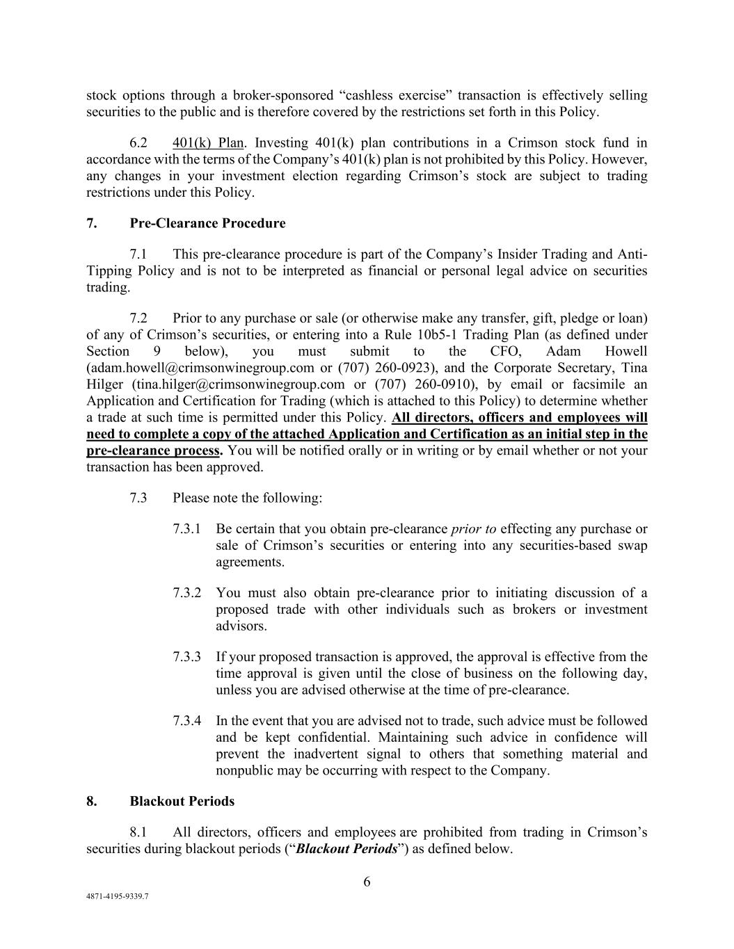 4871-4195-9339.7 6 stock options through a broker-sponsored “cashless exercise” transaction is effectively selling securities to the public and is therefore covered by the restrictions set forth in this Policy. 6.2 401(k) Plan. Investing 401(k) plan contributions in a Crimson stock fund in accordance with the terms of the Company’s 401(k) plan is not prohibited by this Policy. However, any changes in your investment election regarding Crimson’s stock are subject to trading restrictions under this Policy. 7. Pre-Clearance Procedure 7.1 This pre-clearance procedure is part of the Company’s Insider Trading and Anti- Tipping Policy and is not to be interpreted as financial or personal legal advice on securities trading. 7.2 Prior to any purchase or sale (or otherwise make any transfer, gift, pledge or loan) of any of Crimson’s securities, or entering into a Rule 10b5-1 Trading Plan (as defined under Section 9 below), you must submit to the CFO, Adam Howell (adam.howell@crimsonwinegroup.com or (707) 260-0923), and the Corporate Secretary, Tina Hilger (tina.hilger@crimsonwinegroup.com or (707) 260-0910), by email or facsimile an Application and Certification for Trading (which is attached to this Policy) to determine whether a trade at such time is permitted under this Policy. All directors, officers and employees will need to complete a copy of the attached Application and Certification as an initial step in the pre-clearance process. You will be notified orally or in writing or by email whether or not your transaction has been approved. 7.3 Please note the following: 7.3.1 Be certain that you obtain pre-clearance prior to effecting any purchase or sale of Crimson’s securities or entering into any securities-based swap agreements. 7.3.2 You must also obtain pre-clearance prior to initiating discussion of a proposed trade with other individuals such as brokers or investment advisors. 7.3.3 If your proposed transaction is approved, the approval is effective from the time approval is given until the close of business on the following day, unless you are advised otherwise at the time of pre-clearance. 7.3.4 In the event that you are advised not to trade, such advice must be followed and be kept confidential. Maintaining such advice in confidence will prevent the inadvertent signal to others that something material and nonpublic may be occurring with respect to the Company. 8. Blackout Periods 8.1 All directors, officers and employees are prohibited from trading in Crimson’s securities during blackout periods (“Blackout Periods”) as defined below.