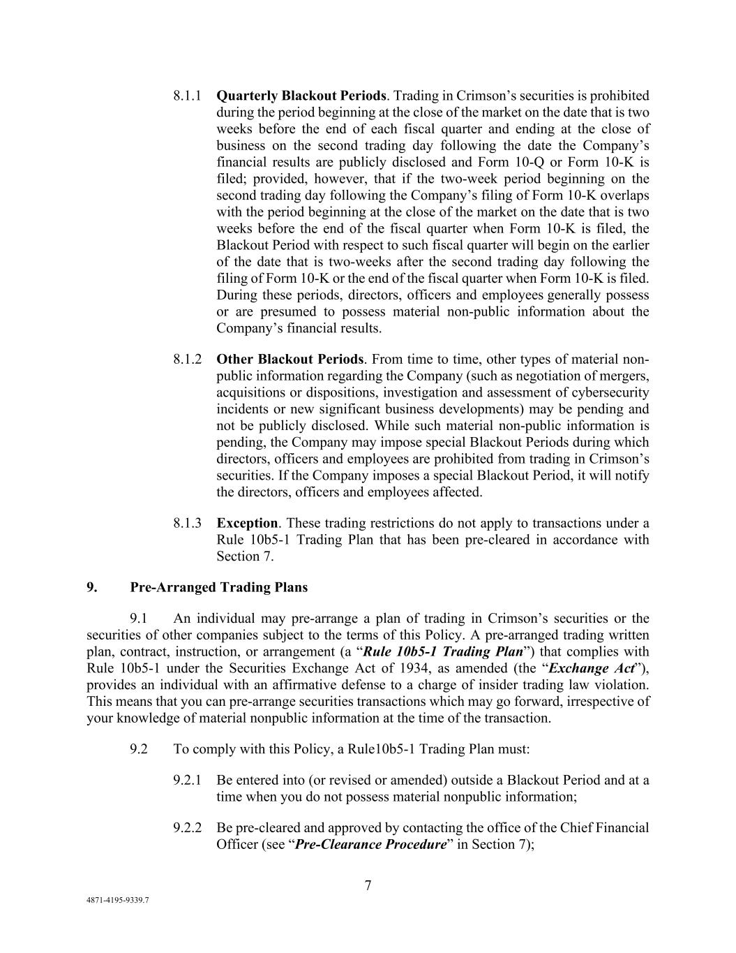 4871-4195-9339.7 7 8.1.1 Quarterly Blackout Periods. Trading in Crimson’s securities is prohibited during the period beginning at the close of the market on the date that is two weeks before the end of each fiscal quarter and ending at the close of business on the second trading day following the date the Company’s financial results are publicly disclosed and Form 10-Q or Form 10-K is filed; provided, however, that if the two-week period beginning on the second trading day following the Company’s filing of Form 10-K overlaps with the period beginning at the close of the market on the date that is two weeks before the end of the fiscal quarter when Form 10-K is filed, the Blackout Period with respect to such fiscal quarter will begin on the earlier of the date that is two-weeks after the second trading day following the filing of Form 10-K or the end of the fiscal quarter when Form 10-K is filed. During these periods, directors, officers and employees generally possess or are presumed to possess material non-public information about the Company’s financial results. 8.1.2 Other Blackout Periods. From time to time, other types of material non- public information regarding the Company (such as negotiation of mergers, acquisitions or dispositions, investigation and assessment of cybersecurity incidents or new significant business developments) may be pending and not be publicly disclosed. While such material non-public information is pending, the Company may impose special Blackout Periods during which directors, officers and employees are prohibited from trading in Crimson’s securities. If the Company imposes a special Blackout Period, it will notify the directors, officers and employees affected. 8.1.3 Exception. These trading restrictions do not apply to transactions under a Rule 10b5-1 Trading Plan that has been pre-cleared in accordance with Section 7. 9. Pre-Arranged Trading Plans 9.1 An individual may pre-arrange a plan of trading in Crimson’s securities or the securities of other companies subject to the terms of this Policy. A pre-arranged trading written plan, contract, instruction, or arrangement (a “Rule 10b5-1 Trading Plan”) that complies with Rule 10b5-1 under the Securities Exchange Act of 1934, as amended (the “Exchange Act”), provides an individual with an affirmative defense to a charge of insider trading law violation. This means that you can pre-arrange securities transactions which may go forward, irrespective of your knowledge of material nonpublic information at the time of the transaction. 9.2 To comply with this Policy, a Rule10b5-1 Trading Plan must: 9.2.1 Be entered into (or revised or amended) outside a Blackout Period and at a time when you do not possess material nonpublic information; 9.2.2 Be pre-cleared and approved by contacting the office of the Chief Financial Officer (see “Pre-Clearance Procedure” in Section 7);