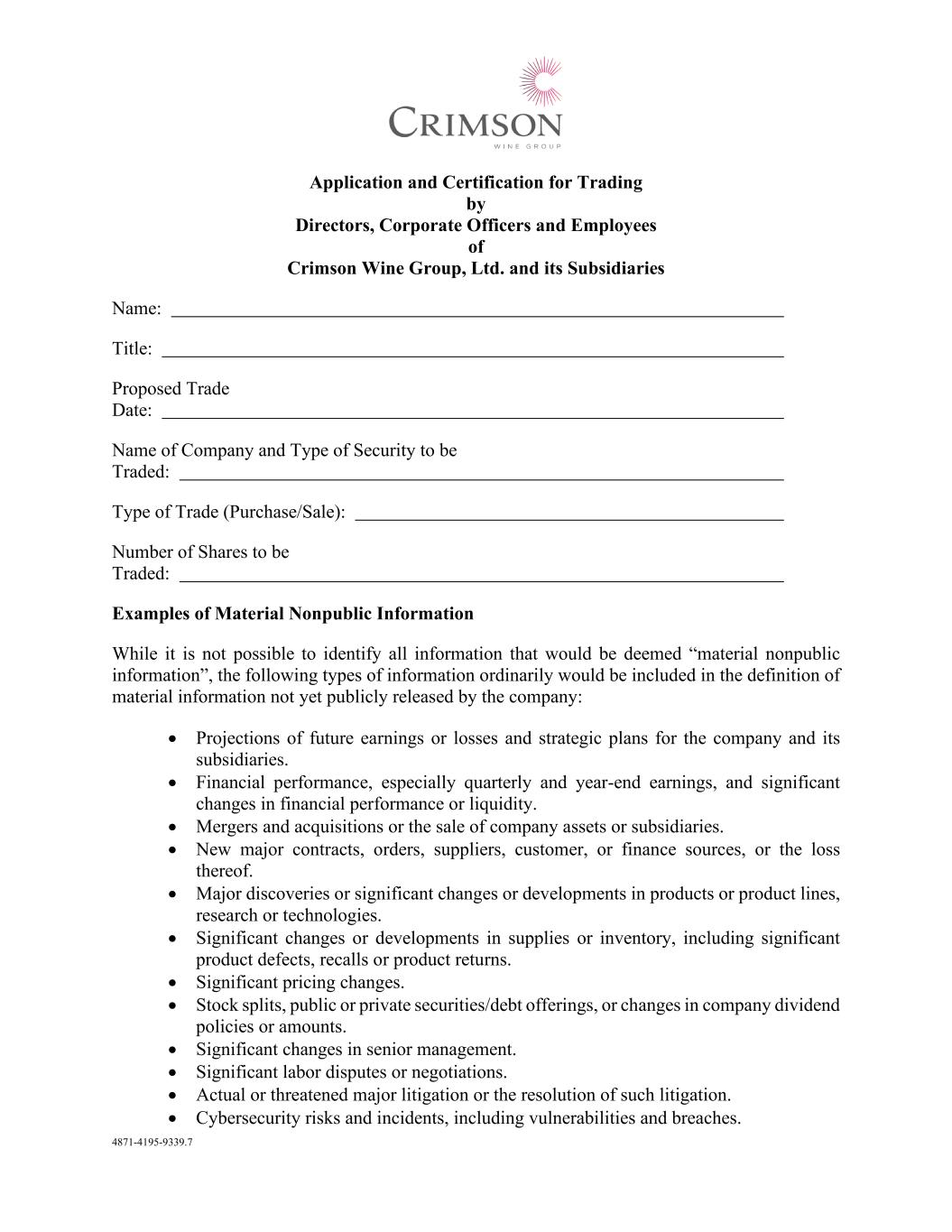 4871-4195-9339.7 Application and Certification for Trading by Directors, Corporate Officers and Employees of Crimson Wine Group, Ltd. and its Subsidiaries Name: Title: Proposed Trade Date: Name of Company and Type of Security to be Traded: Type of Trade (Purchase/Sale): Number of Shares to be Traded: Examples of Material Nonpublic Information While it is not possible to identify all information that would be deemed “material nonpublic information”, the following types of information ordinarily would be included in the definition of material information not yet publicly released by the company: • Projections of future earnings or losses and strategic plans for the company and its subsidiaries. • Financial performance, especially quarterly and year-end earnings, and significant changes in financial performance or liquidity. • Mergers and acquisitions or the sale of company assets or subsidiaries. • New major contracts, orders, suppliers, customer, or finance sources, or the loss thereof. • Major discoveries or significant changes or developments in products or product lines, research or technologies. • Significant changes or developments in supplies or inventory, including significant product defects, recalls or product returns. • Significant pricing changes. • Stock splits, public or private securities/debt offerings, or changes in company dividend policies or amounts. • Significant changes in senior management. • Significant labor disputes or negotiations. • Actual or threatened major litigation or the resolution of such litigation. • Cybersecurity risks and incidents, including vulnerabilities and breaches.