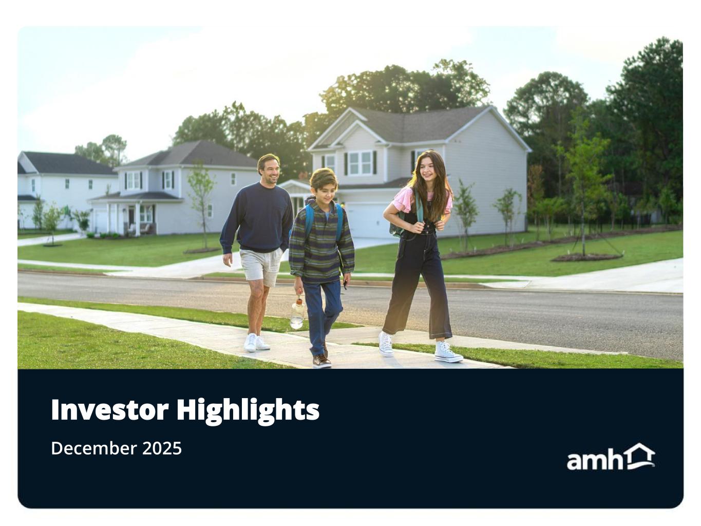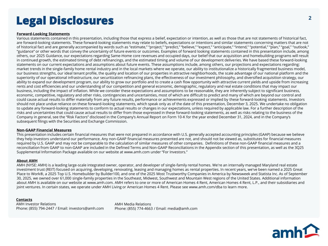 2Legal Disclosures Forward-Looking Statements Various statements contained in this presentation, including those that express a belief, expectation or intention, as well as those that are not statements of historical fact, are forward-looking statements. These forward-looking statements may relate to beliefs, expectations or intentions and similar statements concerning matters that are not of historical fact and are generally accompanied by words such as “estimate,” “project,” “predict,” “believe,” “expect,” “anticipate,” “intend,” “potential,” “plan,” “goal,” “outlook,” “guidance” or other words that convey the uncertainty of future events or outcomes. Examples of forward looking statements contained in this presentation include, among others, our 2025 Guidance, our expectations regarding Same-Home core revenues and occupied days, our belief that our acquisition and homebuilding programs will result in continued growth, the estimated timing of debt refinancings, and the estimated timing and volume of our development deliveries. We have based these forward-looking statements on our current expectations and assumptions about future events. These assumptions include, among others, our projections and expectations regarding: market trends in the single-family home rental industry and in the local markets where we operate, our ability to institutionalize a historically fragmented business model, our business strengths, our ideal tenant profile, the quality and location of our properties in attractive neighborhoods, the scale advantage of our national platform and the superiority of our operational infrastructure, our securitization refinancing plans, the effectiveness of our investment philosophy, and diversified acquisition strategy, our ability to expand our development program, our ability to grow our portfolio and to create a cash flow opportunity with attractive current yields and upside from increasing rents and cost efficiencies and our understanding of our competition and general economic, demographic, regulatory and real estate conditions that may impact our business, including the impact of inflation. While we consider these expectations and assumptions to be reasonable, they are inherently subject to significant business, economic, competitive, regulatory and other risks, contingencies and uncertainties, most of which are difficult to predict and many of which are beyond our control and could cause actual results to differ materially from any future results, performance or achievements expressed or implied by these forward-looking statements. Investors should not place undue reliance on these forward-looking statements, which speak only as of the date of this presentation, December 3, 2025. We undertake no obligation to update any forward-looking statements to conform to actual results or changes in our expectations, unless required by applicable law. For a further description of the risks and uncertainties that could cause actual results to differ from those expressed in these forward-looking statements, as well as risks relating to the business of the Company in general, see the “Risk Factors” disclosed in the Company’s Annual Report on Form 10-K for the year ended December 31, 2024, and in the Company’s subsequent filings with the Securities and Exchange Commission. Non-GAAP Financial Measures This presentation includes certain financial measures that were not prepared in accordance with U.S. generally accepted accounting principles (GAAP) because we believe they help investors understand our performance. Any non-GAAP financial measures presented are not, and should not be viewed as, substitutes for financial measures required by U.S. GAAP and may not be comparable to the calculation of similar measures of other companies. Definitions of these non-GAAP financial measures and a reconciliation from GAAP to non-GAAP are included in the Defined Terms and Non-GAAP Reconciliations in the Appendix section of this presentation, as well as the 3Q25 Supplemental Information Package available on our website at www.amh.com under “For Investors.” About AMH AMH (NYSE: AMH) is a leading large-scale integrated owner, operator, and developer of single-family rental homes. We're an internally managed Maryland real estate investment trust (REIT) focused on acquiring, developing, renovating, leasing and managing homes as rental properties. In recent years, we've been named a 2025 Great Place to Work®, a 2025 Top U.S. Homebuilder by Builder100, and one of the 2025 Most Trustworthy Companies in America by Newsweek and Statista Inc. As of September 30, 2025, we owned over 61,000 single-family properties in the Southeast, Midwest, Southwest and Mountain West regions of the United States. Additional information about AMH is available on our website at www.amh.com. AMH refers to one or more of American Homes 4 Rent, American Homes 4 Rent, L.P., and their subsidiaries and joint ventures. In certain states, we operate under AMH Living or American Homes 4 Rent. Please see www.amh.com/dba to learn more. Contacts AMH Investor Relations Phone: (855) 794-2447 / Email: investors@amh.com AMH Media Relations Phone: (855) 774-4663 / Email: media@amh.com