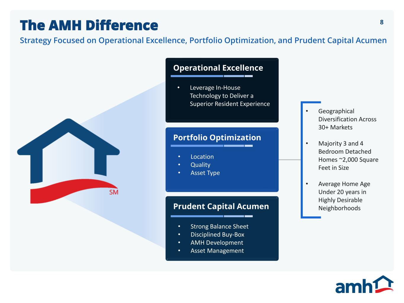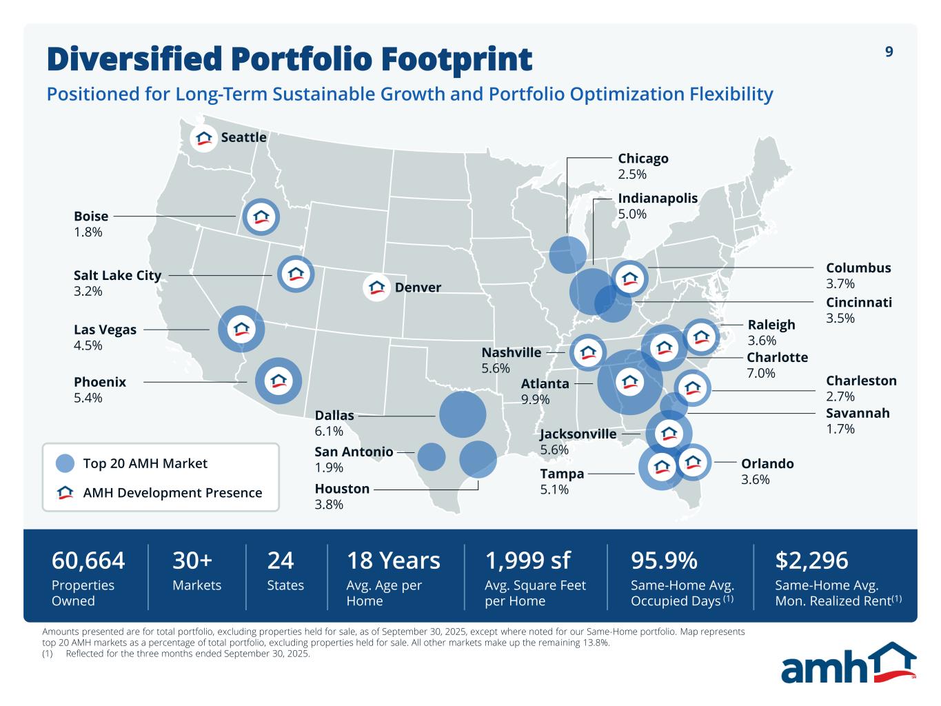 8The AMH Difference Strategy Focused on Operational Excellence, Portfolio Optimization, and Prudent Capital Acumen • Geographical Diversification Across 30+ Markets • Majority 3 and 4 Bedroom Detached Homes ~2,000 Square Feet in Size • Average Home Age Under 20 years in Highly Desirable Neighborhoods Operational Excellence • Leverage In-House Technology to Deliver a Superior Resident Experience Portfolio Optimization • Location • Quality • Asset Type Prudent Capital Acumen • Strong Balance Sheet • Disciplined Buy-Box • AMH Development • Asset Management