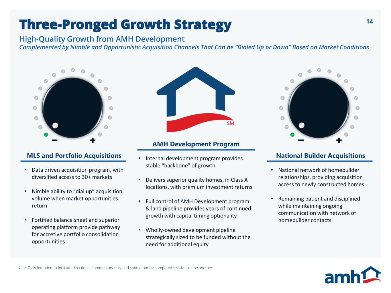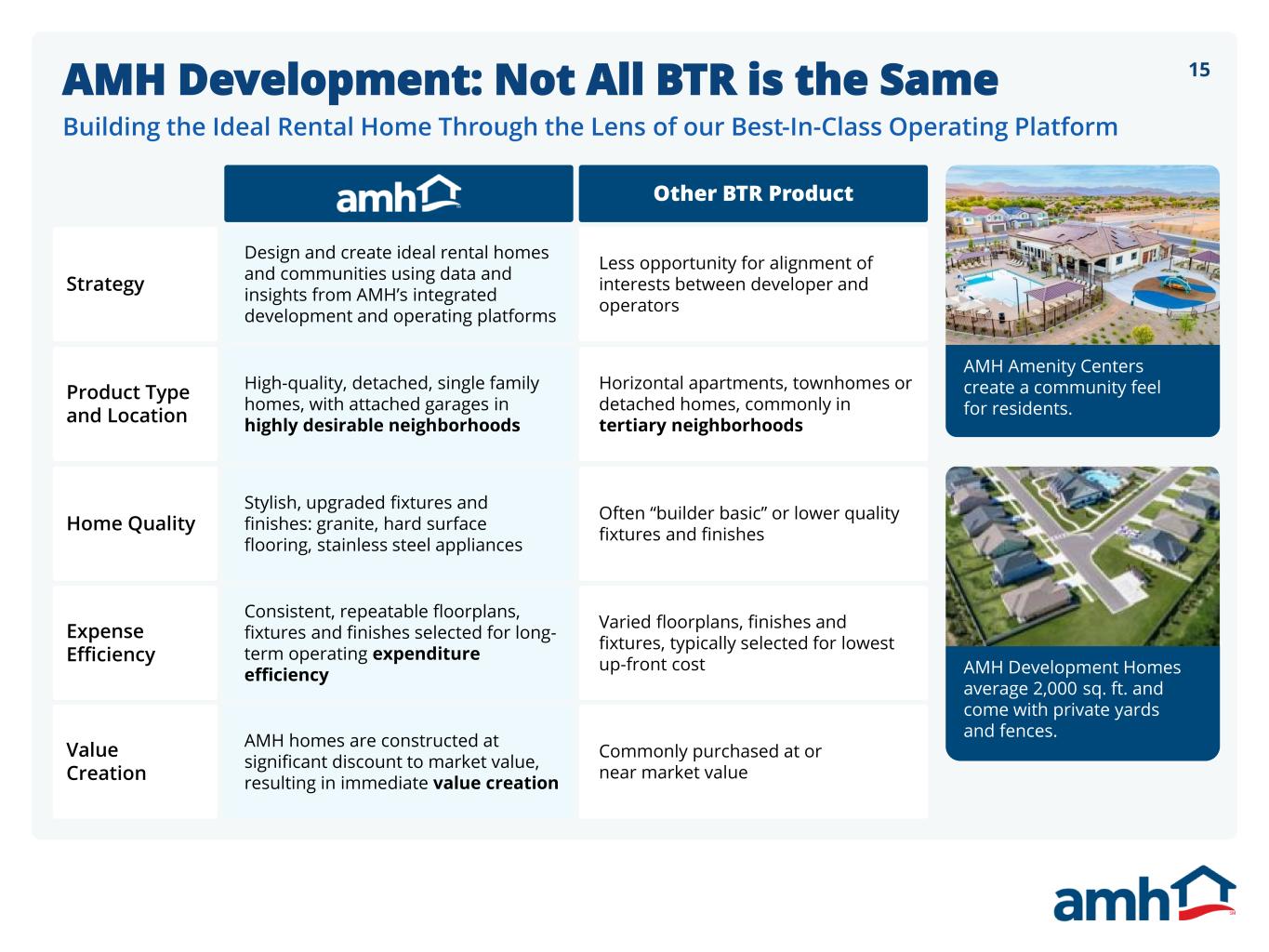 14Three-Pronged Growth Strategy High-Quality Growth from AMH Development Complemented by Nimble and Opportunistic Acquisition Channels That Can be “Dialed Up or Down” Based on Market Conditions • Data driven acquisition program, with diversified access to 30+ markets • Nimble ability to “dial up” acquisition volume when market opportunities return • Fortified balance sheet and superior operating platform provide pathway for accretive portfolio consolidation opportunities • Internal development program provides stable “backbone” of growth • Delivers superior quality homes, in Class A locations, with premium investment returns • Full control of AMH Development program & land pipeline provides years of continued growth with capital timing optionality • Wholly-owned development pipeline strategically sized to be funded without the need for additional equity • National network of homebuilder relationships, providing acquisition access to newly constructed homes • Remaining patient and disciplined while maintaining ongoing communication with network of homebuilder contacts MLS and Portfolio Acquisitions National Builder Acquisitions AMH Development Program Note: Dials intended to indicate directional commentary only and should not be compared relative to one another.