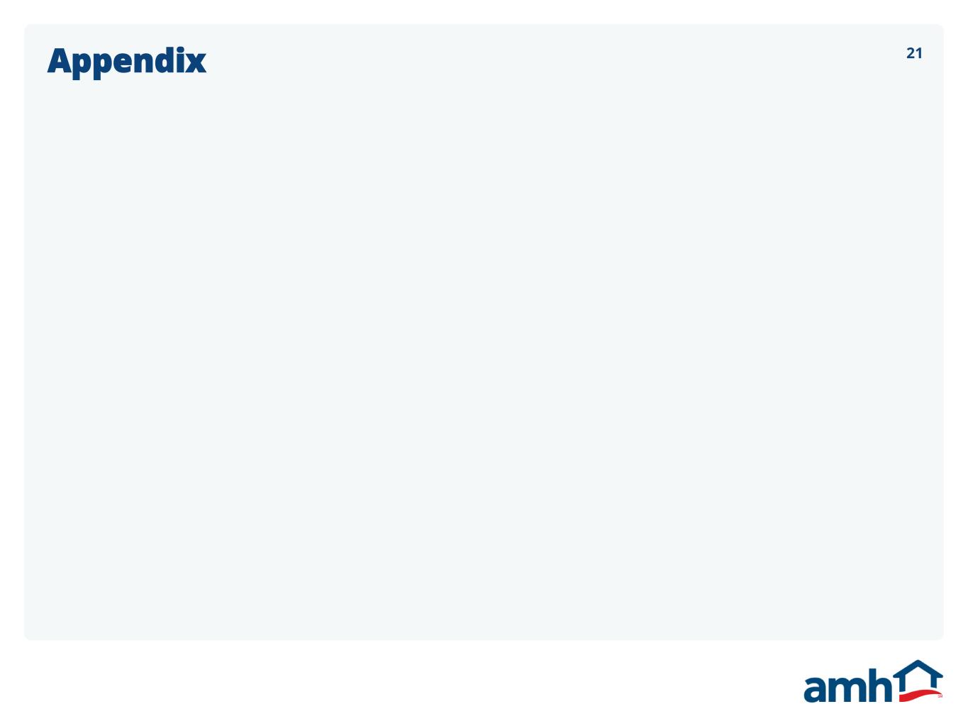 16AMH Development A Consistent Driver of Earnings Growth, Fueled by ~8,000 Unit Land Pipeline 400 950 1,650 2,050 2,200 2,300 2,350 2,300 0 300 600 900 1,200 1,500 1,800 2,100 2,400 2018 2019 2020 2021 2022 2023 2024 2025E AMH Development Deliveries(1) 4,000 6,000 9,000 13,000 14,000 13,000 10,000 8,000 0 2,000 4,000 6,000 8,000 10,000 12,000 14,000 16,000 2018 2019 2020 2021 2022 2023 2024 3Q25 AMH Development Land Pipeline(2) Total Lots Owned and Optioned M id p o in t o f G u id a n ce Guidance is based on the midpoint of the ranges set forth in the October 29, 2025 earnings release. (1) Rounded to the nearest fifty deliveries. (2) Rounded to the nearest thousand.