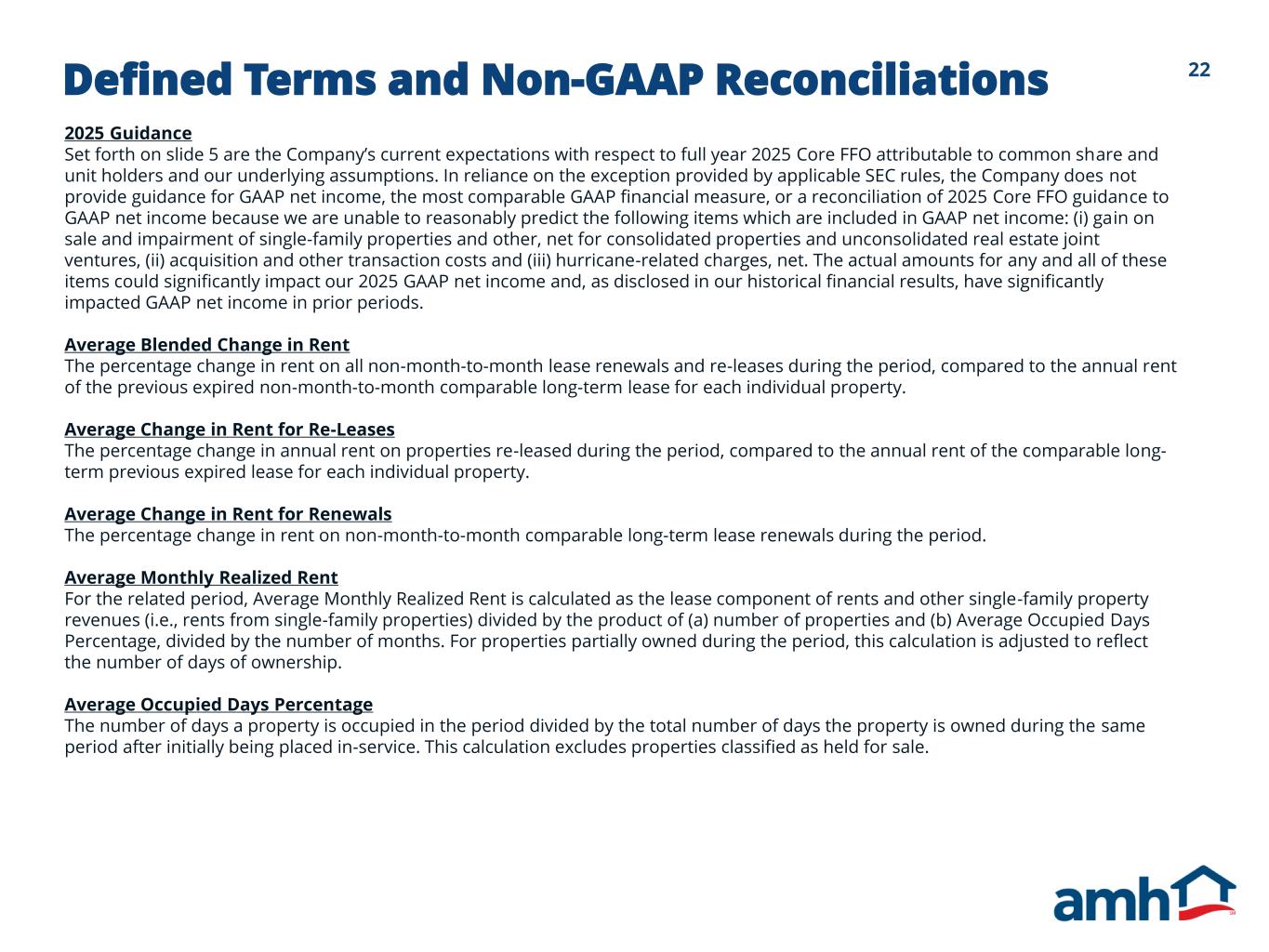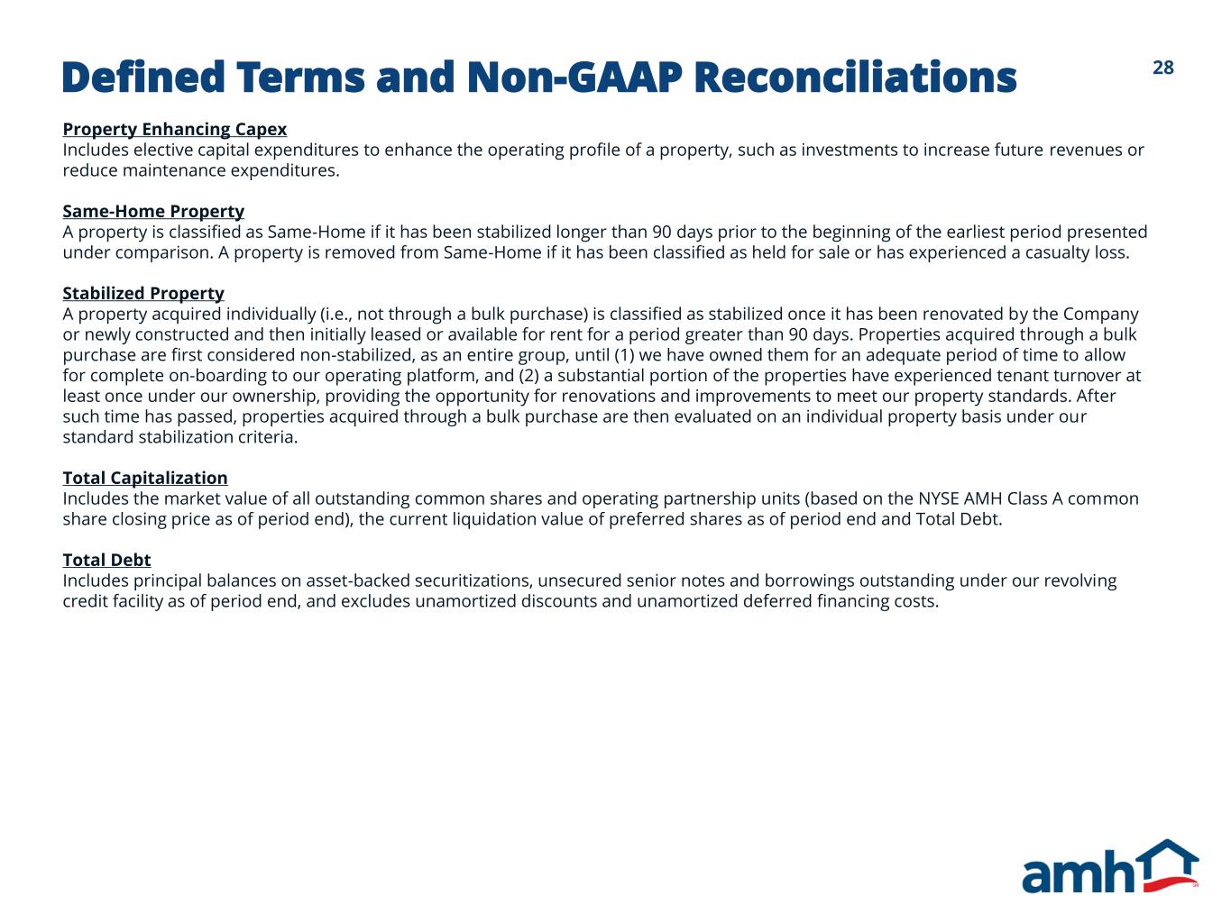 28Defined Terms and Non-GAAP Reconciliations Property Enhancing Capex Includes elective capital expenditures to enhance the operating profile of a property, such as investments to increase future revenues or reduce maintenance expenditures. Same-Home Property A property is classified as Same-Home if it has been stabilized longer than 90 days prior to the beginning of the earliest period presented under comparison. A property is removed from Same-Home if it has been classified as held for sale or has experienced a casualty loss. Stabilized Property A property acquired individually (i.e., not through a bulk purchase) is classified as stabilized once it has been renovated by the Company or newly constructed and then initially leased or available for rent for a period greater than 90 days. Properties acquired through a bulk purchase are first considered non-stabilized, as an entire group, until (1) we have owned them for an adequate period of time to allow for complete on-boarding to our operating platform, and (2) a substantial portion of the properties have experienced tenant turnover at least once under our ownership, providing the opportunity for renovations and improvements to meet our property standards. After such time has passed, properties acquired through a bulk purchase are then evaluated on an individual property basis under our standard stabilization criteria. Total Capitalization Includes the market value of all outstanding common shares and operating partnership units (based on the NYSE AMH Class A common share closing price as of period end), the current liquidation value of preferred shares as of period end and Total Debt. Total Debt Includes principal balances on asset-backed securitizations, unsecured senior notes and borrowings outstanding under our revolving credit facility as of period end, and excludes unamortized discounts and unamortized deferred financing costs.