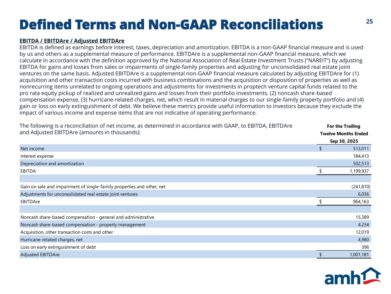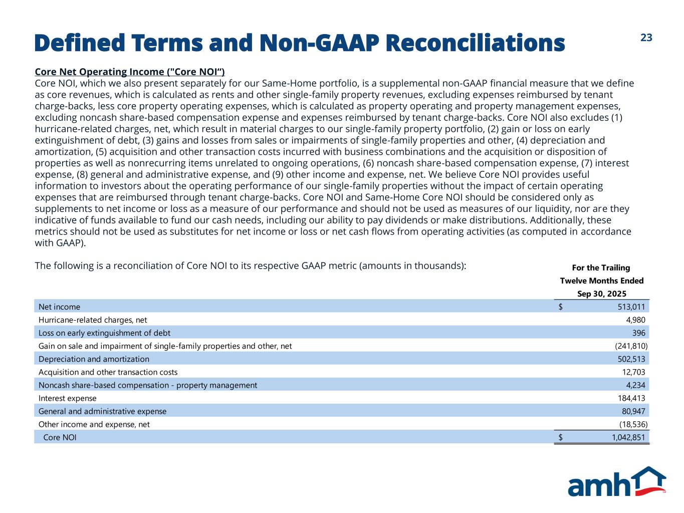 23Defined Terms and Non-GAAP Reconciliations Core Net Operating Income ("Core NOI“) Core NOI, which we also present separately for our Same-Home portfolio, is a supplemental non-GAAP financial measure that we define as core revenues, which is calculated as rents and other single-family property revenues, excluding expenses reimbursed by tenant charge-backs, less core property operating expenses, which is calculated as property operating and property management expenses, excluding noncash share-based compensation expense and expenses reimbursed by tenant charge-backs. Core NOI also excludes (1) hurricane-related charges, net, which result in material charges to our single-family property portfolio, (2) gain or loss on early extinguishment of debt, (3) gains and losses from sales or impairments of single-family properties and other, (4) depreciation and amortization, (5) acquisition and other transaction costs incurred with business combinations and the acquisition or disposition of properties as well as nonrecurring items unrelated to ongoing operations, (6) noncash share-based compensation expense, (7) interest expense, (8) general and administrative expense, and (9) other income and expense, net. We believe Core NOI provides useful information to investors about the operating performance of our single-family properties without the impact of certain operating expenses that are reimbursed through tenant charge-backs. Core NOI and Same-Home Core NOI should be considered only as supplements to net income or loss as a measure of our performance and should not be used as measures of our liquidity, nor are they indicative of funds available to fund our cash needs, including our ability to pay dividends or make distributions. Additionally, these metrics should not be used as substitutes for net income or loss or net cash flows from operating activities (as computed in accordance with GAAP). The following is a reconciliation of Core NOI to its respective GAAP metric (amounts in thousands): For the Trailing Twelve Months Ended Sep 30, 2025 Net income 513,011$ Hurricane-related charges, net 4,980 Loss on early extinguishment of debt 396 Gain on sale and impairment of single-family properties and other, net (241,810) Depreciation and amortization 502,513 Acquisition and other transaction costs 12,703 Noncash share-based compensation - property management 4,234 Interest expense 184,413 General and administrative expense 80,947 Other income and expense, net (18,536) Core NOI 1,042,851$