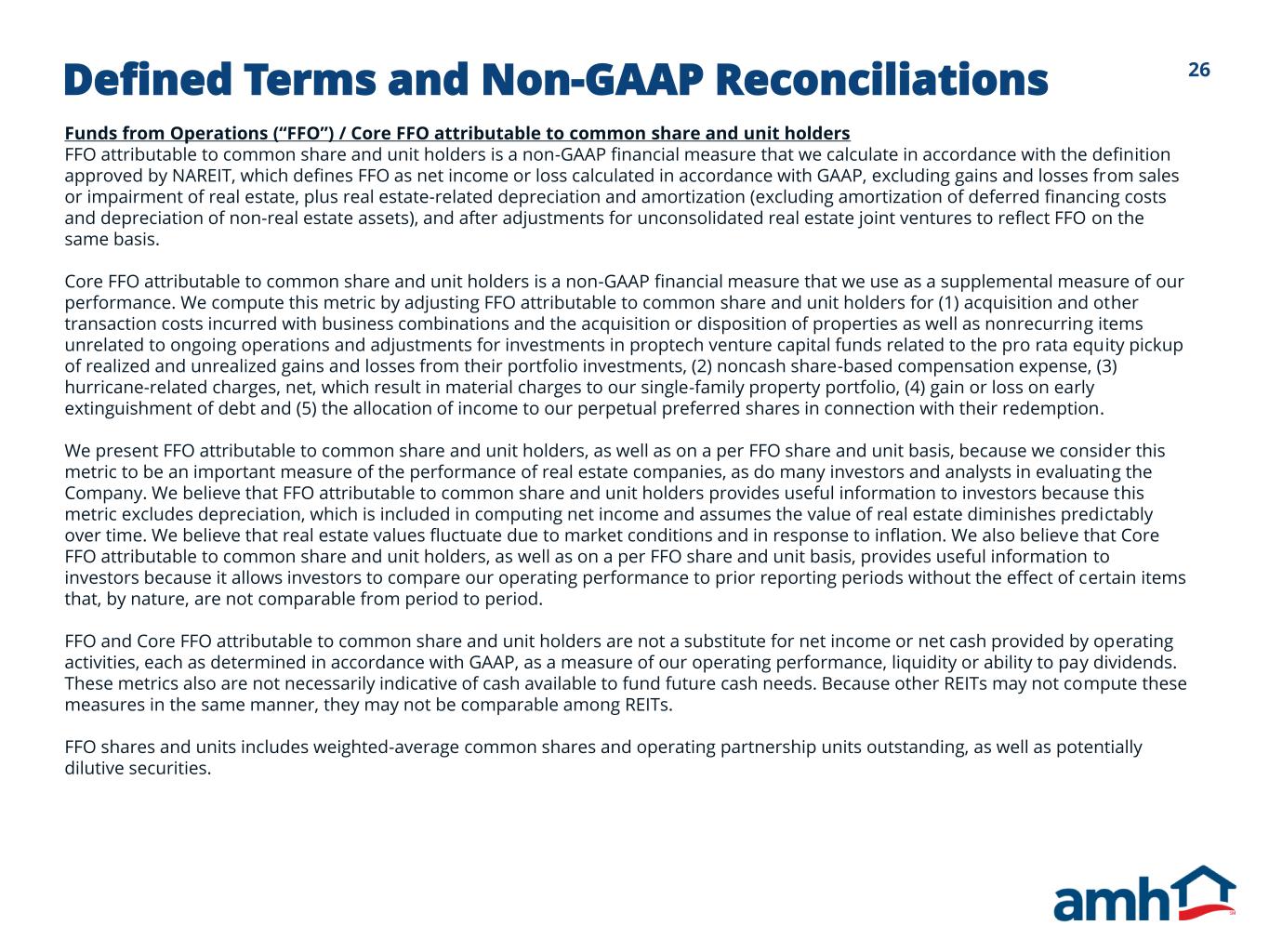 25Defined Terms and Non-GAAP Reconciliations EBITDA / EBITDAre / Adjusted EBITDAre EBITDA is defined as earnings before interest, taxes, depreciation and amortization. EBITDA is a non-GAAP financial measure and is used by us and others as a supplemental measure of performance. EBITDAre is a supplemental non-GAAP financial measure, which we calculate in accordance with the definition approved by the National Association of Real Estate Investment Trusts (“NAREIT”) by adjusting EBITDA for gains and losses from sales or impairments of single-family properties and adjusting for unconsolidated real estate joint ventures on the same basis. Adjusted EBITDAre is a supplemental non-GAAP financial measure calculated by adjusting EBITDAre for (1) acquisition and other transaction costs incurred with business combinations and the acquisition or disposition of properties as well as nonrecurring items unrelated to ongoing operations and adjustments for investments in proptech venture capital funds related to the pro rata equity pickup of realized and unrealized gains and losses from their portfolio investments, (2) noncash share-based compensation expense, (3) hurricane-related charges, net, which result in material charges to our single-family property portfolio and (4) gain or loss on early extinguishment of debt. We believe these metrics provide useful information to investors because they exclude the impact of various income and expense items that are not indicative of operating performance. The following is a reconciliation of net income, as determined in accordance with GAAP, to EBITDA, EBITDAre and Adjusted EBITDAre (amounts in thousands): For the Trailing Twelve Months Ended Sep 30, 2025 Net income 513,011$ Interest expense 184,413 Depreciation and amortization 502,513 EBITDA 1,199,937$ Gain on sale and impairment of single-family properties and other, net (241,810) Adjustments for unconsolidated real estate joint ventures 6,036 EBITDAre 964,163$ Noncash share-based compensation - general and administrative 15,389 Noncash share-based compensation - property management 4,234 Acquisition, other transaction costs and other 12,019 Hurricane-related charges, net 4,980 Loss on early extinguishment of debt 396 Adjusted EBITDAre 1,001,181$