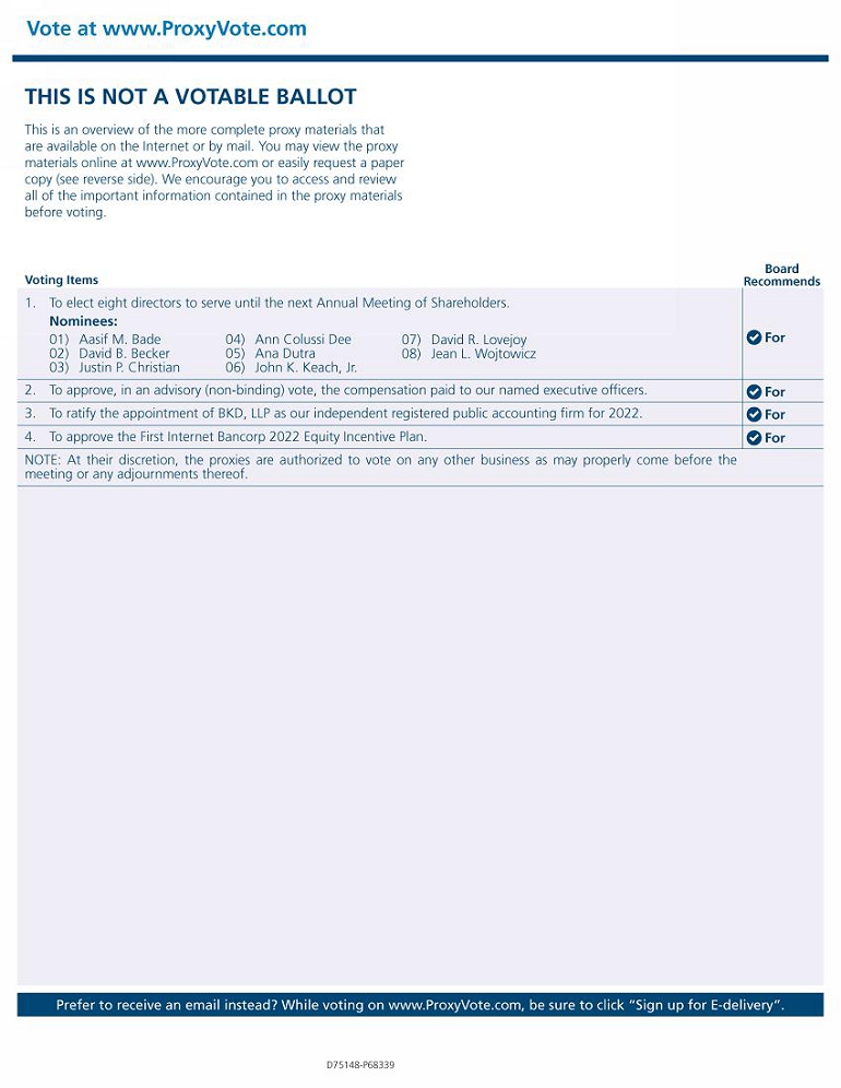 ![]() | Vote at www.ProxyVote.com Prefer to receive an email instead? While voting on www.ProxyVote.com, be sure to click “Sign up for E-delivery”. Voting Items Board Recommends D75148-P68339 THIS IS NOT A VOTABLE BALLOT This is an overview of the more complete proxy materials that are available on the Internet or by mail. You may view the proxy materials online at www.ProxyVote.com or easily request a paper copy (see reverse side). We encourage you to access and review all of the important information contained in the proxy materials before voting. 01) Aasif M. Bade 02) David B. Becker 03) Justin P. Christian 04) Ann Colussi Dee 05) Ana Dutra 06) John K. Keach, Jr. 07) David R. Lovejoy 08) Jean L. Wojtowicz 1. To elect eight directors to serve until the next Annual Meeting of Shareholders. Nominees: 2. To approve, in an advisory (non-binding) vote, the compensation paid to our named executive officers. 3. To ratify the appointment of BKD, LLP as our independent registered public accounting firm for 2022. 4. To approve the First Internet Bancorp 2022 Equity Incentive Plan. NOTE: At their discretion, the proxies are authorized to vote on any other business as may properly come before the meeting or any adjournments thereof. For For For For |