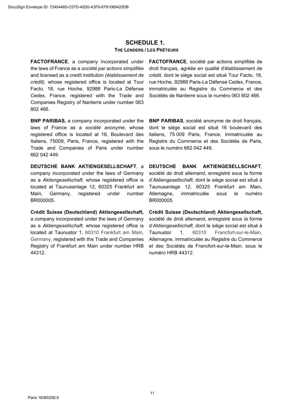 11 Paris 18365258.6 SCHEDULE 1. THE LENDERS / LES PRÊTEURS FACTOFRANCE, a company incorporated under the laws of France as a société par actions simplifiée and licensed as a credit institution (établissement de crédit), whose registered office is located at Tour Facto, 18, rue Hoche, 92988 Paris-La Défense Cedex, France, registered with the Trade and Companies Registry of Nanterre under number 063 802 466. FACTOFRANCE, société par actions simplifiée de droit français, agréée en qualité d'établissement de crédit, dont le siège social est situé Tour Facto, 18, rue Hoche, 92988 Paris-La Défense Cedex, France, immatriculée au Registre du Commerce et des Sociétés de Nanterre sous le numéro 063 802 466. BNP PARIBAS, a company incorporated under the laws of France as a société anonyme, whose registered office is located at 16, Boulevard des Italiens, 75009, Paris, France, registered with the Trade and Companies of Paris under number 662 042 449. BNP PARIBAS, société anonyme de droit français, dont le siège social est situé 16 boulevard des italiens, 75 009 Paris, France, immatriculée au Registre du Commerce et des Sociétés de Paris, sous le numéro 662 042 449. DEUTSCHE BANK AKTIENGESELLSCHAFT, a company incorporated under the laws of Germany as a Aktiengesellschaft, whose registered office is located at Taunusanlage 12, 60325 Frankfurt am Main, Germany, registered under number BR000005. DEUTSCHE BANK AKTIENGESELLSCHAFT, société de droit allemand, enregistré sous la forme d’Aktiengesellschaft, dont le siège social est situé à Taunusanlage 12, 60325 Frankfurt am Main, Allemagne, immatriculée sous le numéro BR000005. Crédit Suisse (Deutschland) Aktiengesellschaft, a company incorporated under the laws of Germany as a Aktiengesellschaft, whose registered office is located at Taunustor 1, 60310 Frankfurt am Main, Germany, registered with the Trade and Companies Registry of Frankfurt am Main under number HRB 44312. Crédit Suisse (Deutschland) Aktiengesellschaft, société de droit allemand, enregistré sous la forme d’Aktiengesellschaft, dont le siège social est situé à Taunustor 1, 60310 Francfort-sur-le-Main, Allemagne, immatriculée au Registre du Commerce et des Sociétés de Francfort-sur-le-Main, sous le numéro HRB 44312. DocuSign Envelope ID: 72404465-C57D-40D0-A3F9-6791069420DB