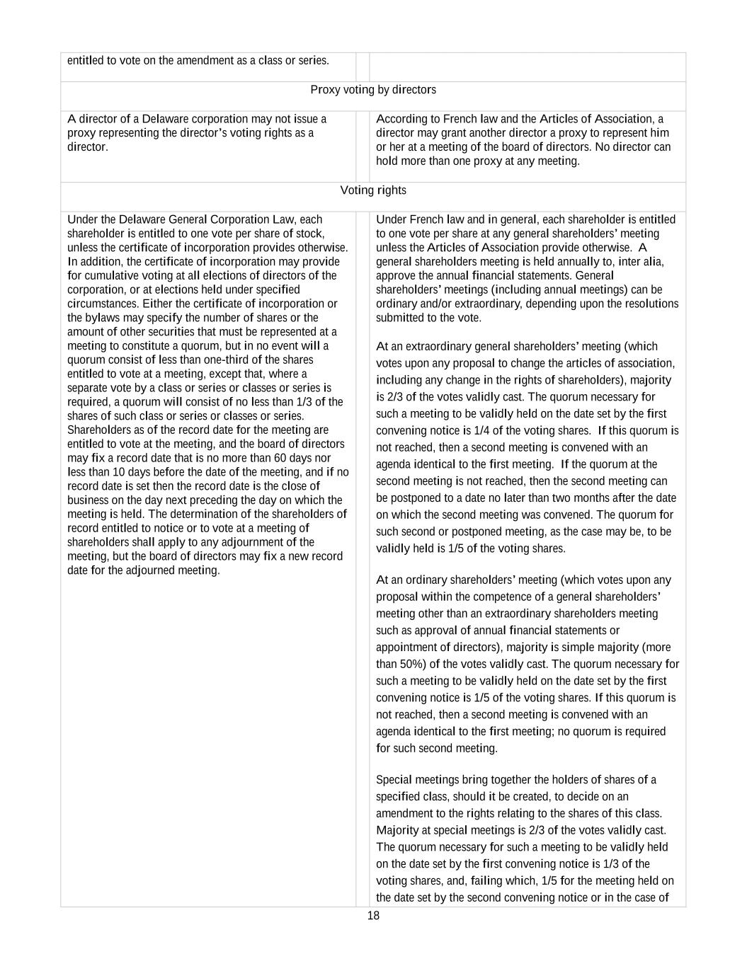 17 Shareholder proxy voting Under the Delaware General Corporation law, at any meeting of stockholders, a stockholder may designate another person to act for such stockholder by proxy, but no such proxy shall be voted or acted upon after three years from its date, unless the proxy provides for a longer period. Under French law and according to the Articles of Association, at any meeting of shareholders, a shareholder may be represented by the intermediary registered on its/his/her behalf; or assign a proxy to another shareholder, to his/her spouse, or to the partner with whom he/she has entered into a civil union (pacte civil de solidarité); or vote by mail; or send a proxy to the company without indicating an assignment, in accordance with the conditions set forth by French law. In this last case, proxies are deemed given to the chairman of the general meeting of shareholders who will vote in favor of the proposals of resolutions presented or approved by the board of directors and against all the other proposals of resolutions. Appraisal Rights Under the Delaware General Corporation law, a holder of shares of any class or series has the right, in specified circumstances, to dissent from a merger or consolidation by demanding payment in cash for the stockholder’s shares equal to the fair value of those shares, as determined by the Delaware Chancery Court in an action timely brought by the corporation or a dissenting stockholder. Delaware law grants these appraisal rights only in the case of mergers or consolidations and not in the case of a sale or transfer of assets or a purchase of assets for shares. Further, no appraisal rights are available for shares of any class or series that is listed on a national securities exchange or held of record by more than 2,000 stockholders, unless the agreement of merger or consolidation requires the holders to accept for their shares anything other than: • shares of stock of the surviving corporation; • shares of another corporation that are either listed on a national securities exchange or held of record by more than 2,000 stockholders; • cash in lieu of fractional shares of the stock described in the two preceding bullet points; or • any combination of the above. In addition, appraisal rights are not available to holders of shares of the surviving corporation in specified mergers that do not require the vote of the stockholders of the surviving corporation. French law does not provide for the payment of cash or the grant of appraisal rights to dissenting shareholders. How to amend the articles of incorporation Under the Delaware General Corporation law, generally a corporation may amend its certificate of incorporation if: • its board of directors has adopted a resolution setting forth the amendment proposed and declared its advisability; and the amendment is adopted by the affirmative votes of a majority (or greater percentage as may be specified by the corporation) of the outstanding shares entitled to vote on the amendment and a majority (or greater percentage as may be specified by the corporation) of the outstanding shares of each class or series of stock, if any, Under French law and pursuant to the Articles of Association, only the extraordinary general meeting of shareholders may amend the articles of association. The amendment is validly adopted by the votes of a two thirds (2/3) majority.