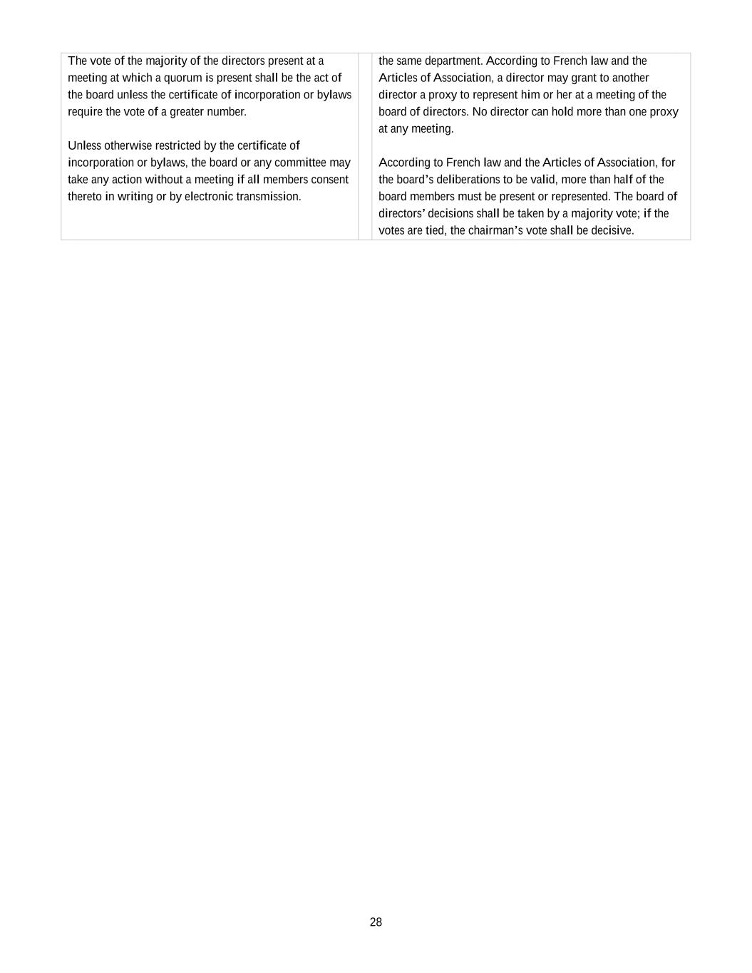 28 The vote of the majority of the directors present at a meeting at which a quorum is present shall be the act of the board unless the certificate of incorporation or bylaws require the vote of a greater number. Unless otherwise restricted by the certificate of incorporation or bylaws, the board or any committee may take any action without a meeting if all members consent thereto in writing or by electronic transmission. the same department. According to French law and the Articles of Association, a director may grant to another director a proxy to represent him or her at a meeting of the board of directors. No director can hold more than one proxy at any meeting. According to French law and the Articles of Association, for the board’s deliberations to be valid, more than half of the board members must be present or represented. The board of directors’ decisions shall be taken by a majority vote; if the votes are tied, the chairman’s vote shall be decisive.