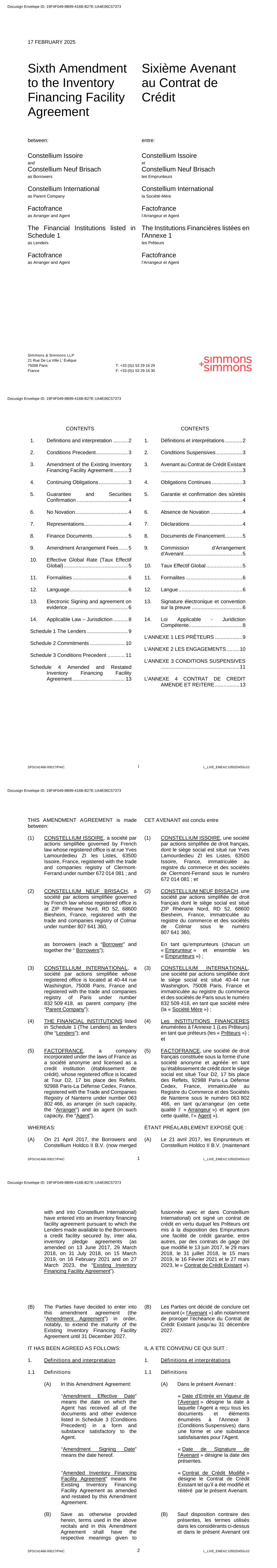 Simmons & Simmons LLP 21 Rue De La Ville L’ Évêque 75008 Paris France T: +33 (0)1 53 29 16 29 F: +33 (0)1 53 29 16 30 17 FEBRUARY 2025 Sixth Amendment to the Inventory Financing Facility Agreement Sixième Avenant au Contrat de Crédit between: entre: Constellium Issoire and Constellium Neuf Brisach as Borrowers Constellium International as Parent Company Factofrance as Arranger and Agent The Financial Institutions listed in Schedule 1 as Lenders Factofrance as Arranger and Agent Constellium Issoire et Constellium Neuf Brisach les Emprunteurs Constellium International la Société-Mère Factofrance l’Arrangeur et Agent The Institutions Financières listées en l'Annexe 1 les Prêteurs Factofrance l’Arrangeur et Agent Docusign Envelope ID: 19F4F049-8B99-416B-B27E-1A4E06C57373 SPS/141466-00017/PAIC i L_LIVE_EMEA2:105020455v10 CONTENTS 1. Definitions and interpretation .......... 2 2. Conditions Precedent ...................... 3 3. Amendment of the Existing Inventory Financing Facility Agreement .......... 3 4. Continuing Obligations .................... 3 5. Guarantee and Securities Confirmation ................................... 4 6. No Novation .................................... 4 7. Representations .............................. 4 8. Finance Documents ........................ 5 9. Amendment Arrangement Fees ...... 5 10. Effective Global Rate (Taux Effectif Global) ............................................ 5 11. Formalities ...................................... 6 12. Language ........................................ 6 13. Electronic Signing and agreement on evidence ......................................... 6 14. Applicable Law – Jurisdiction .......... 8 Schedule 1 The Lenders ............................ 9 Schedule 2 Commitments ........................ 10 Schedule 3 Conditions Precedent ............ 11 Schedule 4 Amended and Restated Inventory Financing Facility Agreement .................................... 13 CONTENTS 1. Définitions et interprétations ............ 2 2. Conditions Suspensives .................. 3 3. Avenant au Contrat de Crédit Existant ........................................................ 3 4. Obligations Continues ..................... 3 5. Garantie et confirmation des sûretés ........................................................ 4 6. Absence de Novation ...................... 4 7. Déclarations .................................... 4 8. Documents de Financement ............ 5 9. Commission d’Arrangement d’Avenant ........................................ 5 10. Taux Effectif Global ......................... 5 11. Formalites ....................................... 6 12. Langue ............................................ 6 13. Signature électronique et convention sur la preuve ................................... 6 14. Loi Applicable - Juridiction Compétente ..................................... 8 L'ANNEXE 1 LES PRÊTEURS ................... 9 L'ANNEXE 2 LES ENGAGEMENTS ......... 10 L'ANNEXE 3 CONDITIONS SUSPENSIVES ...................................................... 11 L'ANNEXE 4 CONTRAT DE CREDIT AMENDE ET REITERE ................. 13 Docusign Envelope ID: 19F4F049-8B99-416B-B27E-1A4E06C57373 SPS/141466-00017/PAIC 1 L_LIVE_EMEA2:105020455v10 THIS AMENDMENT AGREEMENT is made between: CET AVENANT est conclu entre (1) CONSTELLIUM ISSOIRE, a société par actions simplifiée governed by French law whose registered office is at rue Yves Lamourdedieu ZI les Listes, 63500 Issoire, France, registered with the trade and companies registry of Clermont- Ferrand under number 672 014 081 ; and (1) CONSTELLIUM ISSOIRE, une société par actions simplifiée de droit français, dont le siège social est situé rue Yves Lamourdedieu ZI les Listes, 63500 Issoire, France, immatriculée au registre du commerce et des sociétés de Clermont-Ferrand sous le numéro 672 014 081 ; et (2) CONSTELLIUM NEUF BRISACH, a société par actions simplifiée governed by French law whose registered office is at ZIP Rhénane Nord, RD 52, 68600 Biesheim, France, registered with the trade and companies registry of Colmar under number 807 641 360, (2) CONSTELLIUM NEUF BRISACH, une société par actions simplifiée de droit français dont le siège social est situé ZIP Rhénane Nord, RD 52, 68600 Biesheim, France, immatriculée au registre du commerce et des sociétés de Colmar sous le numéro 807 641 360, as borrowers (each a “Borrower” and together the “ Borrowers”); En tant qu’emprunteurs (chacun un « Emprunteur » et ensemble les « Emprunteurs ») ; (3) CONSTELLIUM INTERNATIONAL, a société par actions simplifiée whose registered office is located at 40-44 rue Washington, 75008 Paris, France and registered with the trade and companies registry of Paris under number 832 509 418, as parent company (the “Parent Company”); (3) CONSTELLIUM INTERNATIONAL, une société par actions simplifiée dont le siège social est situé 40-44 rue Washington, 75008 Paris, France et immatriculée au registre du commerce et des sociétés de Paris sous le numéro 832 509 418, en tant que société mère (la « Société Mère ») ; (4) THE FINANCIAL INSTITUTIONS listed in Schedule 1 (The Lenders) as lenders (the “Lenders”); and (4) Les INSTITUTIONS FINANCIERES énumérées à l'Annexe 1 (Les Prêteurs) en tant que préteurs (les « Prêteurs ») ; et (5) FACTOFRANCE, a company incorporated under the laws of France as a société anonyme and licensed as a credit institution (établissement de crédit), whose registered office is located at Tour D2, 17 bis place des Reflets, 92988 Paris-La Défense Cedex, France, registered with the Trade and Companies Registry of Nanterre under number 063 802 466, as arranger (in such capacity, the “Arranger”) and as agent (in such capacity, the “Agent”). (5) FACTOFRANCE, une société de droit français constituée sous la forme d’une société anonyme et agréée en tant qu’établissement de crédit dont le siège s