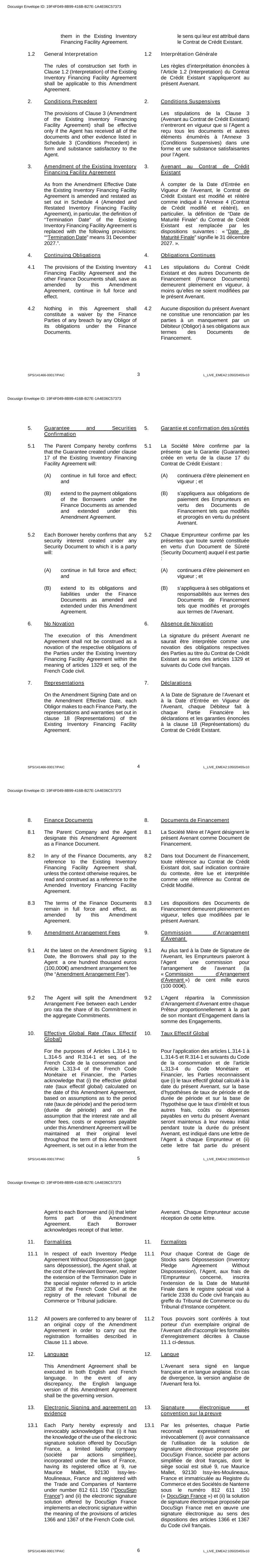 SPS/141466-00017/PAIC 3 L_LIVE_EMEA2:105020455v10 them in the Existing Inventory Financing Facility Agreement. le sens qui leur est attribué dans le Contrat de Crédit Existant. 1.2 General Interpretation 1.2 Interprétation Générale The rules of construction set forth in Clause 1.2 (Interpretation) of the Existing Inventory Financing Facility Agreement shall be applicable to this Amendment Agreement. Les règles d’interprétation énoncées à l’Article 1.2 (Interpretation) du Contrat de Crédit Existant s’appliqueront au présent Avenant. 2. Conditions Precedent 2. Conditions Suspensives The provisions of Clause 3 (Amendment of the Existing Inventory Financing Facility Agreement) shall be effective only if the Agent has received all of the documents and other evidence listed in Schedule 3 (Conditions Precedent) in form and substance satisfactory to the Agent. Les stipulations de la Clause 3 (Avenant au Contrat de Crédit Existant) n’entreront en vigueur que si l’Agent a reçu tous les documents et autres éléments énumérés à l'Annexe 3 (Conditions Suspensives) dans une forme et une substance satisfaisantes pour l’Agent. 3. Amendment of the Existing Inventory Financing Facility Agreement 3. Avenant au Contrat de Crédit Existant As from the Amendment Effective Date the Existing Inventory Financing Facility Agreement is amended and restated as set out in Schedule 4 (Amended and Restated Inventory Financing Facility Agreement), in particular, the definition of “Termination Date” of the Existing Inventory Financing Facility Agreement is replaced with the following provisions: ““Termination Date” means 31 December 2027.”. À compter de la Date d’Entrée en Vigueur de l’Avenant, le Contrat de Crédit Existant est modifié et réitéré comme indiqué à l'Annexe 4 (Contrat de Crédit modifié et réitéré), en particulier, la définition de “Date de Maturité Finale” du Contrat de Crédit Existant est remplacée par les dispositions suivantes : « ”Date de Maturité Finale” signifie le 31 décembre 2027. ». 4. Continuing Obligations 4. Obligations Continues 4.1 The provisions of the Existing Inventory Financing Facility Agreement and the other Finance Documents shall, save as amended by this Amendment Agreement, continue in full force and effect. 4.1 Les stipulations du Contrat Crédit Existant et des autres Documents de Financement (Finance Documents) demeurent pleinement en vigueur, à moins qu’elles ne soient modifiées par le présent Avenant. 4.2 Nothing in this Agreement shall constitute a waiver by the Finance Parties of any breach by any Obligor of its obligations under the Finance Documents. 4.2 Aucune disposition du présent Avenant ne constitue une renonciation par les parties à un manquement par un Débiteur (Obligor) à ses obligations aux termes des Documents de Financement. Docusign Envelope ID: 19F4F049-8B99-416B-B27E-1A4E06C57373 SPS/141466-00017/PAIC 4 L_LIVE_EMEA2:105020455v10 5. Guarantee and Securities Confirmation 5. Garantie et confirmation des sûretés 5.1 The Parent Company hereby confirms that the Guarantee created under clause 17 of the Existing Inventory Financing Facility Agreement will: 5.1 La Société Mère confirme par la présente que la Garantie (Guarantee) créée en vertu de la clause 17 du Contrat de Crédit Existant : (A) continue in full force and effect; and (A) continuera d’être pleinement en vigueur ; et (B) extend to the payment obligations of the Borrowers under the Finance Documents as amended and extended under this Amendment Agreement. (B) s’appliquera aux obligations de paiement des Emprunteurs en vertu des Documents de Financement tels que modifiés et prorogés en vertu du présent Avenant. 5.2 Each Borrower hereby confirms that any security interest created under any Security Document to which it is a party will: 5.2 Chaque Emprunteur confirme par les présentes que toute sureté constituée en vertu d’un Document de Sûreté (Security Document) auquel il est partie : (A) continue in full force and effect; and (A) continuera d’être pleinement en vigueur ; et (B) extend to its obligations and liabilities under the Finance Documents as amended and extended under this Amendment Agreement. (B) s’appliquera à ses obligations et responsabilités aux termes des Documents de Financement tels que modifiés et prorogés aux termes de l’Avenant. 6. No Novation 6. Absence de Novation The execution of this Amendment Agreement shall not be construed as a novation of the respective obligations of the Parties under the Existing Inventory Financing Facility Agreement within the meaning of articles 1329 et seq. of the French Code civil. La signature du présent Avenant ne saurait être interprétée comme une novation des obligations respectives des Parties au titre du Contrat de Crédit Existant au sens des articles 1329 et suivants du Code civil français. 7. Representations 7. Déclarations On the Amendment Signing Date and on the Amendment Effective Date, each Obligor makes to each Finance Party, the representations and warranties set out in clause 18 (Representations) of the Existing Inventory Financing Facility Agreement. A la Date de Signature de l’Avenant et à la Date d’Entrée en Vigueur de l’Avenant, chaque Débiteur fait à chaque Partie Financière les déclarations et les garanties énoncées à la clause 18 (Représentations) du Contrat de Crédit Existant. Docusign Envelope ID: 19F4F049-8B99-416B-B27E-1A4E06C57373 SPS/141466-00017/PAIC 5 L_LIVE_EMEA2:105020455v10 8. Finance Documents 8. Documents de Financement 8.1 The Parent Company and the Agent designate this Amendment Agreement as a Finance Document. 8.1 La Société Mère et l’Agent désignent le présent Avenant comme Document de Financement. 8.2 In any of the Finance Documents, any reference to the Existing Inventory Financing Facility Agreement shall, unless the context otherwise requires, be read and construed a
