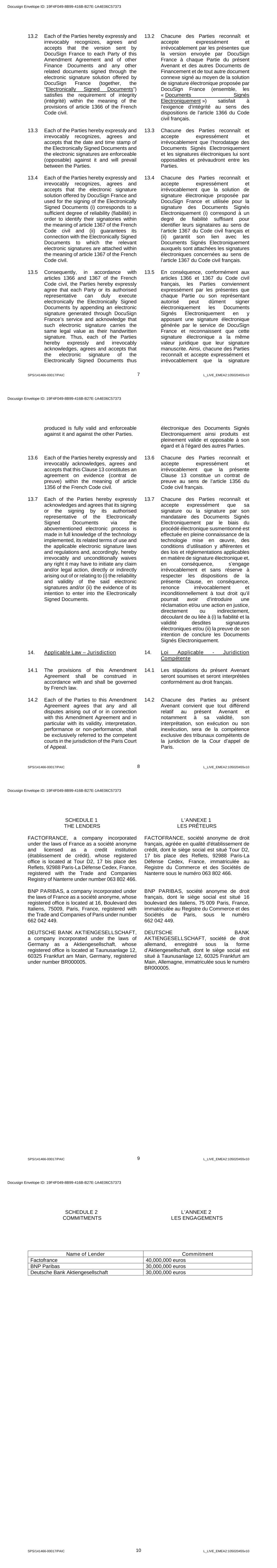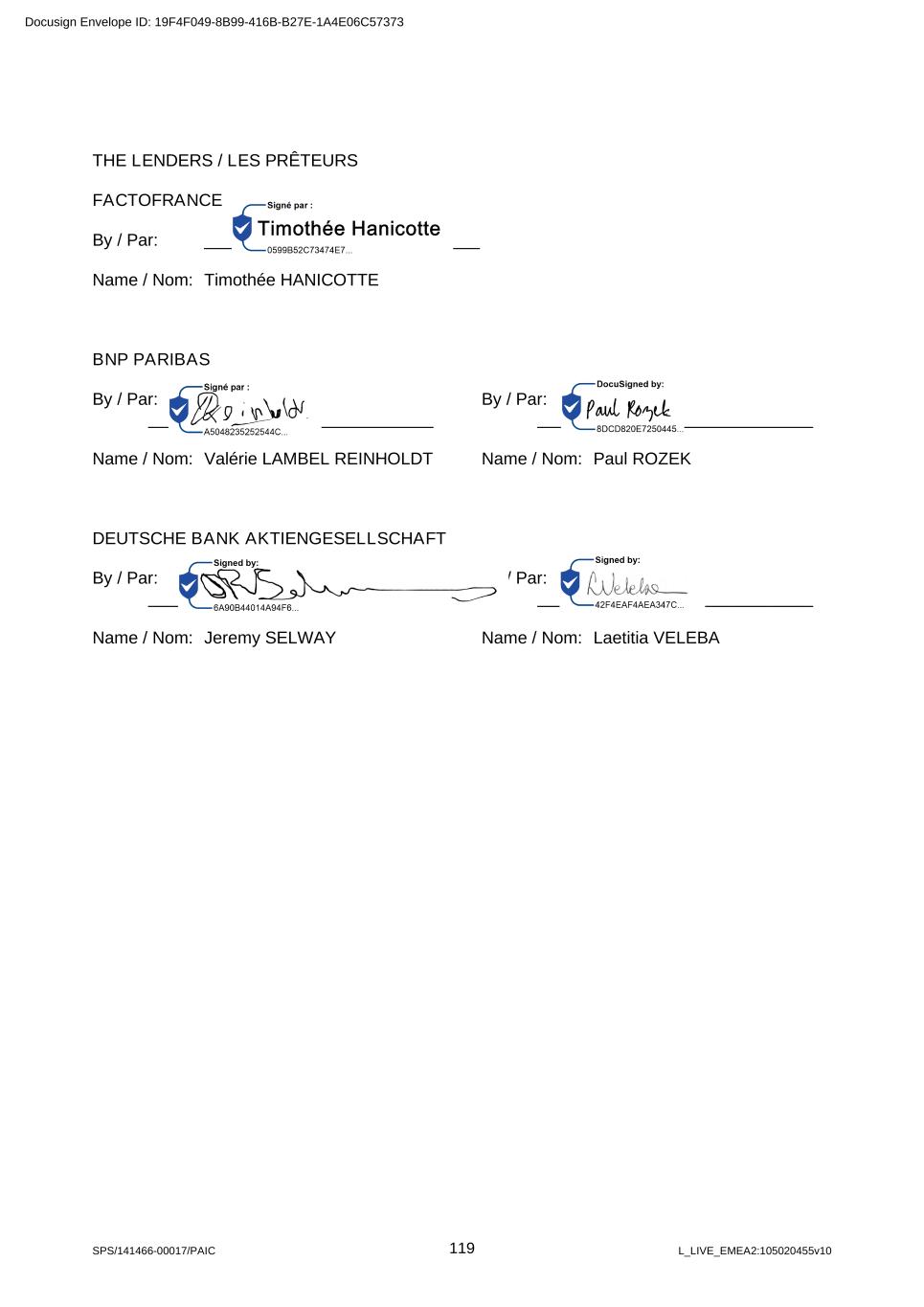 SPS/141466-00017/PAIC 119 L_LIVE_EMEA2:105020455v10 THE LENDERS / LES PRÊTEURS FACTOFRANCE By / Par: _____________________________ Name / Nom: Timothée HANICOTTE BNP PARIBAS By / Par: ______________________________ Name / Nom: Valérie LAMBEL REINHOLDT By / Par: _____________________________ Name / Nom: Paul ROZEK DEUTSCHE BANK AKTIENGESELLSCHAFT By / Par: ______________________________ Name / Nom: Jeremy SELWAY By / Par: _____________________________ Name / Nom: Laetitia VELEBA Docusign Envelope ID: 19F4F049-8B99-416B-B27E-1A4E06C57373