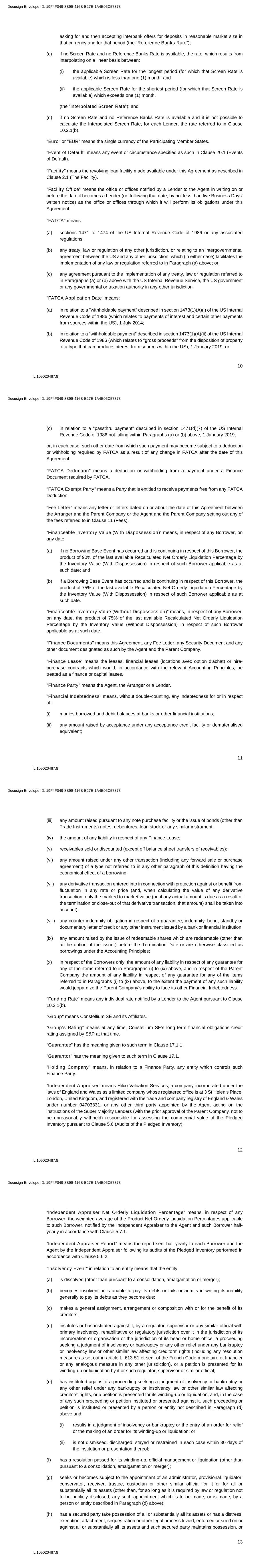 14 L 105020467.8 any such process is not dismissed, discharged, stayed or restrained, in each case within 30 days thereafter; (i) causes or is subject to any event with respect to it which, under the applicable laws of any jurisdiction, has an analogous effect to any of the events specified in Paragraphs (a) to (h) above; or (j) takes any action in furtherance of, or indicating its consent to, approval of, or acquiescence in, any of the foregoing acts. "Insolvency Proceeding" means in respect of any Obligor, any of the following events: (a) it has passed any corporate resolution in furtherance or approving the opening of, or it has instituted legal proceedings, or a third party has made any petition or filing, in relation to its suspension of payments (cessation des paiements), a moratorium of its Financial Indebtedness, its dissolution, the opening of proceedings for sauvegarde (including sauvegarde accélérée), redressement judiciaire or liquidation judiciaire or reorganisation of such entity other than a solvent liquidation or reorganisation of such entity; (b) a judgement for sauvegarde (including sauvegarde accélérée), redressement judiciaire or liquidation judiciaire or for cession totale ou partielle de l'entreprise is rendered in relation to such entity under Articles L.620-1 to L.696-1 of the French Code de commerce; (c) it is in a state of cessation des paiements within the meaning of Article L.631-1 of the French Code de commerce; or (d) any analogous proceeding is started in any other relevant jurisdiction. "Interest Period" means, in relation to a Loan, the thirty-day period (as this period may be reduced pursuant to Clause 9.1.1 or Clause 9.1.3) starting on the Utilisation Date of that Loan and, in relation to an Unpaid Sum, each period determined in accordance with Clause 8.3 (Default interest). “Inventory Pledge Agreements With Dispossession” means, in respect of each Borrower, the inventory pledge agreement with dispossession (acte de gage avec dépossession) entered into on 13 June 2017 between such Borrower and the Finance Parties and, in respect of Constellium Issoire, the inventory pledge agreement with dispossession (acte de gage avec dépossession) entered into on 29 March 2018 between Constellium Issoire and the Finance Parties, and “Inventory Pledge Agreement With Dispossession” means any of them. “Inventory Pledge Agreement Without Dispossession” means, in respect of each Borrower, the inventory pledge agreement without dispossession (acte de gage sans dépossession) entered into on 13 June 2017 between such Borrower and the Finance Parties. “Inventory Turn Ratio” means, in respect of any Borrower, on any Quarter Date, the ratio of (i) the sum of the aggregate amount of sales of such Borrower during the 365 days immediately preceding such Quarter Date and (ii) the average of the sum of the Inventory Value (With Dispossession) and the Inventory Value (Without Dispossession) of such Borrower as indicated in the Escrow Agent Certificates and Escrow Agent Statements (or, if not delivered in accordance with Clause 5.5.2, in the statements as to the position of inventory (registre des positions de stocks)) delivered to the Agent in the three different calendar months immediately preceding such Quarter Date provided in accordance with Clause 5.5.2(a)) delivered to the Agent. Docusign Envelope ID: 19F4F049-8B99-416B-B27E-1A4E06C57373 15 L 105020467.8 “Inventory Value (With Dispossession)” means, on any date, in respect of any Borrower, the book value as at such date of any Eligible Inventory of such Borrower pledged under any Inventory Pledge Agreement With Dispossession entered into by such Borrower, as set out in the accounting systems of the Borrower and determined according to the same methodology as the one used by the relevant Borrower in its accounting as at the Signing Date. “Inventory Value (Without Dispossession)” means, on any date, in respect of any Borrower, the book value as at such date of any Eligible Inventory of such Borrower pledged under the Inventory Pledge Agreement Without Dispossession entered into by such Borrower, as set out in the accounting systems of the Borrower and determined according to the same methodology as the one used by the relevant Borrower in its accounting as at the Signing Date. “Legal Reservations” means any legal reservations that are specifically made in the legal opinions delivered in relation to this Agreement. "Lender" means: (a) any Original Lender; and (b) any entity (excluding, for the avoidance of doubt, any natural person) which has become a Party in accordance with Clause 21 (Changes to the Parties), which in each case has not ceased to be a Party in accordance with the terms of this Agreement. "Loan" means a Tranche A Loan or a Tranche B Loan. “London Metal Exchange Price” means, on any date, the last bid and offer price for aluminium quoted during the second ring session at the London Metal Exchange and as shown on the London Metal Exchange website as at such date. “LTM Adjusted EBITDA” means, in relation to any Borrower, on any date, the segment adjusted EBITDA of such Borrower for the last twelve months, determined in accordance with the definition of segment adjusted EBITDA of the Group set out in the annual report filed by Constellium SE with the United States Securities and Exchange Commission (Form 10-K) (segment adjusted EBITDA of the Group being defined in such report as income/(loss) from continuing operations before income taxes, results from joint ventures, net finance costs, other expenses and depreciation and amortization as adjusted to exclude restructuring costs, impairment charges, unrealized gains or losses on derivatives and on foreign exchange differences on transactions that do not qualify for hedge accounting, metal price lag, share-based compensation expense, non-operating gains / (losses) on pension and other post-employment benefits, factoring expens