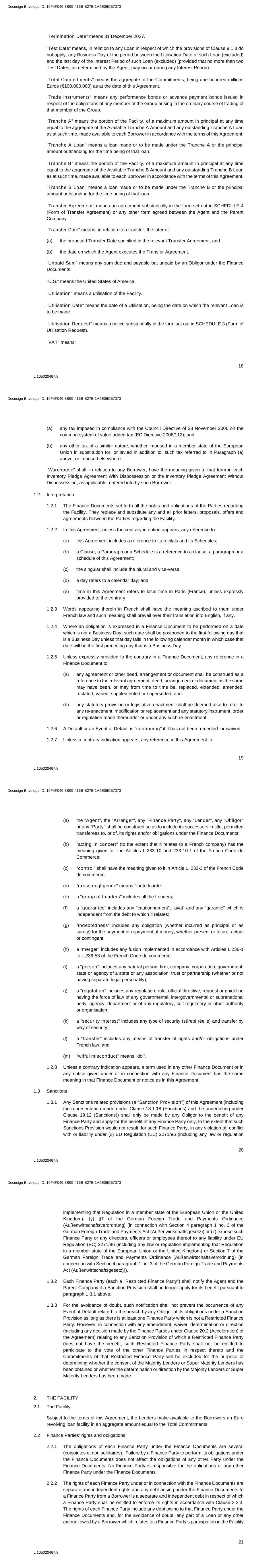 18 L 105020467.8 "Termination Date” means 31 December 2027. “Test Date” means, in relation to any Loan in respect of which the provisions of Clause 9.1.3 do not apply, any Business Day of the period between the Utilisation Date of such Loan (excluded) and the last day of the Interest Period of such Loan (excluded) (provided that no more than two Test Dates, as determined by the Agent, may occur during any Interest Period). "Total Commitments" means the aggregate of the Commitments, being one hundred millions Euros (€100,000,000) as at the date of this Agreement. "Trade Instruments" means any performance bonds or advance payment bonds issued in respect of the obligations of any member of the Group arising in the ordinary course of trading of that member of the Group. “Tranche A” means the portion of the Facility, of a maximum amount in principal at any time equal to the aggregate of the Available Tranche A Amount and any outstanding Tranche A Loan as at such time, made available to each Borrower in accordance with the terms of this Agreement. "Tranche A Loan" means a loan made or to be made under the Tranche A or the principal amount outstanding for the time being of that loan. “Tranche B” means the portion of the Facility, of a maximum amount in principal at any time equal to the aggregate of the Available Tranche B Amount and any outstanding Tranche B Loan as at such time, made available to each Borrower in accordance with the terms of this Agreement. "Tranche B Loan" means a loan made or to be made under the Tranche B or the principal amount outstanding for the time being of that loan. "Transfer Agreement" means an agreement substantially in the form set out in SCHEDULE 4 (Form of Transfer Agreement) or any other form agreed between the Agent and the Parent Company. "Transfer Date" means, in relation to a transfer, the later of: (a) the proposed Transfer Date specified in the relevant Transfer Agreement; and (b) the date on which the Agent executes the Transfer Agreement. "Unpaid Sum" means any sum due and payable but unpaid by an Obligor under the Finance Documents. “U.S.” means the United States of America. "Utilisation" means a utilisation of the Facility. "Utilisation Date" means the date of a Utilisation, being the date on which the relevant Loan is to be made. "Utilisation Request" means a notice substantially in the form set out in SCHEDULE 3 (Form of Utilisation Request). "VAT" means: Docusign Envelope ID: 19F4F049-8B99-416B-B27E-1A4E06C57373 19 L 105020467.8 (a) any tax imposed in compliance with the Council Directive of 28 November 2006 on the common system of value added tax (EC Directive 2006/112); and (b) any other tax of a similar nature, whether imposed in a member state of the European Union in substitution for, or levied in addition to, such tax referred to in Paragraph (a) above, or imposed elsewhere. “Warehouse” shall, in relation to any Borrower, have the meaning given to that term in each Inventory Pledge Agreement With Dispossession or the Inventory Pledge Agreement Without Dispossession, as applicable, entered into by such Borrower. 1.2 Interpretation 1.2.1 The Finance Documents set forth all the rights and obligations of the Parties regarding the Facility. They replace and substitute any and all prior letters, proposals, offers and agreements between the Parties regarding the Facility. 1.2.2 In this Agreement, unless the contrary intention appears, any reference to: (a) this Agreement includes a reference to its recitals and its Schedules; (b) a Clause, a Paragraph or a Schedule is a reference to a clause, a paragraph or a schedule of this Agreement; (c) the singular shall include the plural and vice-versa; (d) a day refers to a calendar day; and (e) time in this Agreement refers to local time in Paris (France), unless expressly provided to the contrary. 1.2.3 Words appearing therein in French shall have the meaning ascribed to them under French law and such meaning shall prevail over their translation into English, if any. 1.2.4 Where an obligation is expressed in a Finance Document to be performed on a date which is not a Business Day, such date shall be postponed to the first following day that is a Business Day unless that day falls in the following calendar month in which case that date will be the first preceding day that is a Business Day. 1.2.5 Unless expressly provided to the contrary in a Finance Document, any reference in a Finance Document to: (a) any agreement or other deed, arrangement or document shall be construed as a reference to the relevant agreement, deed, arrangement or document as the same may have been, or may from time to time be, replaced, extended, amended, restated, varied, supplemented or superseded; and (b) any statutory provision or legislative enactment shall be deemed also to refer to any re-enactment, modification or replacement and any statutory instrument, order or regulation made thereunder or under any such re-enactment. 1.2.6 A Default or an Event of Default is "continuing" if it has not been remedied or waived. 1.2.7 Unless a contrary indication appears, any reference in this Agreement to: Docusign Envelope ID: 19F4F049-8B99-416B-B27E-1A4E06C57373 20 L 105020467.8 (a) the "Agent", the "Arranger", any "Finance Party", any "Lender", any "Obligor" or any "Party" shall be construed so as to include its successors in title, permitted transferees to, or of, its rights and/or obligations under the Finance Documents; (b) "acting in concert" (to the extent that it relates to a French company) has the meaning given to it in Articles L.233-10 and 233-10-1 of the French Code de Commerce; (c) "control" shall have the meaning given to it in Article L. 233-3 of the French Code de commerce; (d) "gross negligence" means "faute lourde"; (e) a "group of Lenders" includes all the Lenders; (f) a "guarantee" includes any "cautionnement", "aval" and any "garantie" which is independent from the debt to which it relates; (g