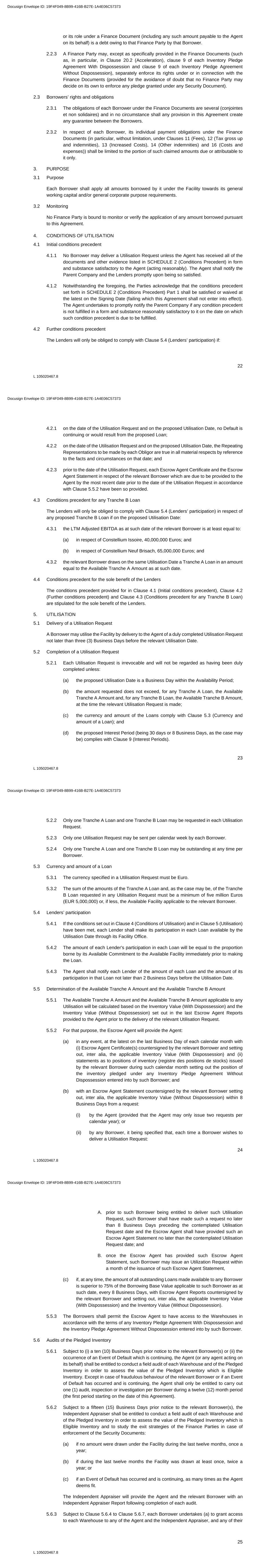 22 L 105020467.8 or its role under a Finance Document (including any such amount payable to the Agent on its behalf) is a debt owing to that Finance Party by that Borrower. 2.2.3 A Finance Party may, except as specifically provided in the Finance Documents (such as, in particular, in Clause 20.2 (Acceleration), clause 9 of each Inventory Pledge Agreement With Dispossession and clause 9 of each Inventory Pledge Agreement Without Dispossession), separately enforce its rights under or in connection with the Finance Documents (provided for the avoidance of doubt that no Finance Party may decide on its own to enforce any pledge granted under any Security Document). 2.3 Borrowers’ rights and obligations 2.3.1 The obligations of each Borrower under the Finance Documents are several (conjointes et non solidaires) and in no circumstance shall any provision in this Agreement create any guarantee between the Borrowers. 2.3.2 In respect of each Borrower, its individual payment obligations under the Finance Documents (in particular, without limitation, under Clauses 11 (Fees), 12 (Tax gross up and indemnities), 13 (Increased Costs), 14 (Other indemnities) and 16 (Costs and expenses)) shall be limited to the portion of such claimed amounts due or attributable to it only. 3. PURPOSE 3.1 Purpose Each Borrower shall apply all amounts borrowed by it under the Facility towards its general working capital and/or general corporate purpose requirements. 3.2 Monitoring No Finance Party is bound to monitor or verify the application of any amount borrowed pursuant to this Agreement. 4. CONDITIONS OF UTILISATION 4.1 Initial conditions precedent 4.1.1 No Borrower may deliver a Utilisation Request unless the Agent has received all of the documents and other evidence listed in SCHEDULE 2 (Conditions Precedent) in form and substance satisfactory to the Agent (acting reasonably). The Agent shall notify the Parent Company and the Lenders promptly upon being so satisfied. 4.1.2 Notwithstanding the foregoing, the Parties acknowledge that the conditions precedent set forth in SCHEDULE 2 (Conditions Precedent) Part 1 shall be satisfied or waived at the latest on the Signing Date (failing which this Agreement shall not enter into effect). The Agent undertakes to promptly notify the Parent Company if any condition precedent is not fulfilled in a form and substance reasonably satisfactory to it on the date on which such condition precedent is due to be fulfilled. 4.2 Further conditions precedent The Lenders will only be obliged to comply with Clause 5.4 (Lenders’ participation) if: Docusign Envelope ID: 19F4F049-8B99-416B-B27E-1A4E06C57373 23 L 105020467.8 4.2.1 on the date of the Utilisation Request and on the proposed Utilisation Date, no Default is continuing or would result from the proposed Loan; 4.2.2 on the date of the Utilisation Request and on the proposed Utilisation Date, the Repeating Representations to be made by each Obligor are true in all material respects by reference to the facts and circumstances on that date; and 4.2.3 prior to the date of the Utilisation Request, each Escrow Agent Certificate and the Escrow Agent Statement in respect of the relevant Borrower which are due to be provided to the Agent by the most recent date prior to the date of the Utilisation Request in accordance with Clause 5.5.2 have been so provided. 4.3 Conditions precedent for any Tranche B Loan The Lenders will only be obliged to comply with Clause 5.4 (Lenders’ participation) in respect of any proposed Tranche B Loan if on the proposed Utilisation Date: 4.3.1 the LTM Adjusted EBITDA as at such date of the relevant Borrower is at least equal to: (a) in respect of Constellium Issoire, 40,000,000 Euros; and (b) in respect of Constellium Neuf Brisach, 65,000,000 Euros; and 4.3.2 the relevant Borrower draws on the same Utilisation Date a Tranche A Loan in an amount equal to the Available Tranche A Amount as at such date. 4.4 Conditions precedent for the sole benefit of the Lenders The conditions precedent provided for in Clause 4.1 (Initial conditions precedent), Clause 4.2 (Further conditions precedent) and Clause 4.3 (Conditions precedent for any Tranche B Loan) are stipulated for the sole benefit of the Lenders. 5. UTILISATION 5.1 Delivery of a Utilisation Request A Borrower may utilise the Facility by delivery to the Agent of a duly completed Utilisation Request not later than three (3) Business Days before the relevant Utilisation Date. 5.2 Completion of a Utilisation Request 5.2.1 Each Utilisation Request is irrevocable and will not be regarded as having been duly completed unless: (a) the proposed Utilisation Date is a Business Day within the Availability Period; (b) the amount requested does not exceed, for any Tranche A Loan, the Available Tranche A Amount and, for any Tranche B Loan, the Available Tranche B Amount, at the time the relevant Utilisation Request is made; (c) the currency and amount of the Loans comply with Clause 5.3 (Currency and amount of a Loan); and (d) the proposed Interest Period (being 30 days or 8 Business Days, as the case may be) complies with Clause 9 (Interest Periods). Docusign Envelope ID: 19F4F049-8B99-416B-B27E-1A4E06C57373 24 L 105020467.8 5.2.2 Only one Tranche A Loan and one Tranche B Loan may be requested in each Utilisation Request. 5.2.3 Only one Utilisation Request may be sent per calendar week by each Borrower. 5.2.4 Only one Tranche A Loan and one Tranche B Loan may be outstanding at any time per Borrower. 5.3 Currency and amount of a Loan 5.3.1 The currency specified in a Utilisation Request must be Euro. 5.3.2 The sum of the amounts of the Tranche A Loan and, as the case may be, of the Tranche B Loan requested in any Utilisation Request must be a minimum of five million Euros (EUR 5,000,000) or, if less, the Available Facility applicable to the relevant Borrower. 5.4 Lenders’ participation 5.4.1 If the conditions set out in Clause 4 (Conditions of Utilisation) and in Clause 5 (