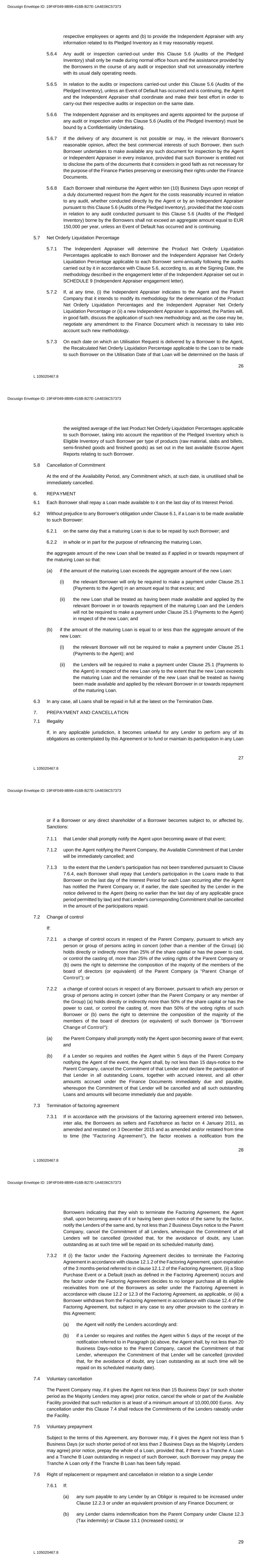 26 L 105020467.8 respective employees or agents and (b) to provide the Independent Appraiser with any information related to its Pledged Inventory as it may reasonably request. 5.6.4 Any audit or inspection carried-out under this Clause 5.6 (Audits of the Pledged Inventory) shall only be made during normal office hours and the assistance provided by the Borrowers in the course of any audit or inspection shall not unreasonably interfere with its usual daily operating needs. 5.6.5 In relation to the audits or inspections carried-out under this Clause 5.6 (Audits of the Pledged Inventory), unless an Event of Default has occurred and is continuing, the Agent and the Independent Appraiser shall coordinate and make their best effort in order to carry-out their respective audits or inspection on the same date. 5.6.6 The Independent Appraiser and its employees and agents appointed for the purpose of any audit or inspection under this Clause 5.6 (Audits of the Pledged Inventory) must be bound by a Confidentiality Undertaking. 5.6.7 If the delivery of any document is not possible or may, in the relevant Borrower's reasonable opinion, affect the best commercial interests of such Borrower, then such Borrower undertakes to make available any such document for inspection by the Agent or Independent Appraiser in every instance, provided that such Borrower is entitled not to disclose the parts of the documents that it considers in good faith as not necessary for the purpose of the Finance Parties preserving or exercising their rights under the Finance Documents. 5.6.8 Each Borrower shall reimburse the Agent within ten (10) Business Days upon receipt of a duly documented request from the Agent for the costs reasonably incurred in relation to any audit, whether conducted directly by the Agent or by an Independent Appraiser pursuant to this Clause 5.6 (Audits of the Pledged Inventory), provided that the total costs in relation to any audit conducted pursuant to this Clause 5.6 (Audits of the Pledged Inventory) borne by the Borrowers shall not exceed an aggregate amount equal to EUR 150,000 per year, unless an Event of Default has occurred and is continuing. 5.7 Net Orderly Liquidation Percentage 5.7.1 The Independent Appraiser will determine the Product Net Orderly Liquidation Percentages applicable to each Borrower and the Independent Appraiser Net Orderly Liquidation Percentage applicable to each Borrower semi-annually following the audits carried out by it in accordance with Clause 5.6, according to, as at the Signing Date, the methodology described in the engagement letter of the Independent Appraiser set out in SCHEDULE 9 (Independent Appraiser engagement letter). 5.7.2 If, at any time, (i) the Independent Appraiser indicates to the Agent and the Parent Company that it intends to modify its methodology for the determination of the Product Net Orderly Liquidation Percentages and the Independent Appraiser Net Orderly Liquidation Percentage or (ii) a new Independent Appraiser is appointed, the Parties will, in good faith, discuss the application of such new methodology and, as the case may be, negotiate any amendment to the Finance Document which is necessary to take into account such new methodology. 5.7.3 On each date on which an Utilisation Request is delivered by a Borrower to the Agent, the Recalculated Net Orderly Liquidation Percentage applicable to the Loan to be made to such Borrower on the Utilisation Date of that Loan will be determined on the basis of Docusign Envelope ID: 19F4F049-8B99-416B-B27E-1A4E06C57373 27 L 105020467.8 the weighted average of the last Product Net Orderly Liquidation Percentages applicable to such Borrower, taking into account the repartition of the Pledged Inventory which is Eligible Inventory of such Borrower per type of products (raw material, slabs and billets, semi-finished goods and finished goods) as set out in the last available Escrow Agent Reports relating to such Borrower. 5.8 Cancellation of Commitment At the end of the Availability Period, any Commitment which, at such date, is unutilised shall be immediately cancelled. 6. REPAYMENT 6.1 Each Borrower shall repay a Loan made available to it on the last day of its Interest Period. 6.2 Without prejudice to any Borrower's obligation under Clause 6.1, if a Loan is to be made available to such Borrower: 6.2.1 on the same day that a maturing Loan is due to be repaid by such Borrower; and 6.2.2 in whole or in part for the purpose of refinancing the maturing Loan, the aggregate amount of the new Loan shall be treated as if applied in or towards repayment of the maturing Loan so that: (a) if the amount of the maturing Loan exceeds the aggregate amount of the new Loan: (i) the relevant Borrower will only be required to make a payment under Clause 25.1 (Payments to the Agent) in an amount equal to that excess; and (ii) the new Loan shall be treated as having been made available and applied by the relevant Borrower in or towards repayment of the maturing Loan and the Lenders will not be required to make a payment under Clause 25.1 (Payments to the Agent) in respect of the new Loan; and (b) if the amount of the maturing Loan is equal to or less than the aggregate amount of the new Loan: (i) the relevant Borrower will not be required to make a payment under Clause 25.1 (Payments to the Agent); and (ii) the Lenders will be required to make a payment under Clause 25.1 (Payments to the Agent) in respect of the new Loan only to the extent that the new Loan exceeds the maturing Loan and the remainder of the new Loan shall be treated as having been made available and applied by the relevant Borrower in or towards repayment of the maturing Loan. 6.3 In any case, all Loans shall be repaid in full at the latest on the Termination Date. 7. PREPAYMENT AND CANCELLATION 7.1 Illegality If, in any applicable jurisdiction, it becomes unlawful for any Lender to perform any of its obligations as contemplated by this Agreement or to fund or