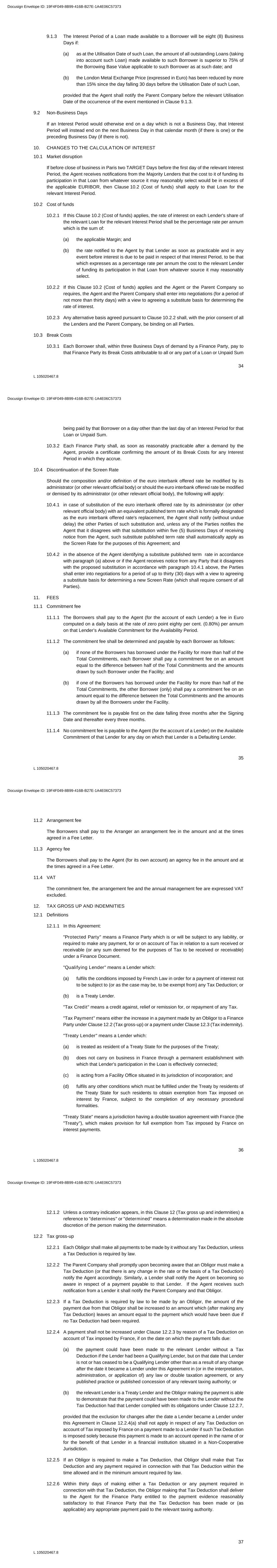 34 L 105020467.8 9.1.3 The Interest Period of a Loan made available to a Borrower will be eight (8) Business Days if: (a) as at the Utilisation Date of such Loan, the amount of all outstanding Loans (taking into account such Loan) made available to such Borrower is superior to 75% of the Borrowing Base Value applicable to such Borrower as at such date; and (b) the London Metal Exchange Price (expressed in Euro) has been reduced by more than 15% since the day falling 30 days before the Utilisation Date of such Loan, provided that the Agent shall notify the Parent Company before the relevant Utilisation Date of the occurrence of the event mentioned in Clause 9.1.3. 9.2 Non-Business Days If an Interest Period would otherwise end on a day which is not a Business Day, that Interest Period will instead end on the next Business Day in that calendar month (if there is one) or the preceding Business Day (if there is not). 10. CHANGES TO THE CALCULATION OF INTEREST 10.1 Market disruption If before close of business in Paris two TARGET Days before the first day of the relevant Interest Period, the Agent receives notifications from the Majority Lenders that the cost to it of funding its participation in that Loan from whatever source it may reasonably select would be in excess of the applicable EURIBOR, then Clause 10.2 (Cost of funds) shall apply to that Loan for the relevant Interest Period. 10.2 Cost of funds 10.2.1 If this Clause 10.2 (Cost of funds) applies, the rate of interest on each Lender's share of the relevant Loan for the relevant Interest Period shall be the percentage rate per annum which is the sum of: (a) the applicable Margin; and (b) the rate notified to the Agent by that Lender as soon as practicable and in any event before interest is due to be paid in respect of that Interest Period, to be that which expresses as a percentage rate per annum the cost to the relevant Lender of funding its participation in that Loan from whatever source it may reasonably select. 10.2.2 If this Clause 10.2 (Cost of funds) applies and the Agent or the Parent Company so requires, the Agent and the Parent Company shall enter into negotiations (for a period of not more than thirty days) with a view to agreeing a substitute basis for determining the rate of interest. 10.2.3 Any alternative basis agreed pursuant to Clause 10.2.2 shall, with the prior consent of all the Lenders and the Parent Company, be binding on all Parties. 10.3 Break Costs 10.3.1 Each Borrower shall, within three Business Days of demand by a Finance Party, pay to that Finance Party its Break Costs attributable to all or any part of a Loan or Unpaid Sum Docusign Envelope ID: 19F4F049-8B99-416B-B27E-1A4E06C57373 35 L 105020467.8 being paid by that Borrower on a day other than the last day of an Interest Period for that Loan or Unpaid Sum. 10.3.2 Each Finance Party shall, as soon as reasonably practicable after a demand by the Agent, provide a certificate confirming the amount of its Break Costs for any Interest Period in which they accrue. 10.4 Discontinuation of the Screen Rate Should the composition and/or definition of the euro interbank offered rate be modified by its administrator (or other relevant official body) or should the euro interbank offered rate be modified or demised by its administrator (or other relevant official body), the following will apply: 10.4.1 in case of substitution of the euro interbank offered rate by its administrator (or other relevant official body) with an equivalent published term rate which is formally designated as the euro interbank offered rate's replacement, the Agent shall notify (without undue delay) the other Parties of such substitution and, unless any of the Parties notifies the Agent that it disagrees with that substitution within five (5) Business Days of receiving notice from the Agent, such substitute published term rate shall automatically apply as the Screen Rate for the purposes of this Agreement; and 10.4.2 in the absence of the Agent identifying a substitute published term rate in accordance with paragraph (a) above or if the Agent receives notice from any Party that it disagrees with the proposed substitution in accordance with paragraph 10.4.1 above, the Parties shall enter into negotiations for a period of up to thirty (30) days with a view to agreeing a substitute basis for determining a new Screen Rate (which shall require consent of all Parties). 11. FEES 11.1 Commitment fee 11.1.1 The Borrowers shall pay to the Agent (for the account of each Lender) a fee in Euro computed on a daily basis at the rate of zero point eighty per cent. (0.80%) per annum on that Lender’s Available Commitment for the Availability Period. 11.1.2 The commitment fee shall be determined and payable by each Borrower as follows: (a) if none of the Borrowers has borrowed under the Facility for more than half of the Total Commitments, each Borrower shall pay a commitment fee on an amount equal to the difference between half of the Total Commitments and the amounts drawn by such Borrower under the Facility; and (b) if one of the Borrowers has borrowed under the Facility for more than half of the Total Commitments, the other Borrower (only) shall pay a commitment fee on an amount equal to the difference between the Total Commitments and the amounts drawn by all the Borrowers under the Facility. 11.1.3 The commitment fee is payable first on the date falling three months after the Signing Date and thereafter every three months. 11.1.4 No commitment fee is payable to the Agent (for the account of a Lender) on the Available Commitment of that Lender for any day on which that Lender is a Defaulting Lender. Docusign Envelope ID: 19F4F049-8B99-416B-B27E-1A4E06C57373 36 L 105020467.8 11.2 Arrangement fee The Borrowers shall pay to the Arranger an arrangement fee in the amount and at the times agreed in a Fee Letter. 11.3 Agency fee The Borrowers shall pay to the Agent (for its own account) an agency fee in the amou
