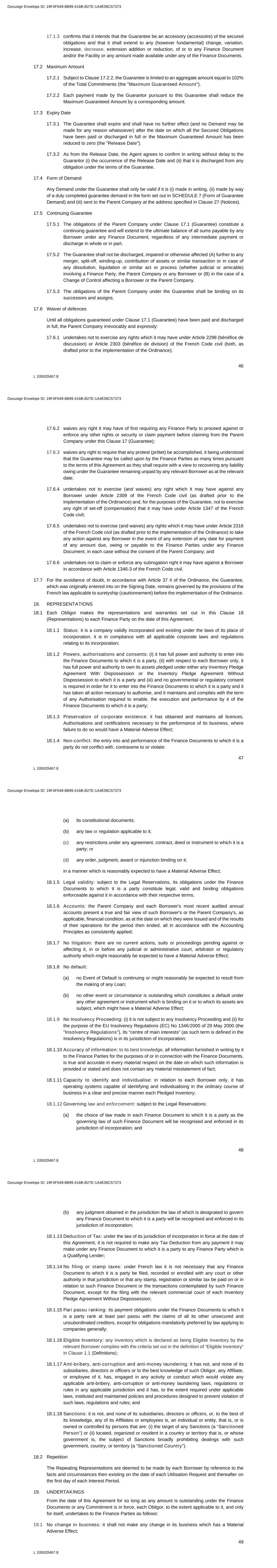 46 L 105020467.8 17.1.3 confirms that it intends that the Guarantee be an accessory (accessoire) of the secured obligations and that it shall extend to any (however fundamental) change, variation, increase, decrease, extension addition or reduction, of or to any Finance Document and/or the Facility or any amount made available under any of the Finance Documents. 17.2 Maximum Amount 17.2.1 Subject to Clause 17.2.2, the Guarantee is limited to an aggregate amount equal to 102% of the Total Commitments (the "Maximum Guaranteed Amount"). 17.2.2 Each payment made by the Guarantor pursuant to this Guarantee shall reduce the Maximum Guaranteed Amount by a corresponding amount. 17.3 Expiry Date 17.3.1 The Guarantee shall expire and shall have no further effect (and no Demand may be made for any reason whatsoever) after the date on which all the Secured Obligations have been paid or discharged in full or the Maximum Guaranteed Amount has been reduced to zero (the "Release Date"). 17.3.2 As from the Release Date, the Agent agrees to confirm in writing without delay to the Guarantor (i) the occurrence of the Release Date and (ii) that it is discharged from any obligation under the terms of the Guarantee. 17.4 Form of Demand Any Demand under the Guarantee shall only be valid if it is (i) made in writing, (ii) made by way of a duly completed guarantee demand in the form set out in SCHEDULE 7 (Form of Guarantee Demand) and (iii) sent to the Parent Company at the address specified in Clause 27 (Notices). 17.5 Continuing Guarantee 17.5.1 The obligations of the Parent Company under Clause 17.1 (Guarantee) constitute a continuing guarantee and will extend to the ultimate balance of all sums payable by any Borrower under any Finance Document, regardless of any intermediate payment or discharge in whole or in part. 17.5.2 The Guarantee shall not be discharged, impaired or otherwise affected (A) further to any merger, split-off, winding-up, contribution of assets or similar transaction or in case of any dissolution, liquidation or similar act or process (whether judicial or amicable) involving a Finance Party, the Parent Company or any Borrower or (B) in the case of a Change of Control affecting a Borrower or the Parent Company. 17.5.3 The obligations of the Parent Company under the Guarantee shall be binding on its successors and assigns. 17.6 Waiver of defences Until all obligations guaranteed under Clause 17.1 (Guarantee) have been paid and discharged in full, the Parent Company irrevocably and expressly: 17.6.1 undertakes not to exercise any rights which it may have under Article 2298 (bénéfice de discussion) or Article 2303 (bénéfice de division) of the French Code civil (both, as drafted prior to the implementation of the Ordinance); Docusign Envelope ID: 19F4F049-8B99-416B-B27E-1A4E06C57373 47 L 105020467.8 17.6.2 waives any right it may have of first requiring any Finance Party to proceed against or enforce any other rights or security or claim payment before claiming from the Parent Company under this Clause 17 (Guarantee); 17.6.3 waives any right to require that any protest (prôtet) be accomplished, it being understood that the Guarantee may be called upon by the Finance Parties as many times pursuant to the terms of this Agreement as they shall require with a view to recovering any liability owing under the Guarantee remaining unpaid by any relevant Borrower as at the relevant date; 17.6.4 undertakes not to exercise (and waives) any right which it may have against any Borrower under Article 2309 of the French Code civil (as drafted prior to the implementation of the Ordinance) and, for the purposes of the Guarantee, not to exercise any right of set-off (compensation) that it may have under Article 1347 of the French Code civil; 17.6.5 undertakes not to exercise (and waives) any rights which it may have under Article 2316 of the French Code civil (as drafted prior to the implementation of the Ordinance) to take any action against any Borrower in the event of any extension of any date for payment of any amount due, owing or payable to the Finance Parties under any Finance Document, in each case without the consent of the Parent Company; and 17.6.6 undertakes not to claim or enforce any subrogation right it may have against a Borrower in accordance with Article 1346-3 of the French Code civil. 17.7 For the avoidance of doubt, in accordance with Article 37 II of the Ordinance, the Guarantee, which was originally entered into on the Signing Date, remains governed by the provisions of the French law applicable to suretyship (cautionnement) before the implementation of the Ordinance. 18. REPRESENTATIONS 18.1 Each Obligor makes the representations and warranties set out in this Clause 18 (Representations) to each Finance Party on the date of this Agreement. 18.1.1 Status: it is a company validly incorporated and existing under the laws of its place of incorporation, it is in compliance with all applicable corporate laws and regulations relating to its incorporation; 18.1.2 Powers, authorisations and consents: (i) it has full power and authority to enter into the Finance Documents to which it is a party, (ii) with respect to each Borrower only, it has full power and authority to own its assets pledged under either any Inventory Pledge Agreement With Dispossession or the Inventory Pledge Agreement Without Dispossession to which it is a party and (iii) and no governmental or regulatory consent is required in order for it to enter into the Finance Documents to which it is a party and it has taken all action necessary to authorise, and it maintains and complies with the term of any Authorisation required to enable, the execution and performance by it of the Finance Documents to which it is a party; 18.1.3 Preservation of corporate existence: it has obtained and maintains all licences, Authorisations and certifications necessary to the performance of its business, where failure to do so would have a Materi