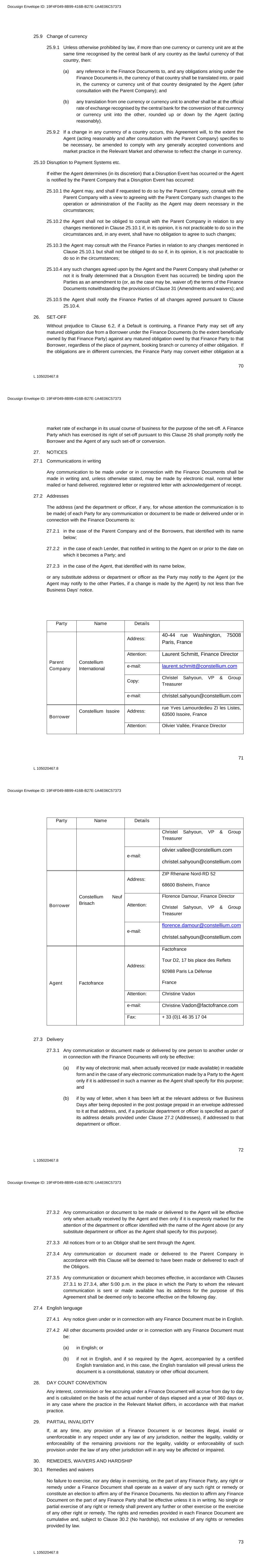70 L 105020467.8 25.9 Change of currency 25.9.1 Unless otherwise prohibited by law, if more than one currency or currency unit are at the same time recognised by the central bank of any country as the lawful currency of that country, then: (a) any reference in the Finance Documents to, and any obligations arising under the Finance Documents in, the currency of that country shall be translated into, or paid in, the currency or currency unit of that country designated by the Agent (after consultation with the Parent Company); and (b) any translation from one currency or currency unit to another shall be at the official rate of exchange recognised by the central bank for the conversion of that currency or currency unit into the other, rounded up or down by the Agent (acting reasonably). 25.9.2 If a change in any currency of a country occurs, this Agreement will, to the extent the Agent (acting reasonably and after consultation with the Parent Company) specifies to be necessary, be amended to comply with any generally accepted conventions and market practice in the Relevant Market and otherwise to reflect the change in currency. 25.10 Disruption to Payment Systems etc. If either the Agent determines (in its discretion) that a Disruption Event has occurred or the Agent is notified by the Parent Company that a Disruption Event has occurred: 25.10.1 the Agent may, and shall if requested to do so by the Parent Company, consult with the Parent Company with a view to agreeing with the Parent Company such changes to the operation or administration of the Facility as the Agent may deem necessary in the circumstances; 25.10.2 the Agent shall not be obliged to consult with the Parent Company in relation to any changes mentioned in Clause 25.10.1 if, in its opinion, it is not practicable to do so in the circumstances and, in any event, shall have no obligation to agree to such changes; 25.10.3 the Agent may consult with the Finance Parties in relation to any changes mentioned in Clause 25.10.1 but shall not be obliged to do so if, in its opinion, it is not practicable to do so in the circumstances; 25.10.4 any such changes agreed upon by the Agent and the Parent Company shall (whether or not it is finally determined that a Disruption Event has occurred) be binding upon the Parties as an amendment to (or, as the case may be, waiver of) the terms of the Finance Documents notwithstanding the provisions of Clause 31 (Amendments and waivers); and 25.10.5 the Agent shall notify the Finance Parties of all changes agreed pursuant to Clause 25.10.4. 26. SET-OFF Without prejudice to Clause 6.2, if a Default is continuing, a Finance Party may set off any matured obligation due from a Borrower under the Finance Documents (to the extent beneficially owned by that Finance Party) against any matured obligation owed by that Finance Party to that Borrower, regardless of the place of payment, booking branch or currency of either obligation. If the obligations are in different currencies, the Finance Party may convert either obligation at a Docusign Envelope ID: 19F4F049-8B99-416B-B27E-1A4E06C57373 71 L 105020467.8 market rate of exchange in its usual course of business for the purpose of the set-off. A Finance Party which has exercised its right of set-off pursuant to this Clause 26 shall promptly notify the Borrower and the Agent of any such set-off or conversion. 27. NOTICES 27.1 Communications in writing Any communication to be made under or in connection with the Finance Documents shall be made in writing and, unless otherwise stated, may be made by electronic mail, normal letter mailed or hand delivered, registered letter or registered letter with acknowledgement of receipt. 27.2 Addresses The address (and the department or officer, if any, for whose attention the communication is to be made) of each Party for any communication or document to be made or delivered under or in connection with the Finance Documents is: 27.2.1 in the case of the Parent Company and of the Borrowers, that identified with its name below; 27.2.2 in the case of each Lender, that notified in writing to the Agent on or prior to the date on which it becomes a Party; and 27.2.3 in the case of the Agent, that identified with its name below, or any substitute address or department or officer as the Party may notify to the Agent (or the Agent may notify to the other Parties, if a change is made by the Agent) by not less than five Business Days' notice. Party Name Details Parent Company Constellium International Address: 40-44 rue Washington, 75008 Paris, France Attention: Laurent Schmitt, Finance Director e-mail: laurent.schmitt@constellium.com Copy: Christel Sahyoun, VP & Group Treasurer e-mail: christel.sahyoun@constellium.com Borrower Constellium Issoire Address: rue Yves Lamourdedieu ZI les Listes, 63500 Issoire, France Attention: Olivier Vallée, Finance Director Docusign Envelope ID: 19F4F049-8B99-416B-B27E-1A4E06C57373 72 L 105020467.8 Party Name Details Christel Sahyoun, VP & Group Treasurer e-mail: olivier.vallee@constellium.com christel.sahyoun@constellium.com Borrower Constellium Neuf Brisach Address: ZIP Rhenane Nord-RD 52 68600 Bisheim, France Attention: Florence Damour, Finance Director Christel Sahyoun, VP & Group Treasurer e-mail: florence.damour@constellium.com christel.sahyoun@constellium.com Agent Factofrance Address: Factofrance Tour D2, 17 bis place des Reflets 92988 Paris La Défense France Attention: Christine Vadon e-mail: Christine.Vadon@factofrance.com Fax: + 33 (0)1 46 35 17 04 27.3 Delivery 27.3.1 Any communication or document made or delivered by one person to another under or in connection with the Finance Documents will only be effective: (a) if by way of electronic mail, when actually received (or made available) in readable form and in the case of any electronic communication made by a Party to the Agent only if it is addressed in such a manner as the Agent shall specify for this purpose; and (b) if by way of lette