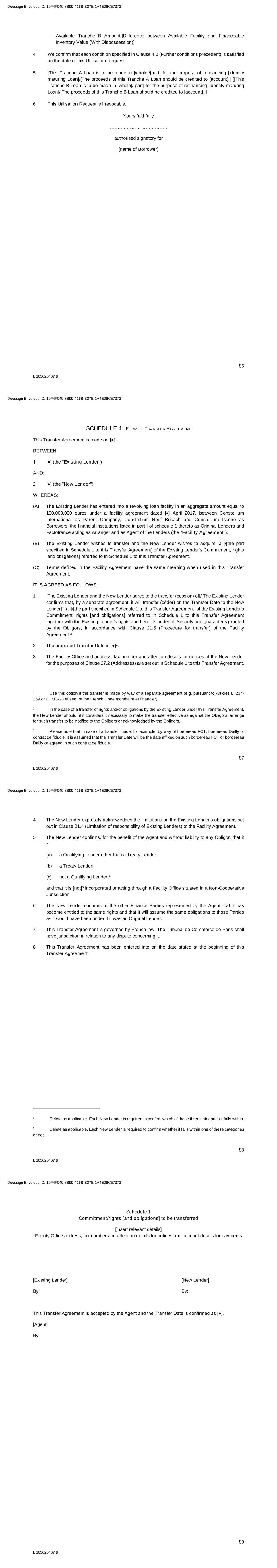 86 L 105020467.8 - Available Tranche B Amount:[Difference between Available Facility and Financeable Inventory Value (With Dispossession)] 4. We confirm that each condition specified in Clause 4.2 (Further conditions precedent) is satisfied on the date of this Utilisation Request. 5. [This Tranche A Loan is to be made in [whole]/[part] for the purpose of refinancing [identify maturing Loan]/[The proceeds of this Tranche A Loan should be credited to [account].] [[This Tranche B Loan is to be made in [whole]/[part] for the purpose of refinancing [identify maturing Loan]/[The proceeds of this Tranche B Loan should be credited to [account].]] 6. This Utilisation Request is irrevocable. Yours faithfully ………………………………… authorised signatory for [name of Borrower] Docusign Envelope ID: 19F4F049-8B99-416B-B27E-1A4E06C57373 87 L 105020467.8 SCHEDULE 4. FORM OF TRANSFER AGREEMENT This Transfer Agreement is made on [●] BETWEEN: 1. [●] (the "Existing Lender") AND: 2. [●] (the "New Lender") WHEREAS: (A) The Existing Lender has entered into a revolving loan facility in an aggregate amount equal to 100,000,000 euros under a facility agreement dated [] April 2017, between Constellium International as Parent Company, Constellium Neuf Brisach and Constellium Issoire as Borrowers, the financial institutions listed in part I of schedule 1 thereto as Original Lenders and Factofrance acting as Arranger and as Agent of the Lenders (the "Facility Agreement"). (B) The Existing Lender wishes to transfer and the New Lender wishes to acquire [all]/[the part specified in Schedule 1 to this Transfer Agreement] of the Existing Lender's Commitment, rights [and obligations] referred to in Schedule 1 to this Transfer Agreement. (C) Terms defined in the Facility Agreement have the same meaning when used in this Transfer Agreement. IT IS AGREED AS FOLLOWS: 1. [The Existing Lender and the New Lender agree to the transfer (cession) of]/[The Existing Lender confirms that, by a separate agreement, it will transfer (céder) on the Transfer Date to the New Lender]1 [all]/[the part specified in Schedule 1 to this Transfer Agreement] of the Existing Lender's Commitment, rights [and obligations] referred to in Schedule 1 to this Transfer Agreement together with the Existing Lender's rights and benefits under all Security and guarantees granted by the Obligors, in accordance with Clause 21.5 (Procedure for transfer) of the Facility Agreement.2 2. The proposed Transfer Date is [●]3. 3. The Facility Office and address, fax number and attention details for notices of the New Lender for the purposes of Clause 27.2 (Addresses) are set out in Schedule 1 to this Transfer Agreement. 1 Use this option if the transfer is made by way of a separate agreement (e.g. pursuant to Articles L. 214- 169 or L. 313-23 et seq. of the French Code monétaire et financier). 2 In the case of a transfer of rights and/or obligations by the Existing Lender under this Transfer Agreement, the New Lender should, if it considers it necessary to make the transfer effective as against the Obligors, arrange for such transfer to be notified to the Obligors or acknowledged by the Obligors. 3 Please note that in case of a transfer made, for example, by way of bordereau FCT, bordereau Dailly or contrat de fiducie, it is assumed that the Transfer Date will be the date affixed on such bordereau FCT or bordereau Dailly or agreed in such contrat de fiducie. Docusign Envelope ID: 19F4F049-8B99-416B-B27E-1A4E06C57373 88 L 105020467.8 4. The New Lender expressly acknowledges the limitations on the Existing Lender's obligations set out in Clause 21.4 (Limitation of responsibility of Existing Lenders) of the Facility Agreement. 5. The New Lender confirms, for the benefit of the Agent and without liability to any Obligor, that it is: (a) a Qualifying Lender other than a Treaty Lender; (b) a Treaty Lender; (c) not a Qualifying Lender,4 and that it is [not]5 incorporated or acting through a Facility Office situated in a Non-Cooperative Jurisdiction. 6. The New Lender confirms to the other Finance Parties represented by the Agent that it has become entitled to the same rights and that it will assume the same obligations to those Parties as it would have been under if it was an Original Lender. 7. This Transfer Agreement is governed by French law. The Tribunal de Commerce de Paris shall have jurisdiction in relation to any dispute concerning it. 8. This Transfer Agreement has been entered into on the date stated at the beginning of this Transfer Agreement. 4 Delete as applicable. Each New Lender is required to confirm which of these three categories it falls within. 5 Delete as applicable. Each New Lender is required to confirm whether it falls within one of these categories or not. Docusign Envelope ID: 19F4F049-8B99-416B-B27E-1A4E06C57373 89 L 105020467.8 Schedule 1 Commitment/rights [and obligations] to be transferred [insert relevant details] [Facility Office address, fax number and attention details for notices and account details for payments] [Existing Lender] [New Lender] By: By: This Transfer Agreement is accepted by the Agent and the Transfer Date is confirmed as [●]. [Agent] By: Docusign Envelope ID: 19F4F049-8B99-416B-B27E-1A4E06C57373