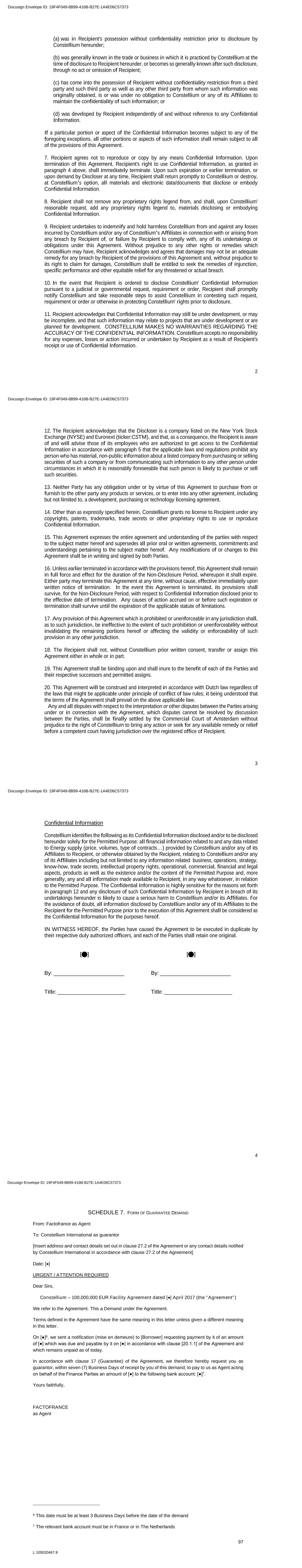 90 L 105020467.8 SCHEDULE 5. FORM OF TEG LETTER [On the letterhead of the Agent] From: Factofrance as Agent To: [Borrower] Date: [] Dear Sirs, Constellium – 100,000,000 EUR Facility Agreement dated [] (the "Agreement") We refer to the Agreement. This is the letter setting out the applicable effective global rate (taux effectif global) referred to in the Agreement. Terms defined in the Agreement have the same meaning in this letter unless given a different meaning in this letter. The effective global rate (taux effectif global) calculated on or about the date of this Agreement on the basis of a 365-day year is for an Interest Period of one month and at EURIBOR rate of [] per cent. per annum, [] per cent. (which corresponds to a taux de période of [] per cent. for a durée de période of one month). The above rates: (a) are given in order to comply with the provisions of Articles L.314-1 to L.314-5 and R.314-1 et seq. of the French Code de la consommation and Article L.313-4 of the French Code Monétaire et Financier and for information only; (b) are calculated on the basis that: (i) drawdown for the full amount of the Facility has been made in Euro on []; (ii) the EURIBOR rate, expressed as an annual rate, is as fixed on []; (iii) the Margin is []% per annum; and (c) take into account the various fees, costs and expenses payable by you under this Agreement, on the assumption that these fees, costs and expenses will be maintained at their original level throughout the term of this Agreement. This letter is designated a Finance Document. Please confirm your acceptance of the terms of this letter by signing and returning to us the enclosed copy. Yours faithfully, FACTOFRANCE as Agent Docusign Envelope ID: 19F4F049-8B99-416B-B27E-1A4E06C57373 91 L 105020467.8 We agree to the above [] as Borrower Docusign Envelope ID: 19F4F049-8B99-416B-B27E-1A4E06C57373 92 L 105020467.8 SCHEDULE 6. FORM OF CONFIDENTIALITY UNDERTAKING Docusign Envelope ID: 19F4F049-8B99-416B-B27E-1A4E06C57373 NON-DISCLOSURE AGREEMENT This agreement (the "Agreement"), made on 2017 (the "Effective Date") by and between [] (hereinafter referred to as "Constellium" or "Discloser"), on the one hand, and [•]a company organized and existing under the laws of [], having its registered office at , registered in the Trade and Companies Registry of under number (hereinafter referred to as "Recipient"), on the other hand, sets forth the terms and conditions of the confidential disclosure of certain information between Constellium and Recipient (hereinafter referred to each as a "Party" and together as the "Parties"). Preamble Constellium is a supplier of the Recipient for automotive aluminium products who is considering to expand its activity located at Biesheim (France) ( hereafter the Project) Therefore Constellium would like to discuss and provide the recipient with Confidential Inf(hereafter the “Permitted Purpose”). The Parties agree as follows: 1. "Affiliate" means, with respect to Constellium, any company directly or indirectly controlled by its parent company “Constellium N.V”, (it being understood that, for the purposes hereof, the term "control" means). a corporation that is related to either party by 50% or more equity ownership, whether as parent, subsidiary, common percentage or some other direct or indirect ownership.) 2. "Confidential Information" means the information described at the end of this Agreement, which is disclosed to the Recipient by Constellium in any manner, whether orally, visually or in tangible form (including, without limitation, documents, specifications, analyses devices and computer readable media) and all copies thereof. 3. Except as expressly permitted herein, for a period of ten (10) years from the Effective Date (the "Non-Disclosure Period"), Recipient shall maintain in strict confidence and not disclose or use any Confidential Information. 4. Recipient shall have the right to use Confidential Information disclosed by Discloser solely for the Permitted Purpose. 5. Recipient shall disclose Confidential Information solely to the employees of the Recipient who have a need to know such information for the Permitted Purpose. Recipient shall take all such action as shall be necessary or desirable in order to ensure that each of such person(s) maintain the confidentiality of any Confidential Information that is so disclosed. 6. Confidential Information shall not include any information that Recipient can demonstrate: 1 Docusign Envelope ID: 19F4F049-8B99-416B-B27E-1A4E06C57373