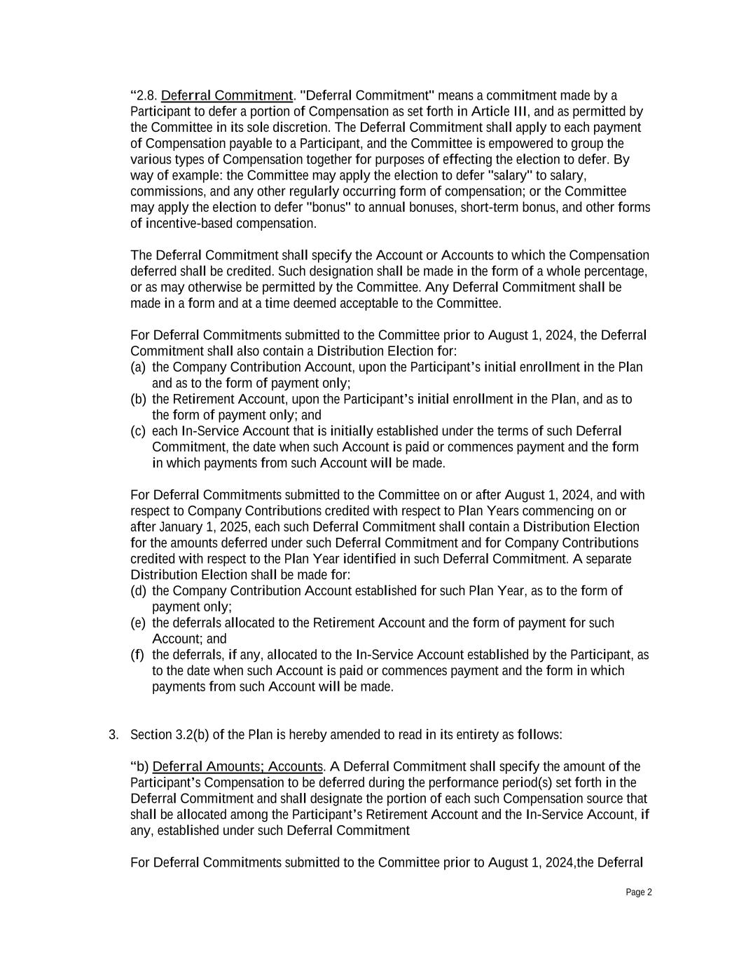 Page 2 “2.8. Deferral Commitment. "Deferral Commitment" means a commitment made by a Participant to defer a portion of Compensation as set forth in Article III, and as permitted by the Committee in its sole discretion. The Deferral Commitment shall apply to each payment of Compensation payable to a Participant, and the Committee is empowered to group the various types of Compensation together for purposes of effecting the election to defer. By way of example: the Committee may apply the election to defer "salary" to salary, commissions, and any other regularly occurring form of compensation; or the Committee may apply the election to defer "bonus" to annual bonuses, short-term bonus, and other forms of incentive-based compensation. The Deferral Commitment shall specify the Account or Accounts to which the Compensation deferred shall be credited. Such designation shall be made in the form of a whole percentage, or as may otherwise be permitted by the Committee. Any Deferral Commitment shall be made in a form and at a time deemed acceptable to the Committee. For Deferral Commitments submitted to the Committee prior to August 1, 2024, the Deferral Commitment shall also contain a Distribution Election for: (a) the Company Contribution Account, upon the Participant’s initial enrollment in the Plan and as to the form of payment only; (b) the Retirement Account, upon the Participant’s initial enrollment in the Plan, and as to the form of payment only; and (c) each In-Service Account that is initially established under the terms of such Deferral Commitment, the date when such Account is paid or commences payment and the form in which payments from such Account will be made. For Deferral Commitments submitted to the Committee on or after August 1, 2024, and with respect to Company Contributions credited with respect to Plan Years commencing on or after January 1, 2025, each such Deferral Commitment shall contain a Distribution Election for the amounts deferred under such Deferral Commitment and for Company Contributions credited with respect to the Plan Year identified in such Deferral Commitment. A separate Distribution Election shall be made for: (d) the Company Contribution Account established for such Plan Year, as to the form of payment only; (e) the deferrals allocated to the Retirement Account and the form of payment for such Account; and (f) the deferrals, if any, allocated to the In-Service Account established by the Participant, as to the date when such Account is paid or commences payment and the form in which payments from such Account will be made. 3. Section 3.2(b) of the Plan is hereby amended to read in its entirety as follows: “b) Deferral Amounts; Accounts. A Deferral Commitment shall specify the amount of the Participant’s Compensation to be deferred during the performance period(s) set forth in the Deferral Commitment and shall designate the portion of each such Compensation source that shall be allocated among the Participant’s Retirement Account and the In-Service Account, if any, established under such Deferral Commitment For Deferral Commitments submitted to the Committee prior to August 1, 2024,the Deferral