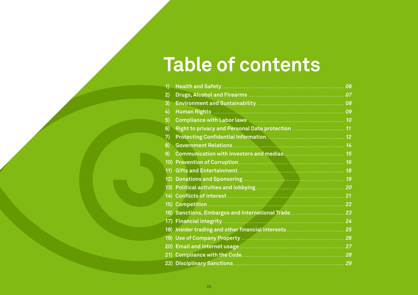 Table of contents 1) Health and Safety . . . . . . . . . . . . . . . . . . . . . . . . . . . . . . . . . . . . . . . . . . . . . . . . . . . . . . . . . . . . . . . . . . . . . . 06 2) Drugs, Alcohol and Firearms . . . . . . . . . . . . . . . . . . . . . . . . . . . . . . . . . . . . . . . . . . . . . . . . . . . . . . . 07 3) Environment and Sustainability . . . . . . . . . . . . . . . . . . . . . . . . . . . . . . . . . . . . . . . . . . . . . . . . . . 08 4) Human Rights . . . . . . . . . . . . . . . . . . . . . . . . . . . . . . . . . . . . . . . . . . . . . . . . . . . . . . . . . . . . . . . . . . . . . . . . . . . 09 5) Compliance with Labor laws . . . . . . . . . . . . . . . . . . . . . . . . . . . . . . . . . . . . . . . . . . . . . . . . . . . . . . . 10 6) Right to privacy and Personal Data protection . . . . . . . . . . . . . . . . . . . . . . . . . . . . . . 11 7) Protecting Confidential Information . . . . . . . . . . . . . . . . . . . . . . . . . . . . . . . . . . . . . . . . . . . . . 12 8) Government Relations . . . . . . . . . . . . . . . . . . . . . . . . . . . . . . . . . . . . . . . . . . . . . . . . . . . . . . . . . . . . . . . . 14 9) Communication with investors and medias . . . . . . . . . . . . . . . . . . . . . . . . . . . . . . . . . . . 15 10) Prevention of Corruption . . . . . . . . . . . . . . . . . . . . . . . . . . . . . . . . . . . . . . . . . . . . . . . . . . . . . . . . . . . . . 16 11) Gifts and Entertainment . . . . . . . . . . . . . . . . . . . . . . . . . . . . . . . . . . . . . . . . . . . . . . . . . . . . . . . . . . . . . 18 12) Donations and Sponsoring . . . . . . . . . . . . . . . . . . . . . . . . . . . . . . . . . . . . . . . . . . . . . . . . . . . . . . . . . . 19 13) Political activities and lobbying . . . . . . . . . . . . . . . . . . . . . . . . . . . . . . . . . . . . . . . . . . . . . . . . . . . 20 14) Conflicts of interest . . . . . . . . . . . . . . . . . . . . . . . . . . . . . . . . . . . . . . . . . . . . . . . . . . . . . . . . . . . . . . . . . . . 21 15) Competition . . . . . . . . . . . . . . . . . . . . . . . . . . . . . . . . . . . . . . . . . . . . . . . . . . . . . . . . . . . . . . . . . . . . . . . . . . . . . . 22 16) Sanctions, Embargos and International Trade . . . . . . . . . . . . . . . . . . . . . . . . . . . . . . . 23 17) Financial integrity . . . . . . . . . . . . . . . . . . . . . . . . . . . . . . . . . . . . . . . . . . . . . . . . . . . . . . . . . . . . . . . . . . . . . . 24 18) Insider trading and other financial interests . . . . . . . . . . . . . . . . . . . . . . . . . . . . . . . . . 25 19) Use of Company Property . . . . . . . . . . . . . . . . . . . . . . . . . . . . . . . . . . . . . . . . . . . . . . . . . . . . . . . . . . . 26 20) Email and internet usage . . . . . . . . . . . . . . . . . . . . . . . . . . . . . . . . . . . . . . . . . . . . . . . . . . . . . . . . . . . . 27 21) Compliance with the Code . . . . . . . . . . . . . . . . . . . . . . . . . . . . . . . . . . . . . . . . . . . . . . . . . . . . . . . . . . . 28 22) Disciplinary Sanctions . . . . . . . . . . . . . . . . . . . . . . . . . . . . . . . . . . . . . . . . . . . . . . . . . . . . . . . . . . . . . . . . 29 05