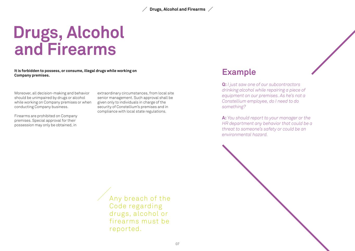 Drugs, Alcohol and Firearms Example Q: I just saw one of our subcontractors drinking alcohol while repairing a piece of equipment on our premises. As he’s not a Constellium employee, do I need to do something? A: You should report to your manager or the HR department any behavior that could be a threat to someone’s safety or could be an environmental hazard. Moreover, all decision-making and behavior should be unimpaired by drugs or alcohol while working on Company premises or when conducting Company business. Firearms are prohibited on Company premises. Special approval for their possession may only be obtained, in extraordinary circumstances, from local site senior management. Such approval shall be given only to individuals in charge of the security of Constellium’s premises and in compliance with local state regulations. Drugs, Alcohol and Firearms Any breach of the Code regarding drugs, alcohol or firearms must be reported. It is forbidden to possess, or consume, illegal drugs while working on Company premises. 07