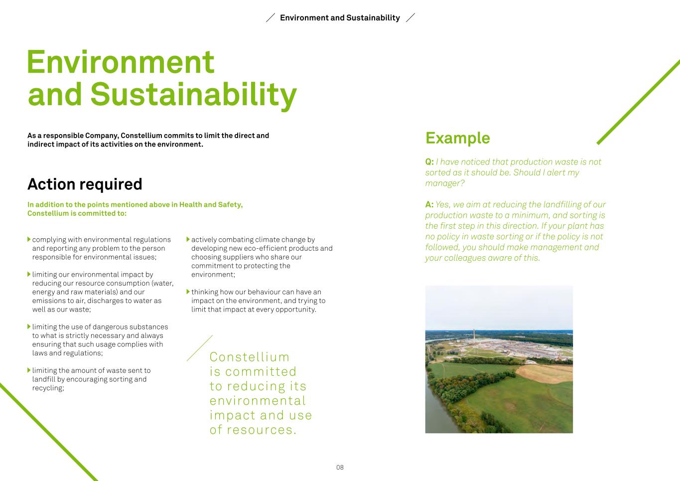 Example Q: I have noticed that production waste is not sorted as it should be. Should I alert my manager? A: Yes, we aim at reducing the landfilling of our production waste to a minimum, and sorting is the first step in this direction. If your plant has no policy in waste sorting or if the policy is not followed, you should make management and your colleagues aware of this. Action required In addition to the points mentioned above in Health and Safety, Constellium is committed to: complying with environmental regulations and reporting any problem to the person responsible for environmental issues; limiting our environmental impact by reducing our resource consumption (water, energy and raw materials) and our emissions to air, discharges to water as well as our waste; limiting the use of dangerous substances to what is strictly necessary and always ensuring that such usage complies with laws and regulations; limiting the amount of waste sent to landfill by encouraging sorting and recycling; actively combating climate change by developing new eco-efficient products and choosing suppliers who share our commitment to protecting the environment; thinking how our behaviour can have an impact on the environment, and trying to limit that impact at every opportunity. Environment and Sustainability Constellium is committed to reducing its environmental impact and use of resources. Environment and Sustainability As a responsible Company, Constellium commits to limit the direct and indirect impact of its activities on the environment. 08