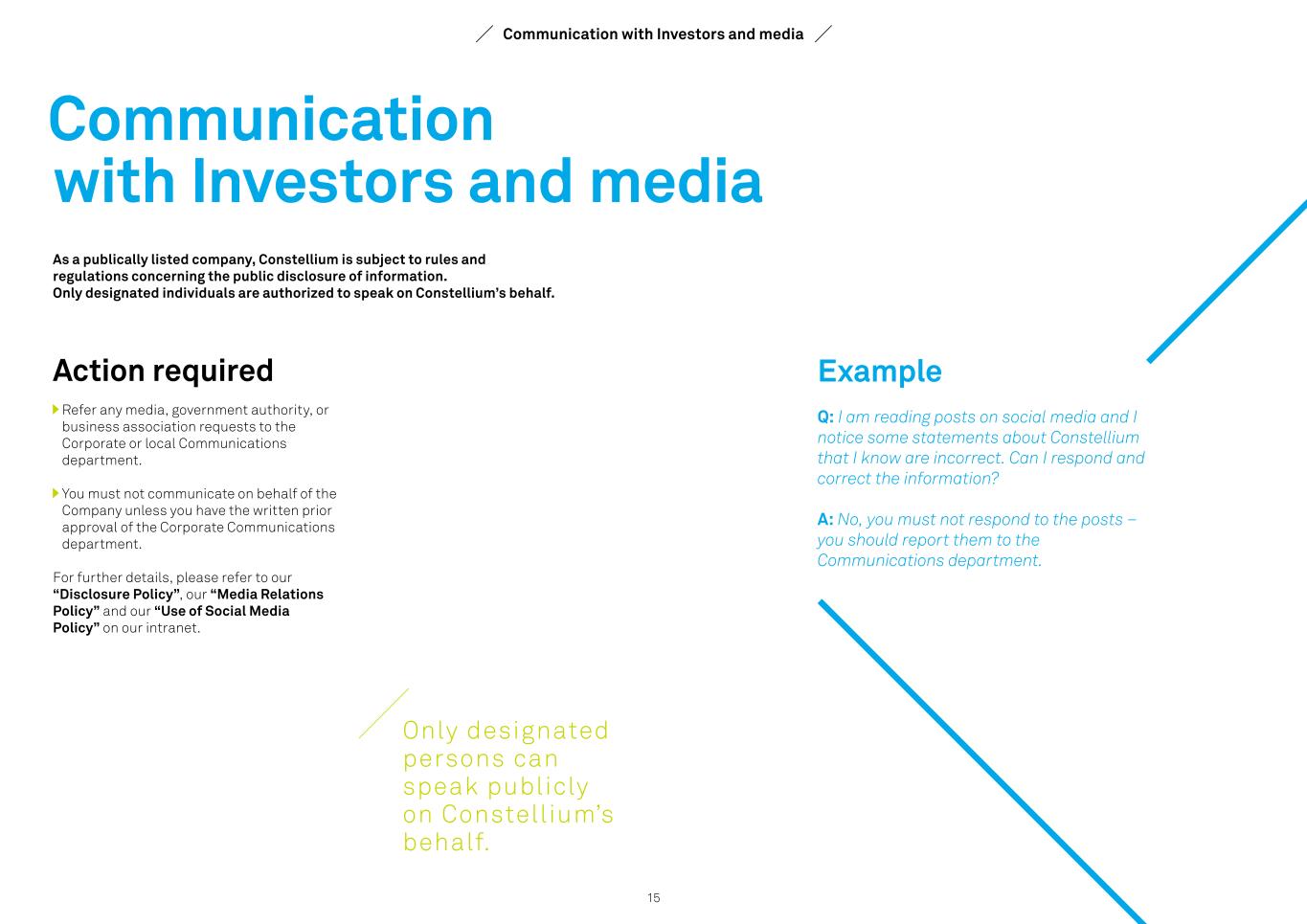 Example Q: I am reading posts on social media and I notice some statements about Constellium that I know are incorrect. Can I respond and correct the information? A: No, you must not respond to the posts – you should report them to the Communications department. Action required Refer any media, government authority, or business association requests to the Corporate or local Communications department. You must not communicate on behalf of the Company unless you have the written prior approval of the Corporate Communications department. For further details, please refer to our “Disclosure Policy”, our “Media Relations Policy” and our “Use of Social Media Policy” on our intranet. Communication with Investors and media Only designated persons can speak publicly on Constellium’s behalf. As a publically listed company, Constellium is subject to rules and regulations concerning the public disclosure of information. Only designated individuals are authorized to speak on Constellium’s behalf. Communication with Investors and media 15