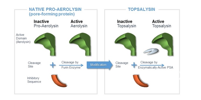 Topsalysin, a genetically modified recombinant protein, is delivered via ultrasound-guided injection directly into the prostate. This membrane-disrupting protein is selectively activated by enzymatically active PSA which is only present in the prostate, leading to localized cell death and tissue disruption without damage to neighboring tissue and nerves. This method of administration limits the circulation of the drug in the body, and we believe that this limited systemic exposure to the drug, together with how the drug is activated in the prostate, greatly diminishes the risk of side effects. We believe that the highly targeted mechanism by which topsalysin selectively destroys prostate tissue in BPH makes topsalysin a potential focal treatment for clinically significant localized prostate cancer.