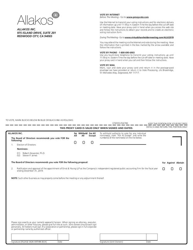 Our board of directors recommends that you vote (i) FOR the election of the respective nominees for Class I directors named in this proxy statement to serve as directors of the Company and (ii) FOR the ratification of the appointment of Ernst & Young LLP as our independent registered public accounting firm for the fiscal year ending December 31, 2019. You will be able to attend the meeting, submit your questions during the meeting, and vote your shares electronically at the meeting by visiting www.virtualshareholdermeeting.com/ALLK2019.