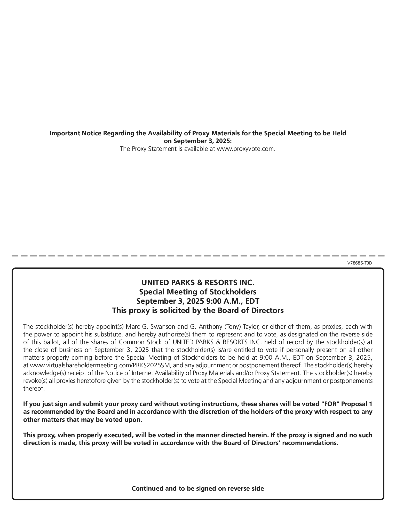 Notice is hereby given that a Special Meeting of Stockholders (the “Special Meeting”) of United Parks & Resorts Inc. (“we”, “us”, “our” or the “Company”) will be held on September 3, 2025 at 9:00 a.m., Eastern Daylight Time. You can attend the Special Meeting online, vote your shares electronically and submit your questions during the Special Meeting by visiting www.virtualshareholdermeeting.com/PRKS2025SM. You will need to have your 16-Digit Control Number included on your Notice or your proxy card (if you received a printed copy of the proxy materials) to join the Special Meeting. The Special Meeting will be held for the following purposes: