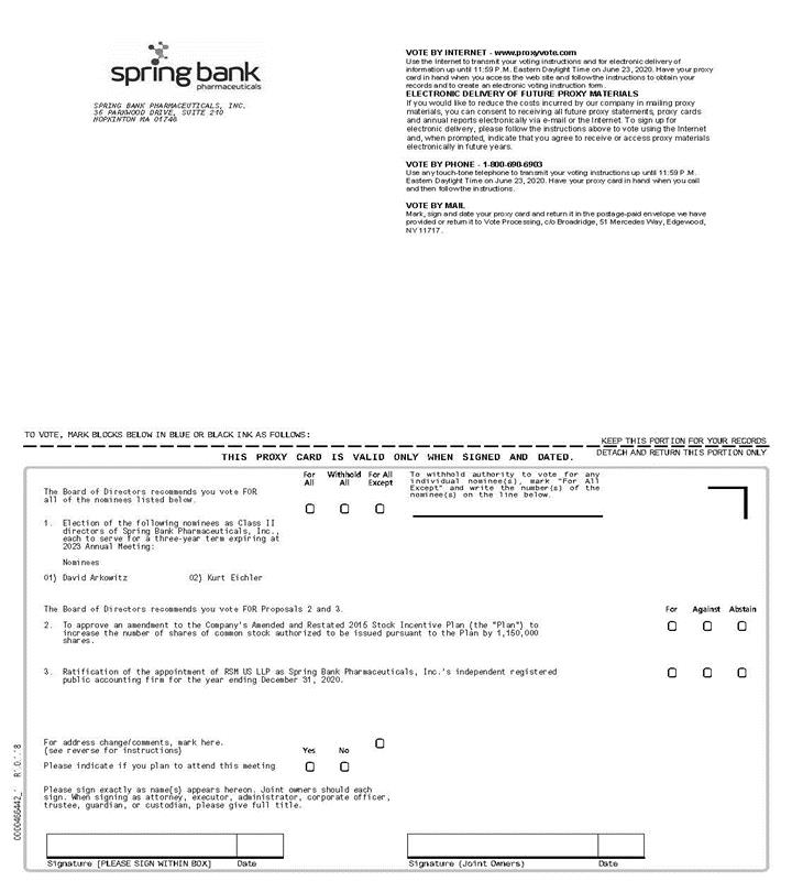SPRING BANK PHARMACEUTICALS, INC. 35 PARKWOOD DRIVE, SUITE 210 HOPKINTON MA 01748 VOTE BY INTERNET - www.proxyvote.com Use the Internet to transmit your voting instructions and for electronic delivery of information up until 11:59 P.M. Eastern Daylight Time on June 23, 2020. Have your proxy card in hand when you access the web site and follow the instructions to obtain your records and to create an electronic voting instruction form. ELECTRONIC DELIVERY OF FUTURE PROXY MATERIALS If you would like to reduce the costs incurred by our company in mailing proxy materials, you can consent to receiving all future proxy statements, proxy cards and annual reports electronically via e-mail or the Internet. To sign up for electronic delivery, please follow the instructions above to vote using the Internet and, when prompted, indicate that you agree to receive or access proxy materials electronically in future years. VOTE BY PHONE - 1-800-690-6903 Use any touch-tone telephone to transmit your voting instructions up until 11:59 P.M. Eastern Daylight Time on June 23, 2020. Have your proxy card in hand when you call and then follow the instructions. VOTE BY MAIL Mark, sign and date your proxy card and return it in the postage-paid envelope we have provided or return it to Vote Processing, c/o Broadridge, 51 Mercedes Way, Edgewood, NY 11717. The Board of Directors recommends you vote FOR Proposals 2 and 3. For Against Abstain 2. To approve an amendment to the Company's Amended and Restated 2015 Stock Incentive Plan (the "Plan") to increase the number of shares of common stock authorized to be issued pursuant to the Plan by 1,150,000 shares. 3. Ratification of the appointment of RSM US LLP as Spring Bank Pharmaceuticals, Inc.'s independent registered public accounting firm for the year ending December 31, 2020. Please sign exactly as name(s) appears hereon. Joint owners should each sign. When signing as attorney, executor, administrator, corporate officer, trustee, guardian, or custodian, please give full title. For address change/comments, mark here. (see reverse for instructions) Yes No Please indicate if you plan to attend this meeting