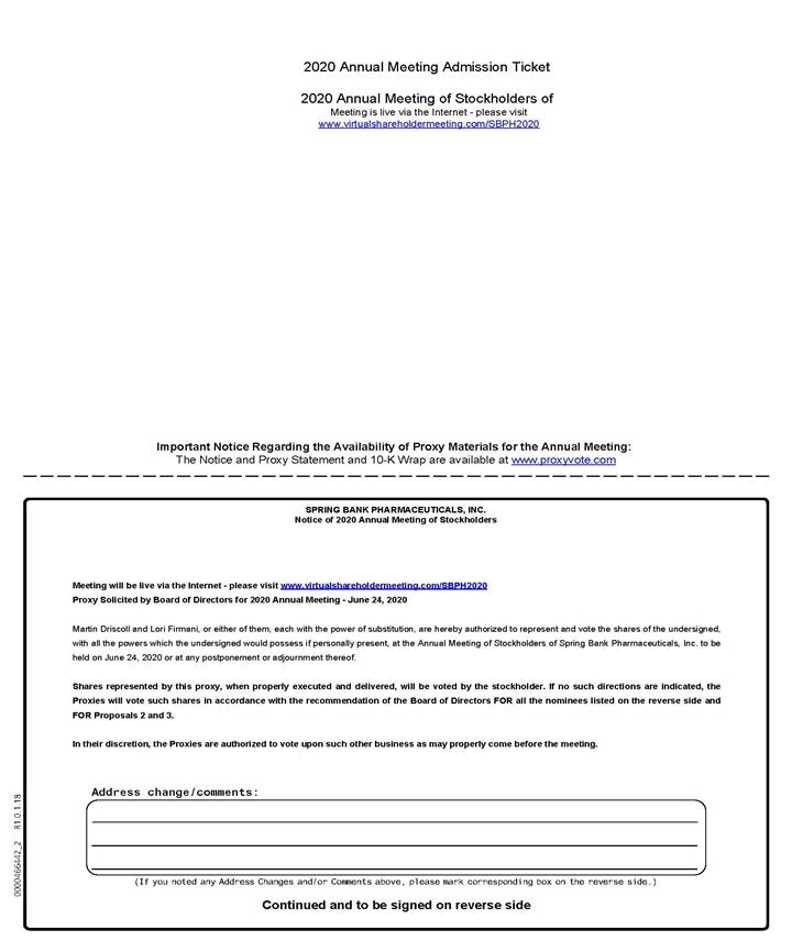 0000466442_2 R1.0.1.18 2020 Annual Meeting Admission Ticket 2020 Annual Meeting of Stockholders of Meeting is live via the Internet - please visit www.virtualshareholdermeeting.com/SBPH2020 Important Notice Regarding the Availability of Proxy Materials for the Annual Meeting: The Notice and Proxy Statement and 10-K Wrap are available at www.proxyvote.com SPRING BANK PHARMACEUTICALS, INC. Notice of 2020 Annual Meeting of Stockholders Meeting will be live via the Internet - please visit www.virtualshareholdermeeting.com/SBPH2020 Proxy Solicited by Board of Directors for 2020 Annual Meeting - June 24, 2020 Martin Driscoll and Lori Firmani, or either of them, each with the power of substitution, are hereby authorized to represent and vote the shares of the undersigned, with all the powers which the undersigned would possess if personally present, at the Annual Meeting of Stockholders of Spring Bank Pharmaceuticals, Inc. to be held on June 24, 2020 or at any postponement or adjournment thereof. Shares represented by this proxy, when properly executed and delivered, will be voted by the stockholder. If no such directions are indicated, the Proxies will vote such shares in accordance with the recommendation of the Board of Directors FOR all the nominees listed on the reverse side and FOR Proposals 2 and 3. In their discretion, the Proxies are authorized to vote upon such other business as may properly come before the meeting. (If you noted any Address Changes and/or Comments above, please mark corresponding box on the reverse side.) Address change/comments: Continued and to be signed on reverse side